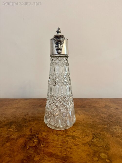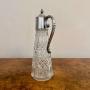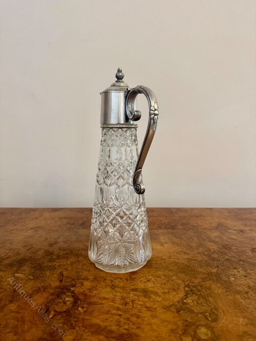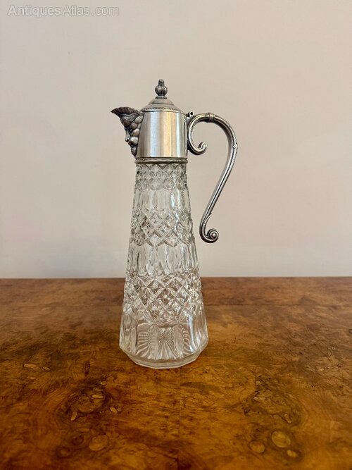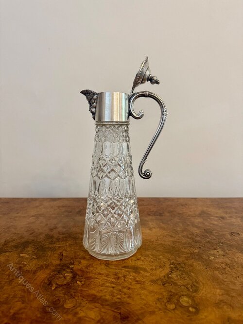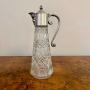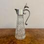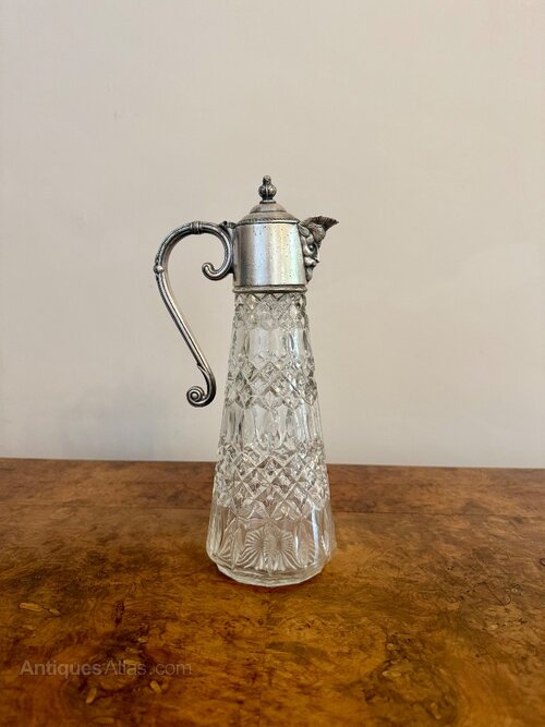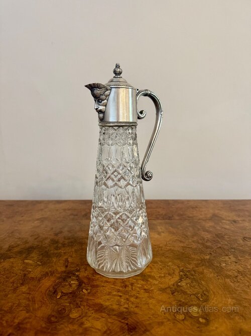 Wonderful quality antique Edwardian claret jug having a stunning silver plated and cut glass claret jug, with a shaped handle to the back and figural spout above a cut glass body.