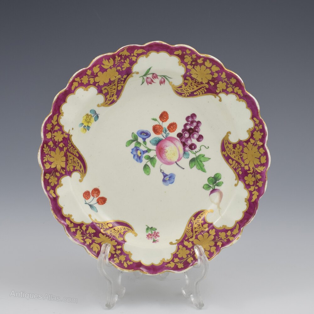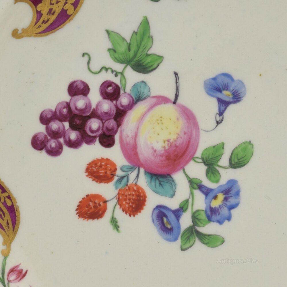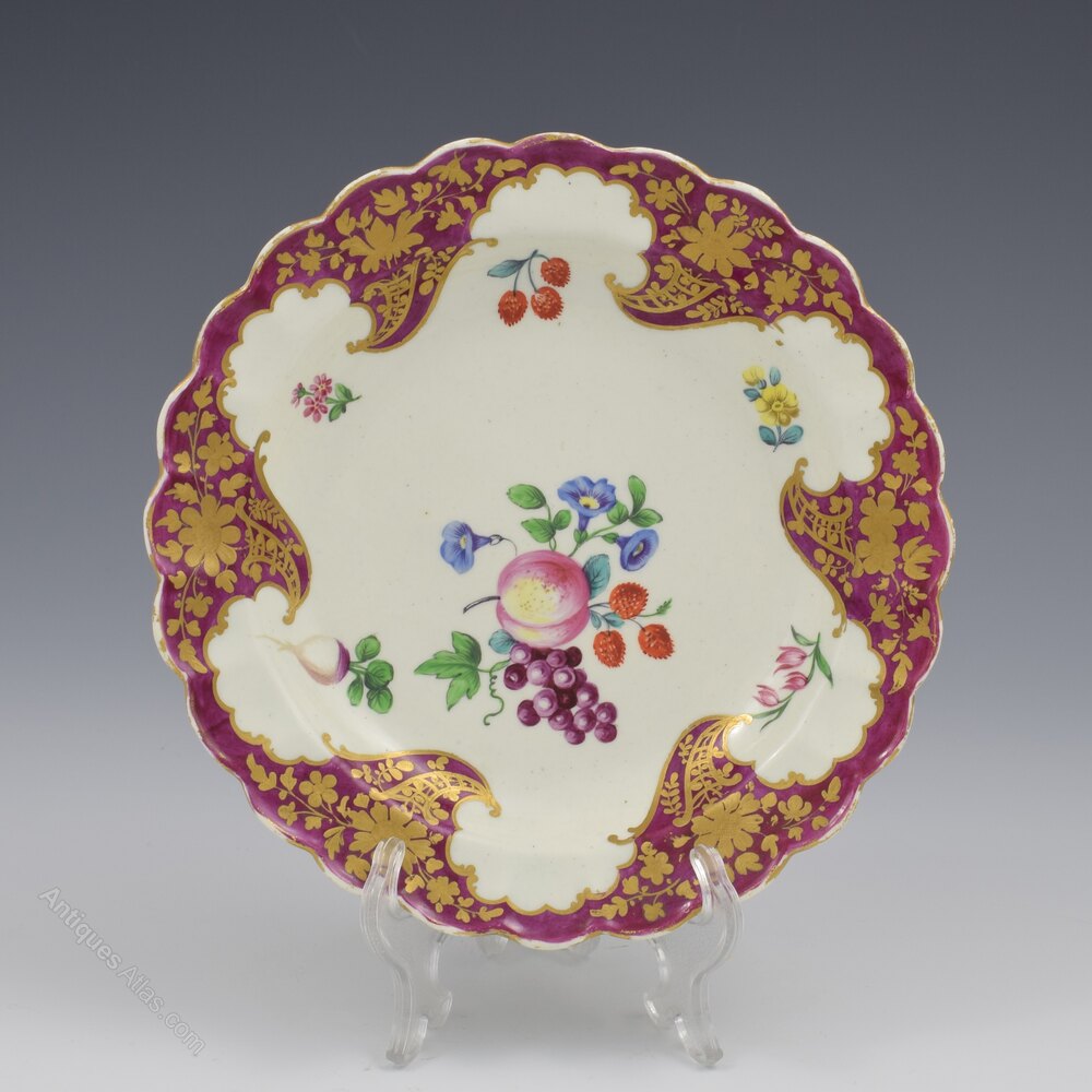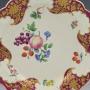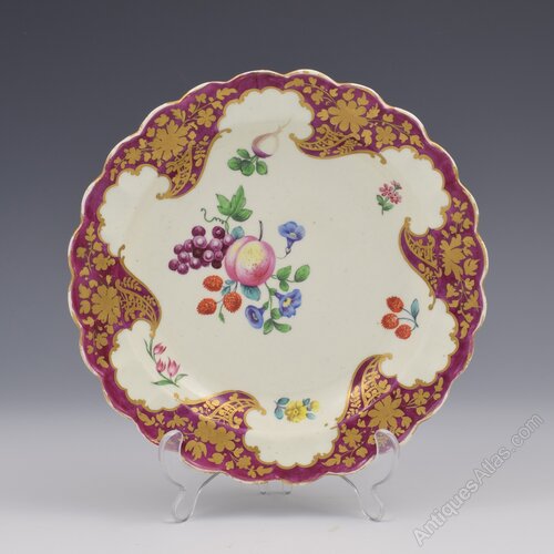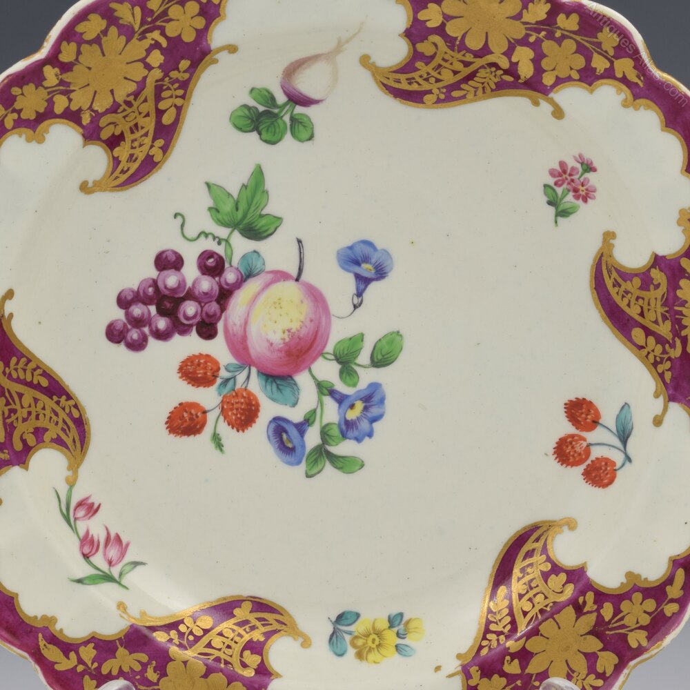 A stunning small Worcester porcelain scalloped dessert plate painted in the Hope Edwardes pattern with a glorious cornucopia shaped claret ground overlaid with fine ciselé raised gilding. The central reserve has a large main arrangement of peach, grapes, red berries and morning glory flowers and scattered around are floral and berry sprigs and a small radish. Decorated in the atelier of James Giles, c.1770.