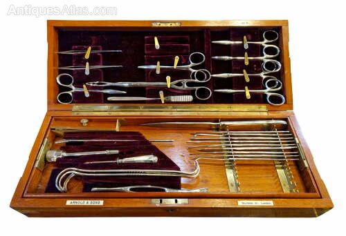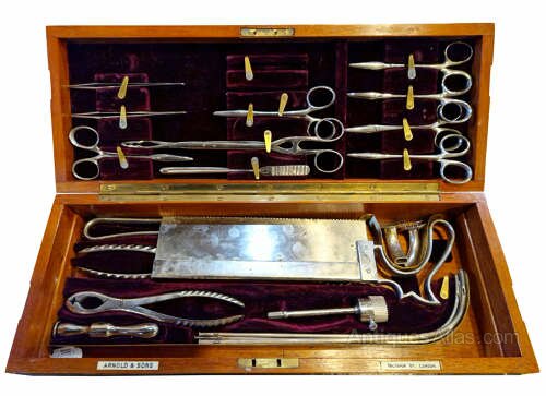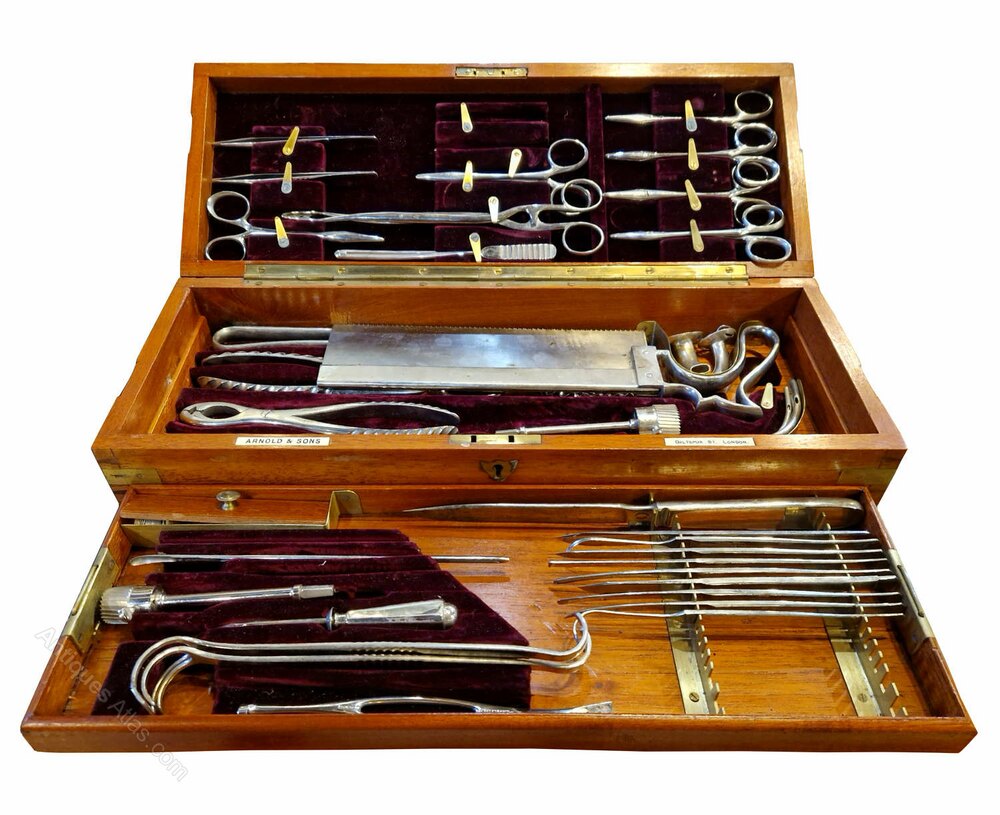 A superb World War I Field Surgeons operating kit by Arnold & Son, Gilt Spur Street London, Dated 1916 retaining its original outer tin protective Box. Some scalpels missing.