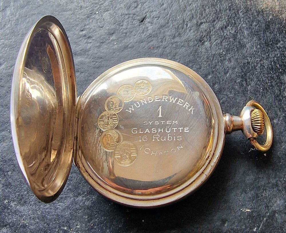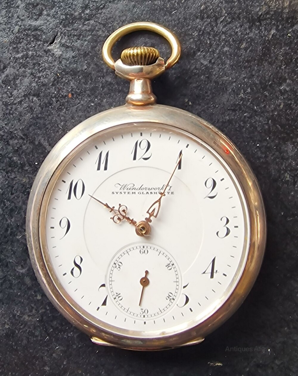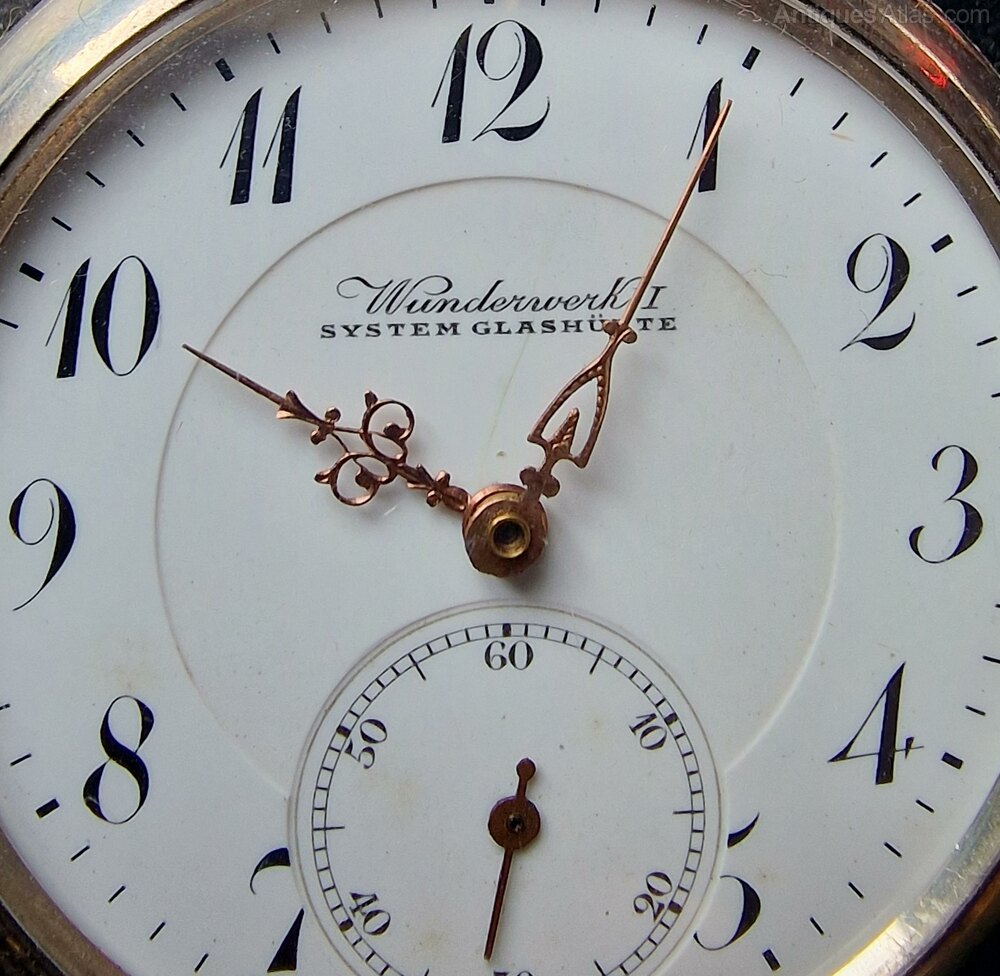 A good quality Wunderwerk silver pocket watch. An enamel dial with Arabic numerals and fine gilt hands. A subsidiary seconds dial. A top wind mechanism to the lever escapement mechanism. Lovely engraving to the mechanism and the inner case marked .800 for the silver mark. The inner mark 'WUNDERWORK 1 SYSTEM GLASHUTTE 16 RUBIS'. A coat of arms to the case back. Circa 1920.