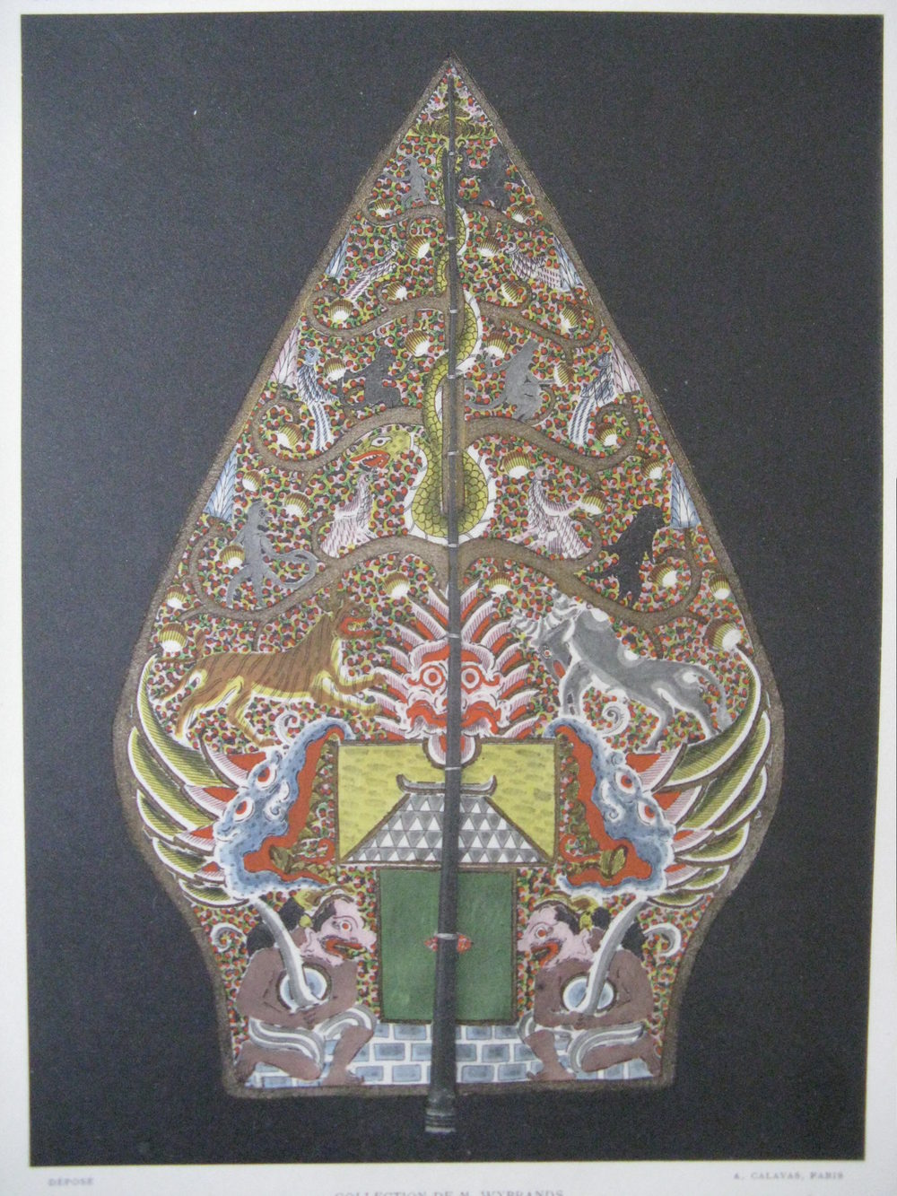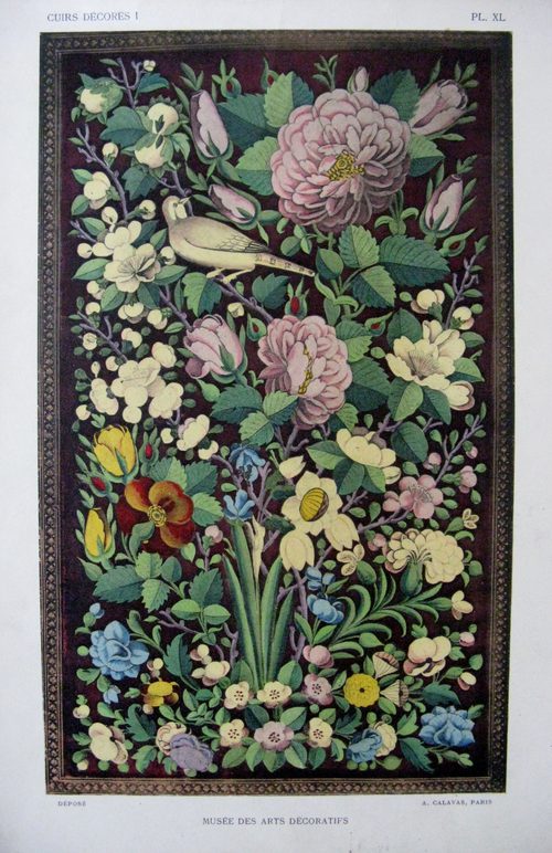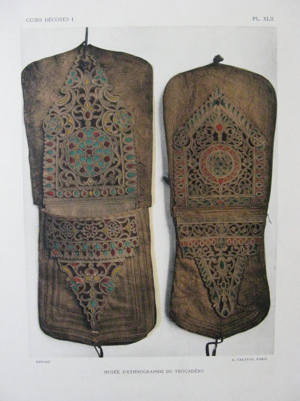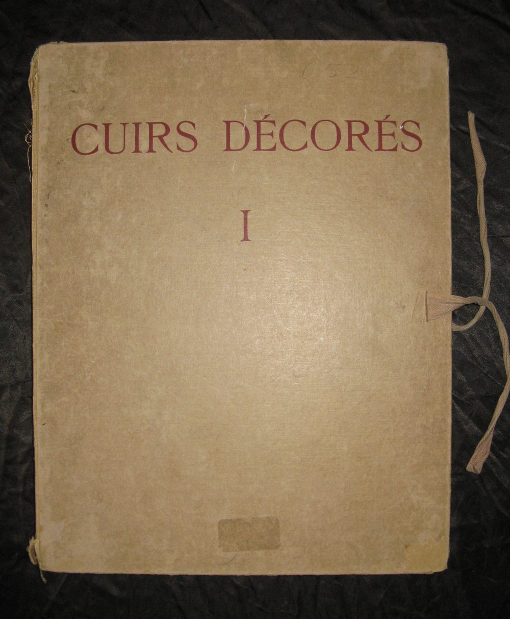 The book / folio contains a 6 page text in french with 42 large black and white plates plus 6 large colour plates showing painted and decorated antique leather work.