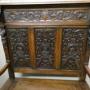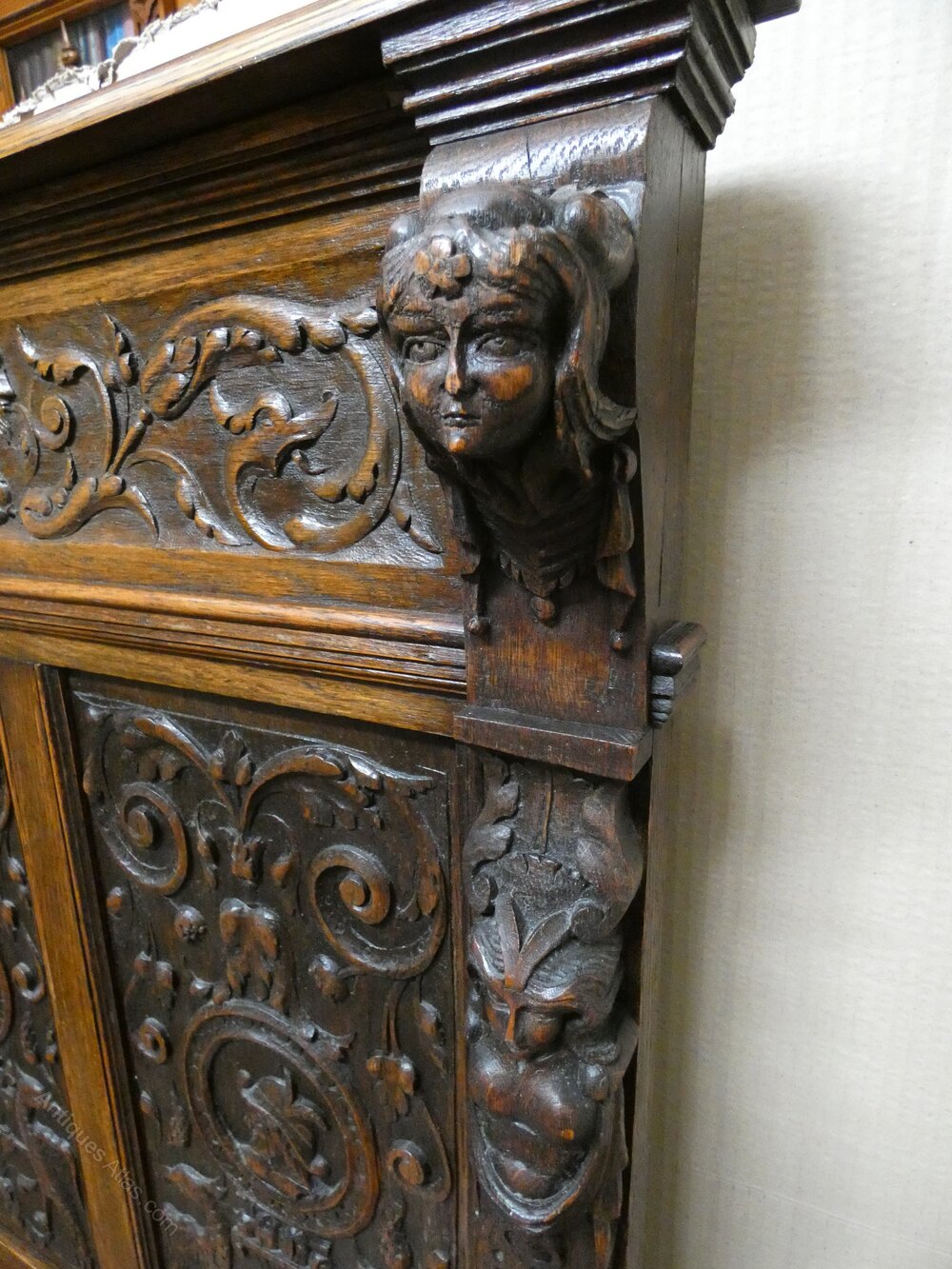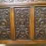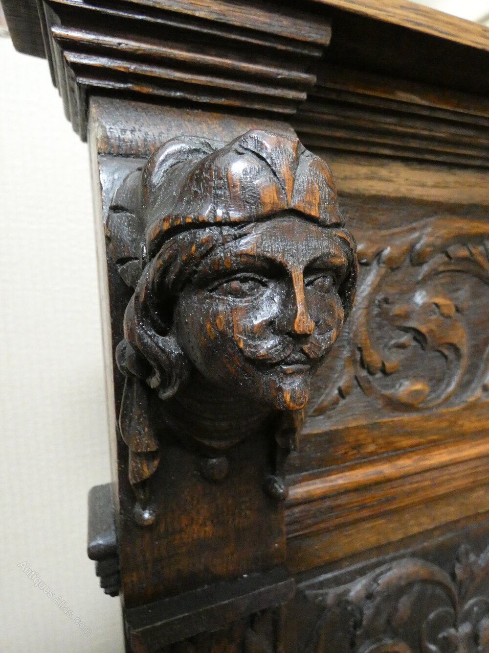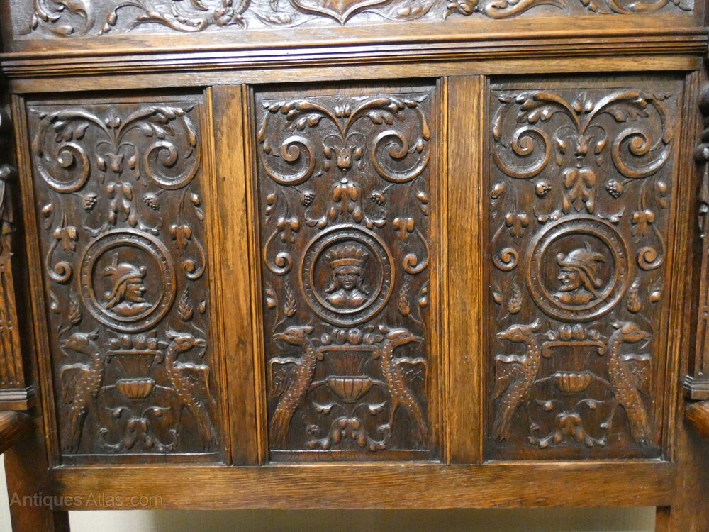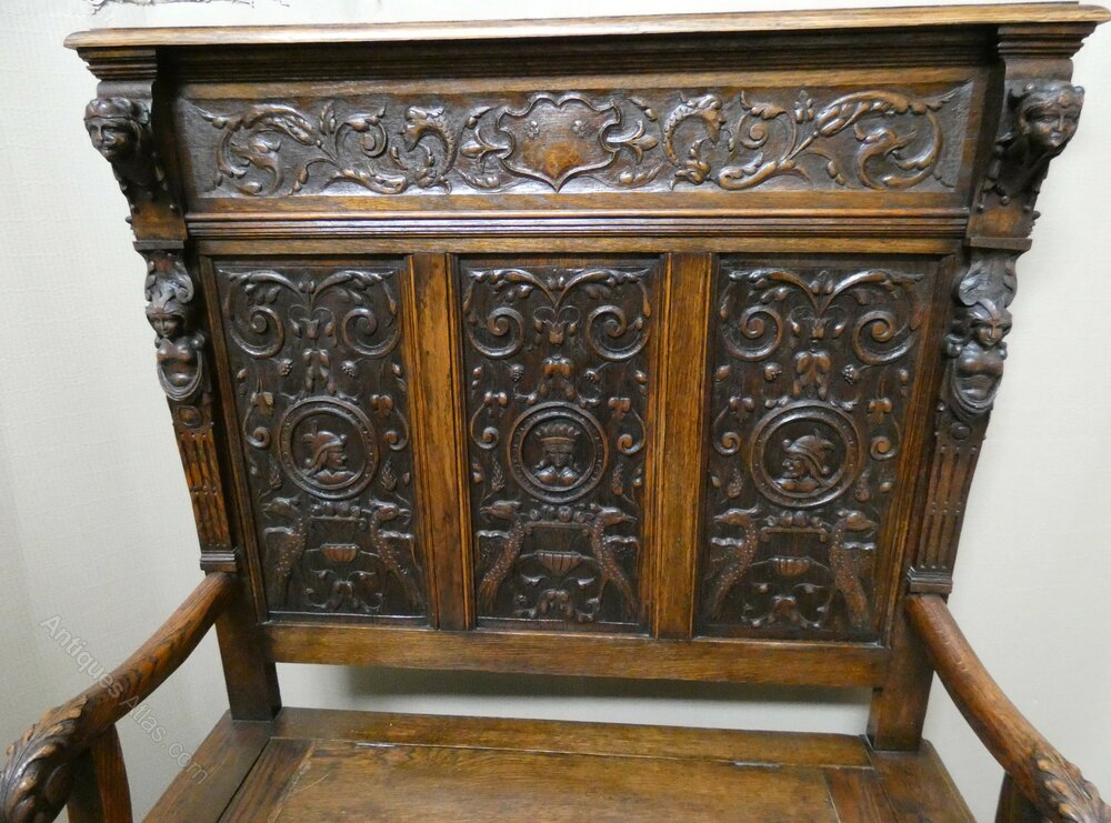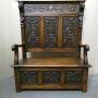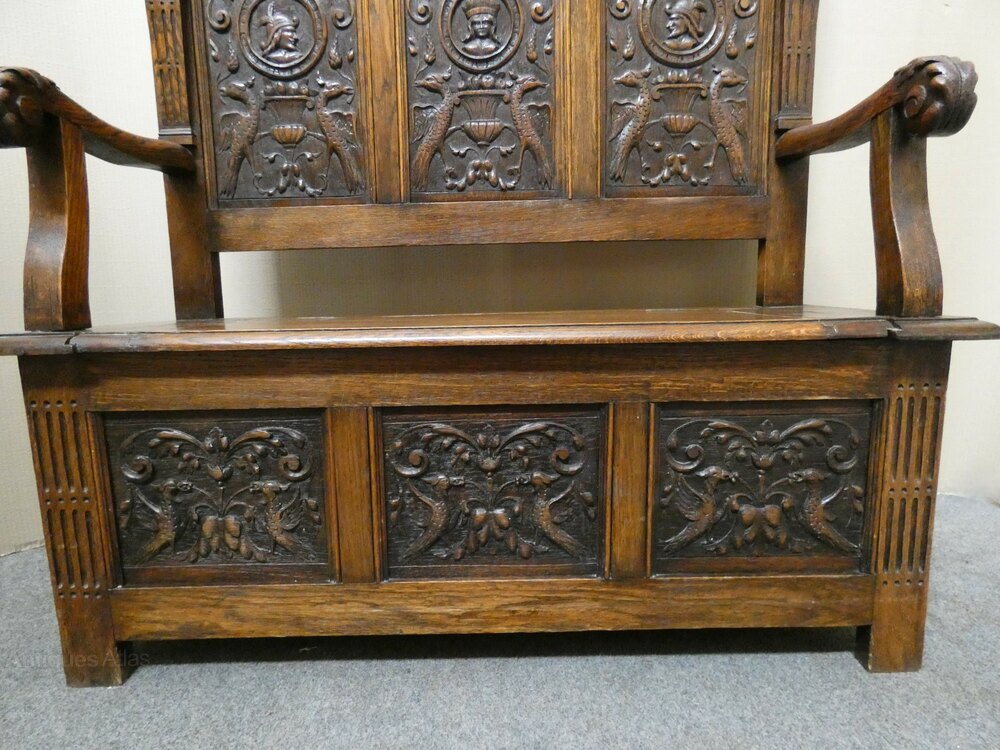 Fabulous oak high backed settle, profusely carved with figures, masks, female busts and mythical winged creatures, the hinged seat opening to storage compartment below.With normal minor marks / scuffs etc commensurate with age and use, overall this wonderfully decorative settle is in good sound condition and is a decorative yet very functional piece of furniture.