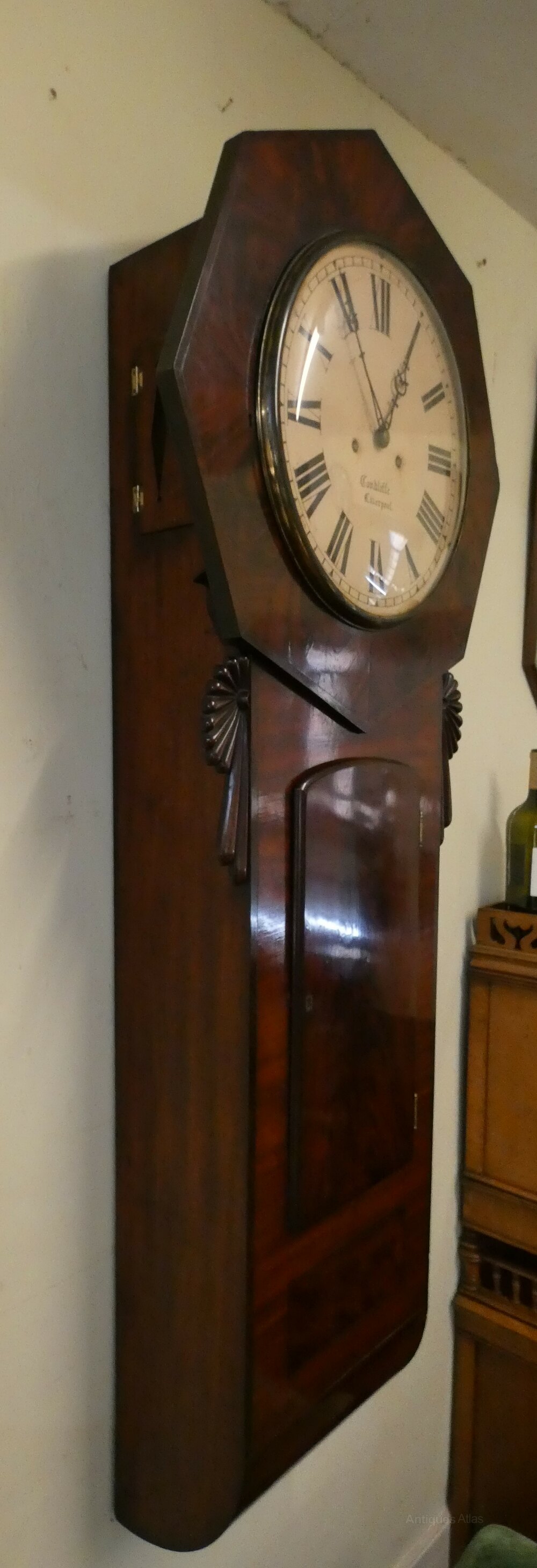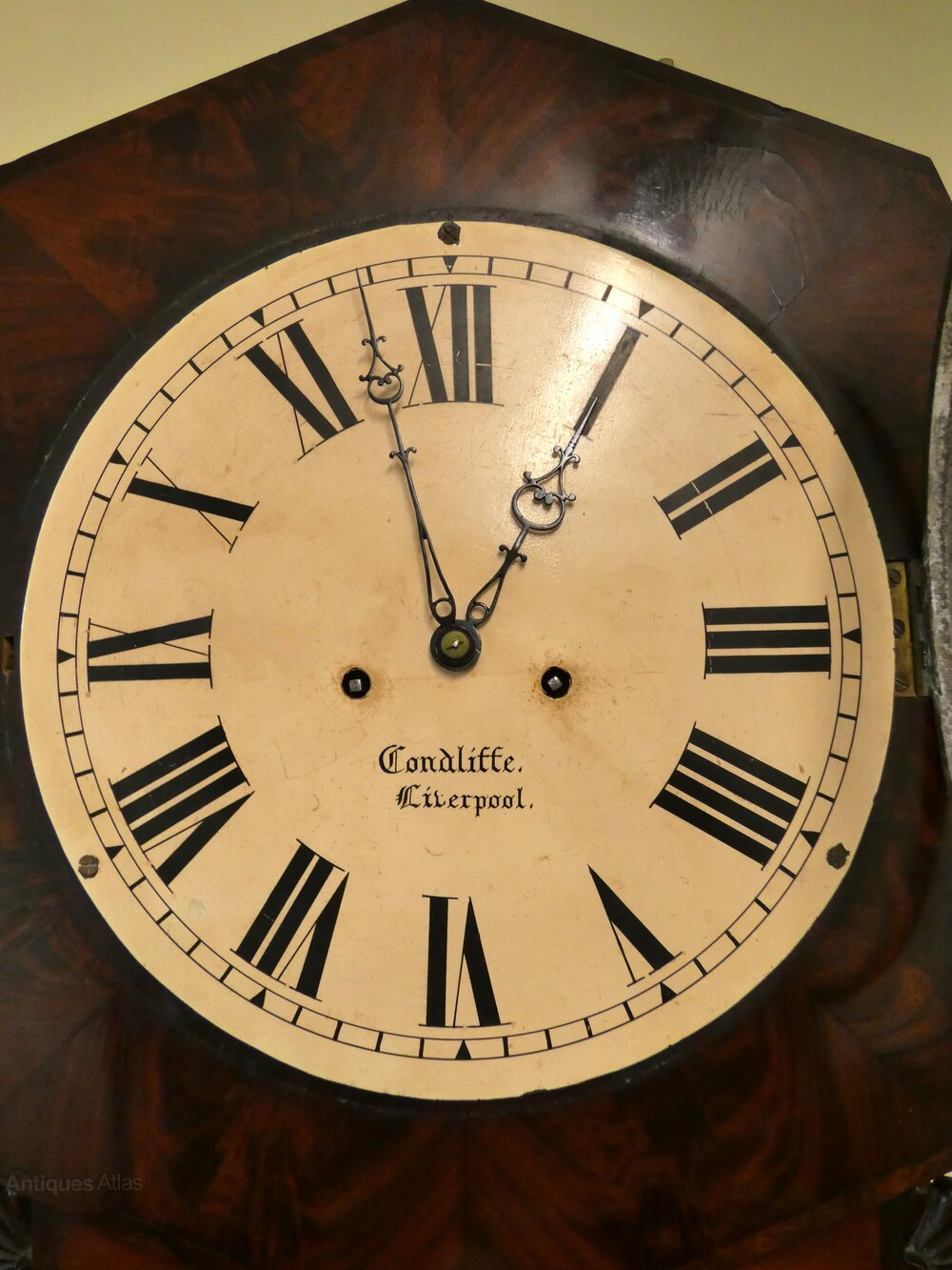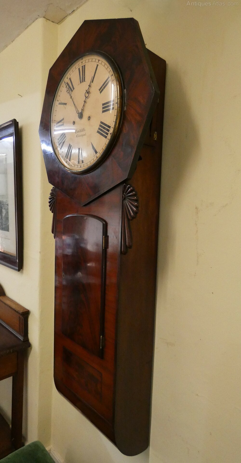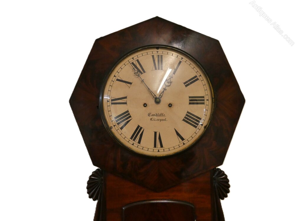 Norwich style tavern wall clock by James Condliffe, Liverpool circa 1850.This handsome clock in wonderful flame mahogany has a 14" painted dial in an octagonal surround, the eight day movement strikes the hour on a gong.