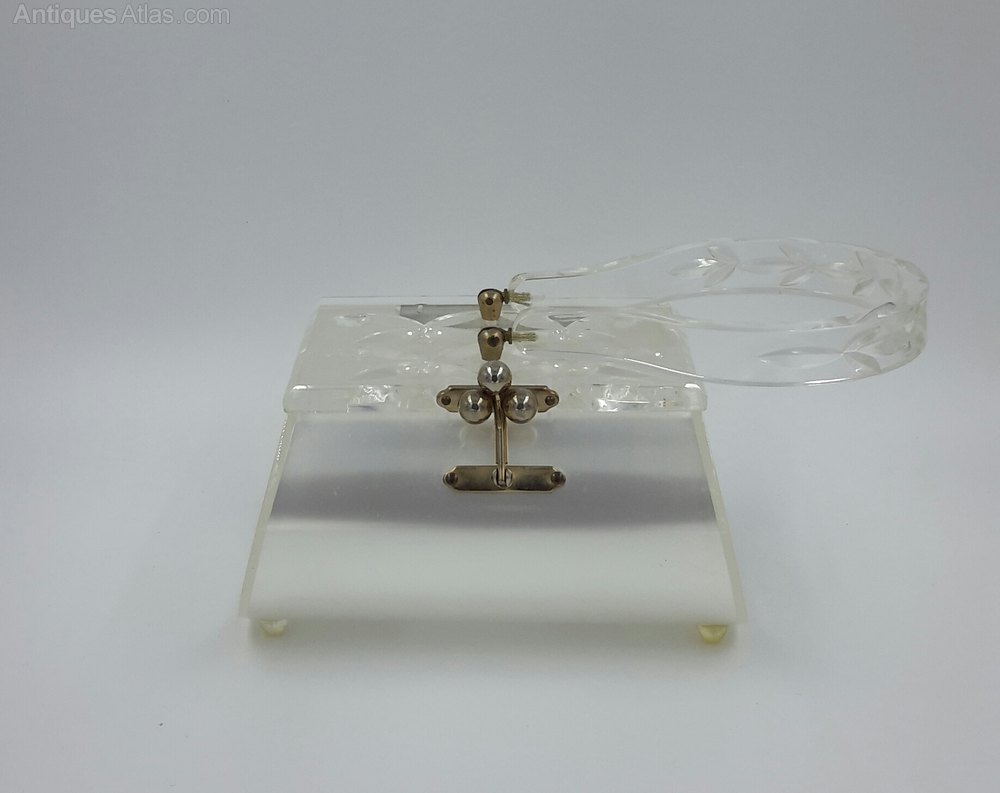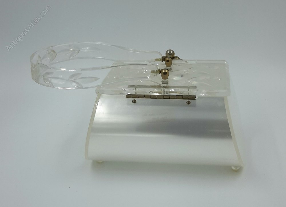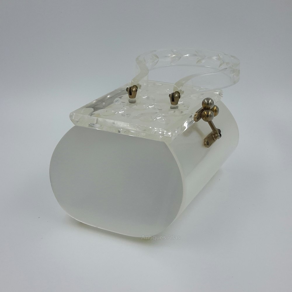 A stunning vintage 1950's lucite bag by renowned maker Charles S Kahn. This elegant bag features a silver lucite body and thickly carved clear lucite lid and handle, it stands proudly on four clear lucite ball feet. It retains the makers original label. These bags were known as Sculpture to Wear.Condition - there are a few surface scuffs to the body commensurate with age.