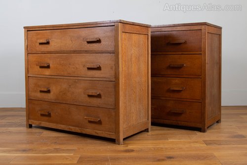 Pair Vintage 1920s Oak 4 Drawer School ChestsA good looking matching pair of 1920s chests of 4 drawers originally from a School and possibly used to store books, paper and the like. These have a decent suggestion of Cotswold School about them - modest, practical, well-crafted and honest in design with the attractive angled oak handles finishing off the look. They survive in good historic condition.