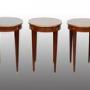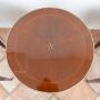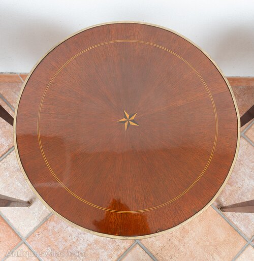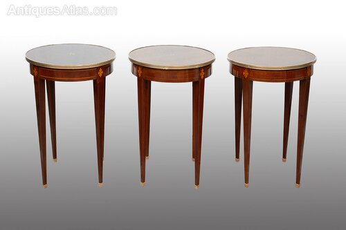 Description: Triptych of antique Napoleon III French mahogany coffee tables with gilded bronze inserts.The circular top features a central inlay depicting a compass rose and is surrounded by a gilded bronze trim.
