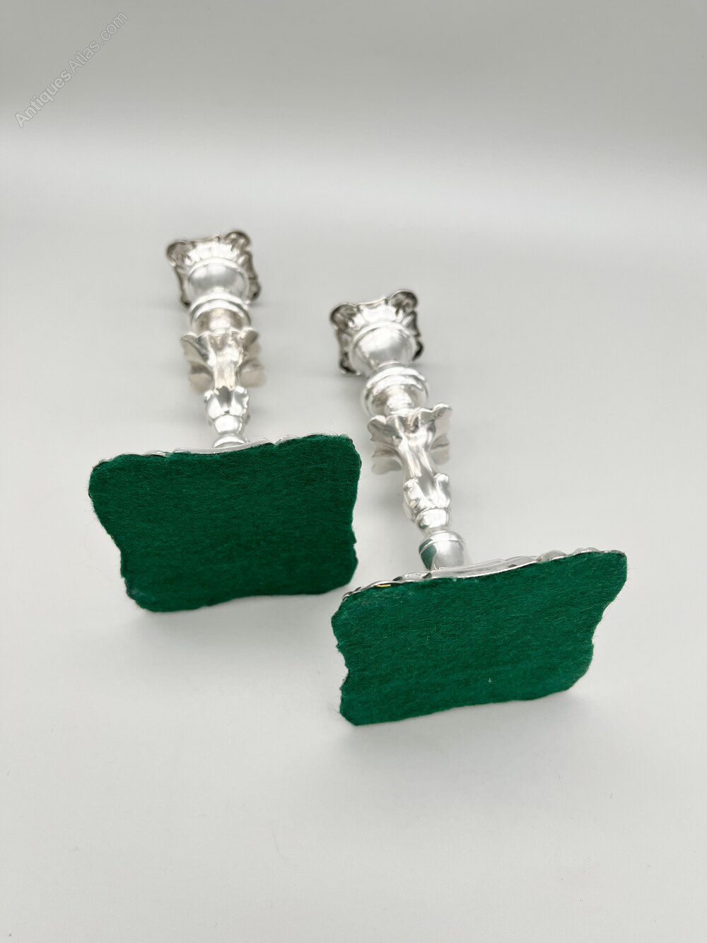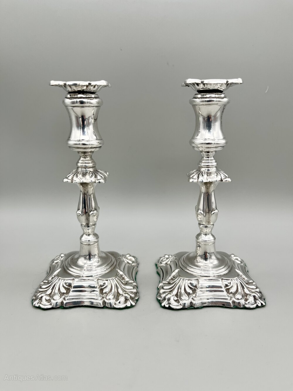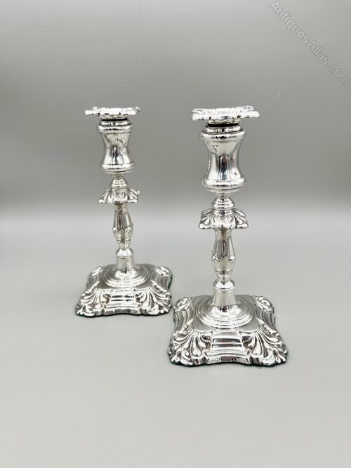 This is an elegant Pair of Art Nouveau Silver Plate Candlesticks. The sticks have scalloped square bases, weighted for stability, that are decorated with flowing foliage and flowers. The baluster shaped stems have organic leaf decoration and are topped by foliate knops. The sconces are in a waisted urn shape and have removable nozzles with floral decoration. The candlesticks are designed for narrow candles or tapers around 1.2cm in diameter.The candlesticks were made in Sheffield by the famous company Walker & Hall and date to between around 1880 and 1910. Walker & Hall are one of the great names of English silverware. The firm was founded by George Walker in 1845 with Henry Hall joining in 1853 to form Walker & Hall. Hugely successful and very highly regarded they remained in business until they were merged with Mappin & Webb and Elkington & Co to form British Silverware in 1963.