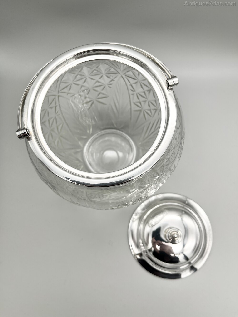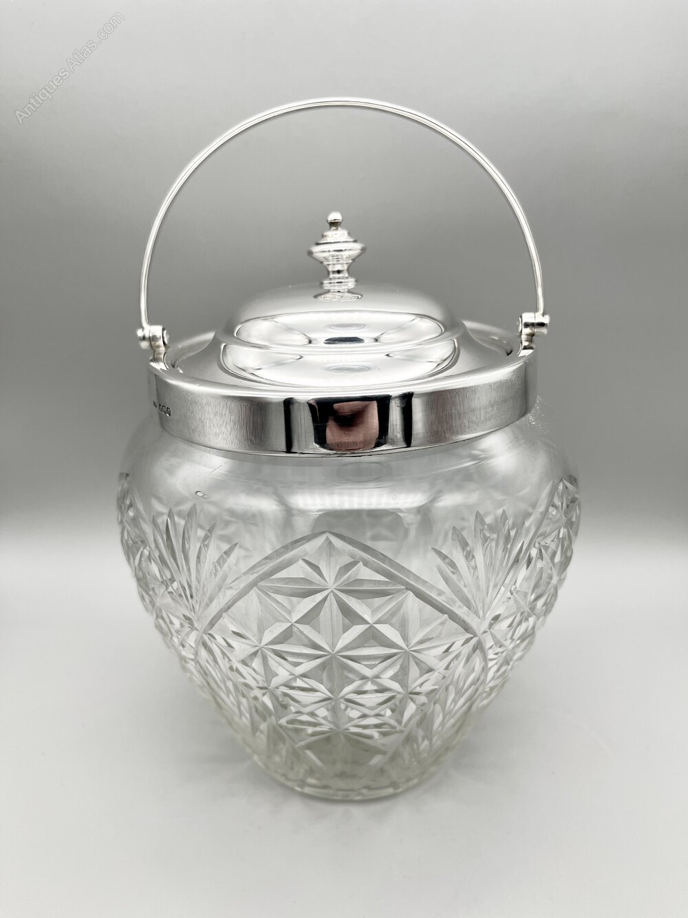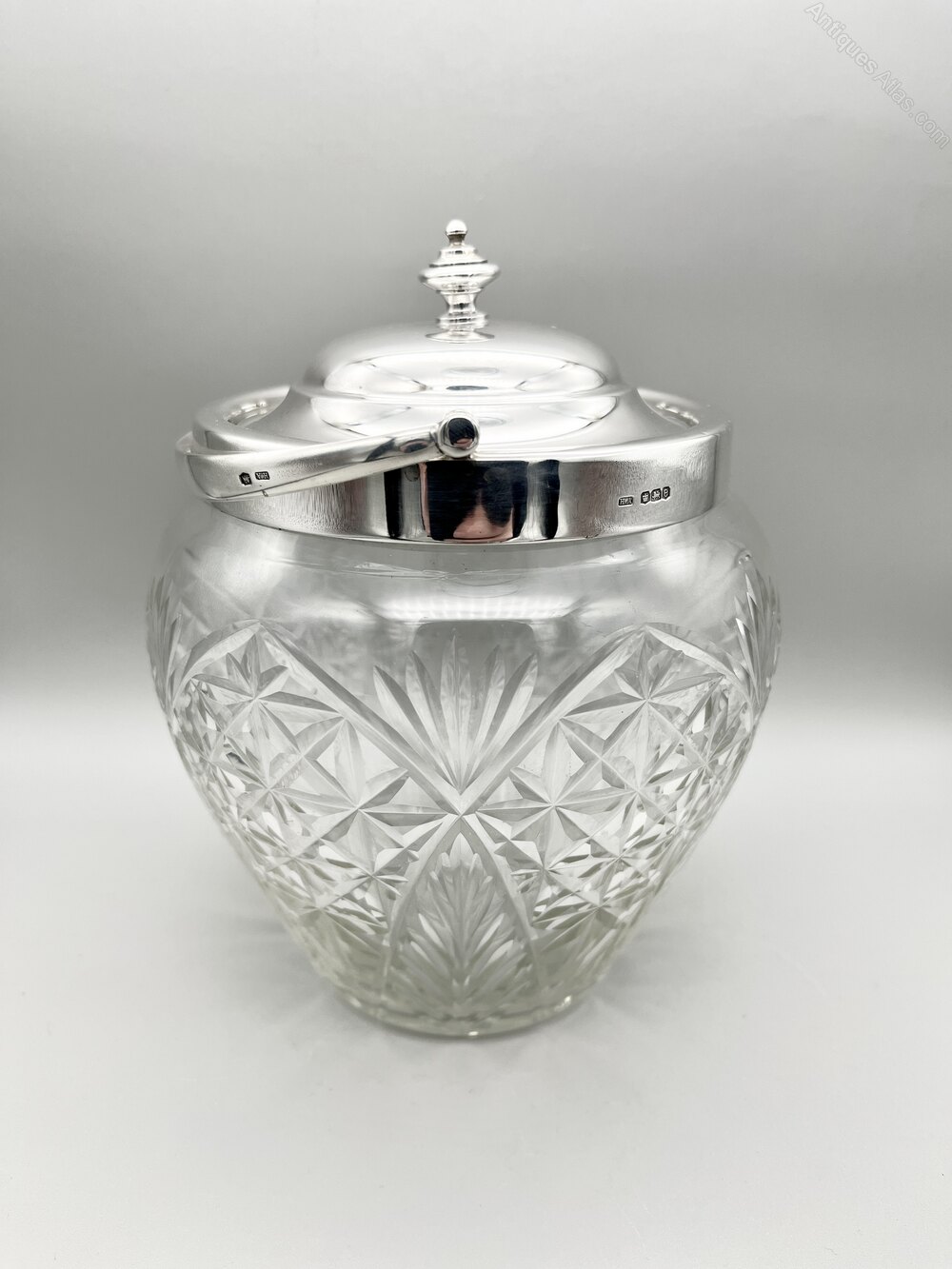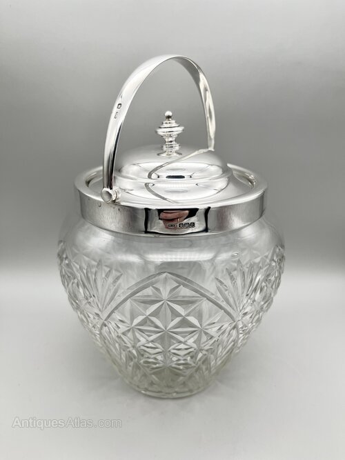 Here we have a good size George V Cut Glass & Sterling Silver Biscuit Barrel. The glass jar has a flat base with star and feather cut panels around the body. It has a Sterling Silver top rim and swing handle. The Sterling Silver lift off lid is domed and stepped with a turned finial. There are no initials or personalisation of any kind.The biscuit barrel was made in Sheffield by renowned silversmiths Atkin Brothers and dates to 1922. Tracing its roots back to Thomas Law in the mid-18th century, the Atkin family took sole control of the business in 1840, first as Henry Atkin & Co and then from 1853 as Atkin Brothers. The firm manufactured both silverware and electroplate in Sheffield and also had a London showroom. They ceased trading in 1958.