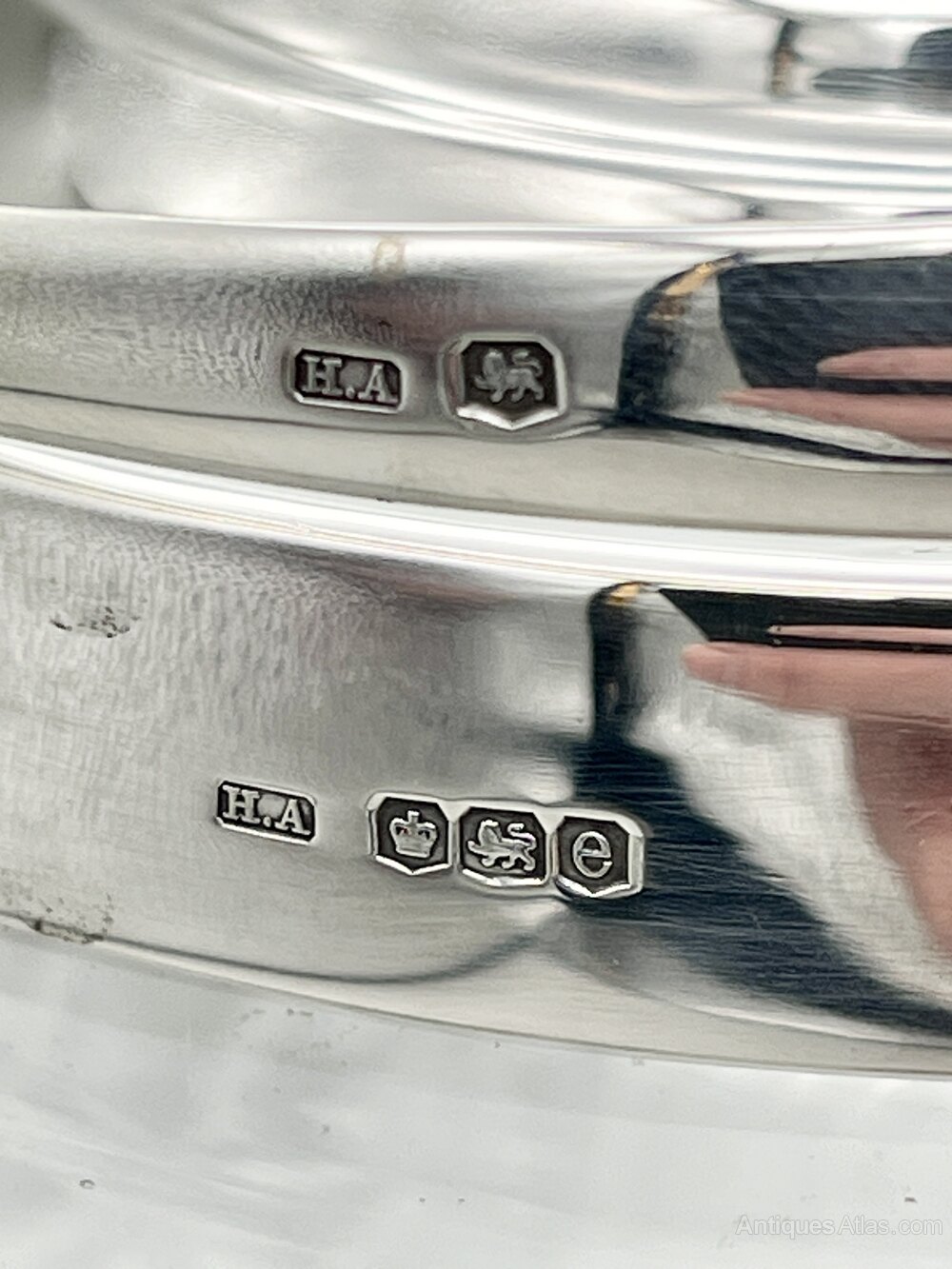 The hallmarks, on the outside of the top rim, the outside of the handle and the top of the lid, are well struck and clear to read. They show the lion passant for Sterling Silver, the crown assay mark for Sheffield, the date letter e for 1922 and the H.A makers' mark for Harry Atkin of Atkin Brothers.