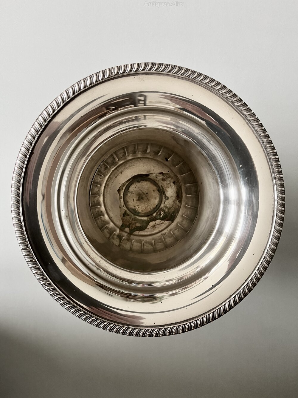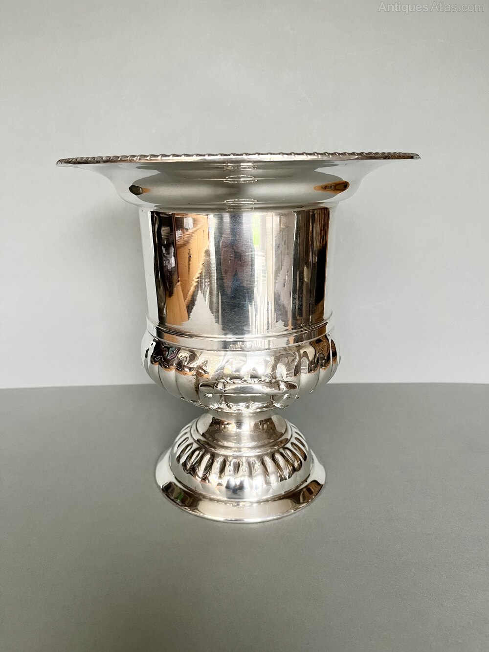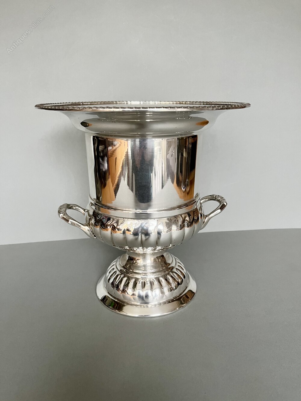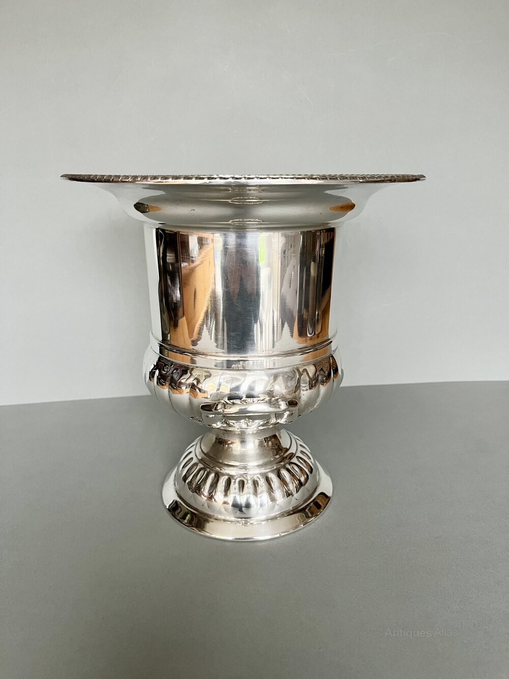 Here we have an elegant Early 20th Century Silver Plate Champagne Bucket or Wine Cooler. The bucket is in the classical campana urn form, with a reeded domed base, a part reeded body with two shell decorated handles and a gadrooned top rim. The bottle is for display purposes only and not included.The champagne bucket was made in England and dates to around the 1920s/30s. There is no makers' mark so we are unable to say who it was manufactured by.