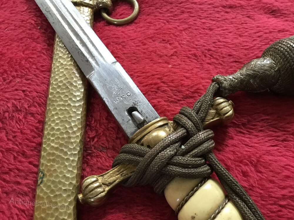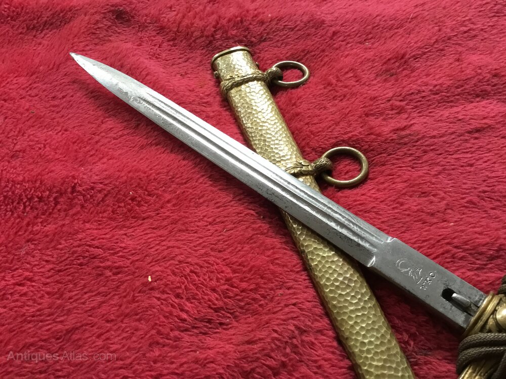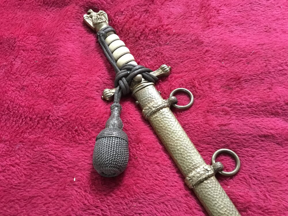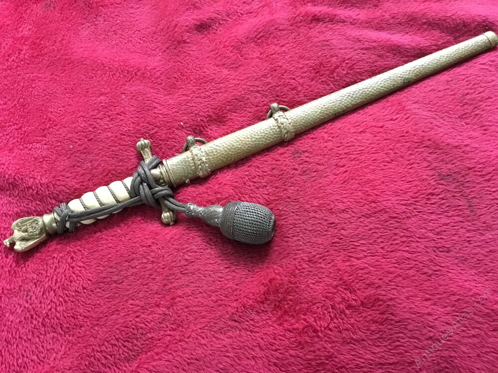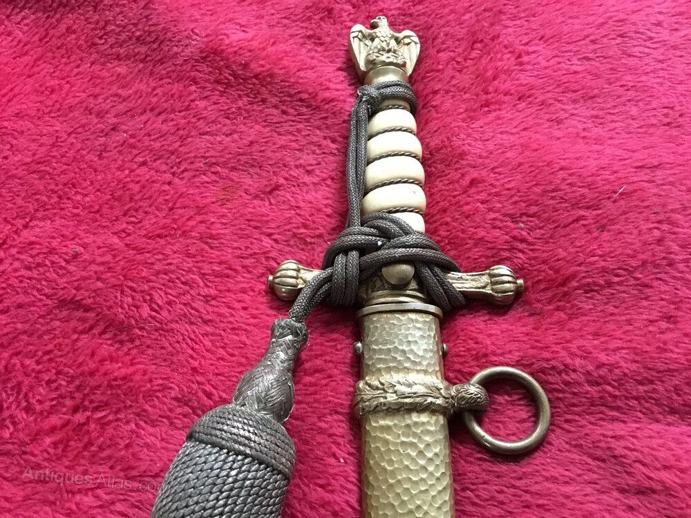 Wonderful German Naval first pattern dagger, with the collectable hammered scabbard , it’s made by WKC and has a lovely etched blade of a sailing ship , the sought after dagger is in very good condition and comes with its original knot and looks like they have never been apart ,DateArt Deco
