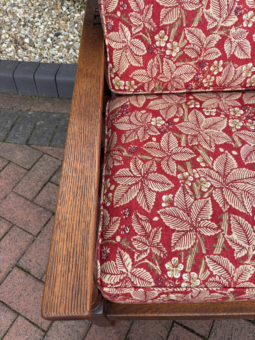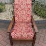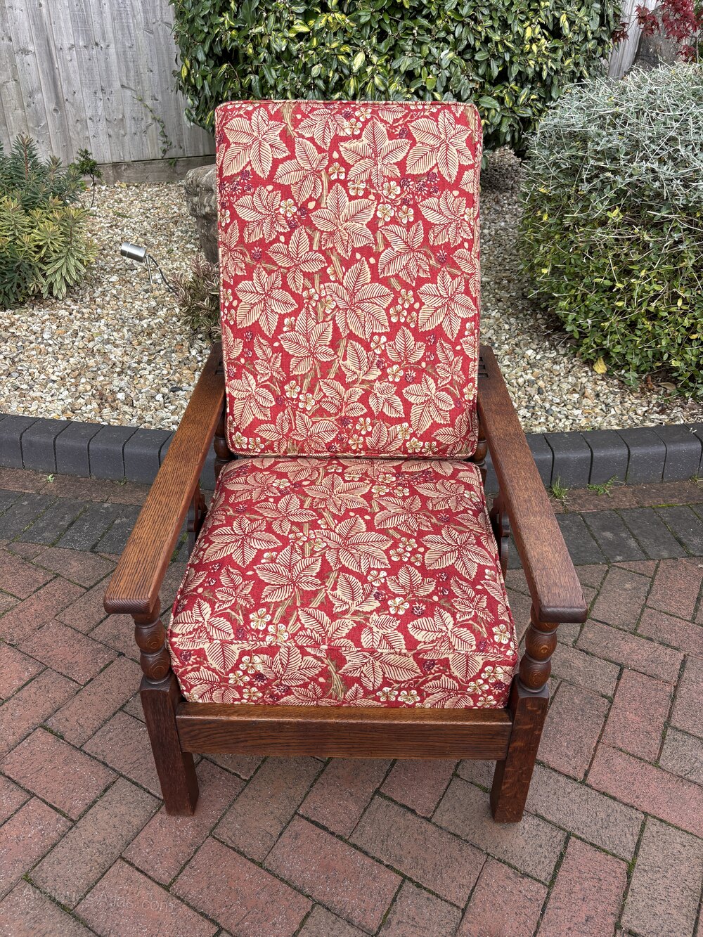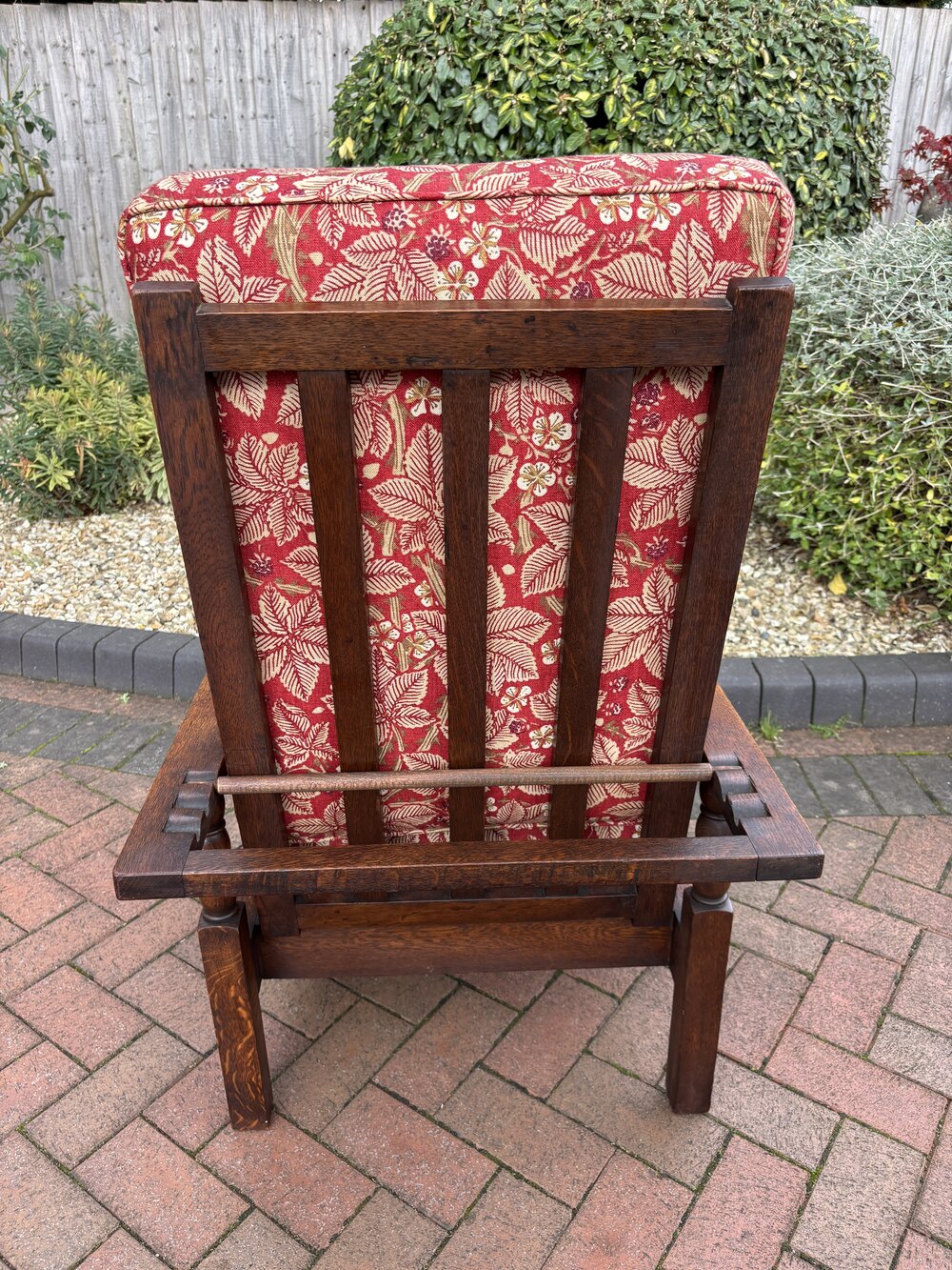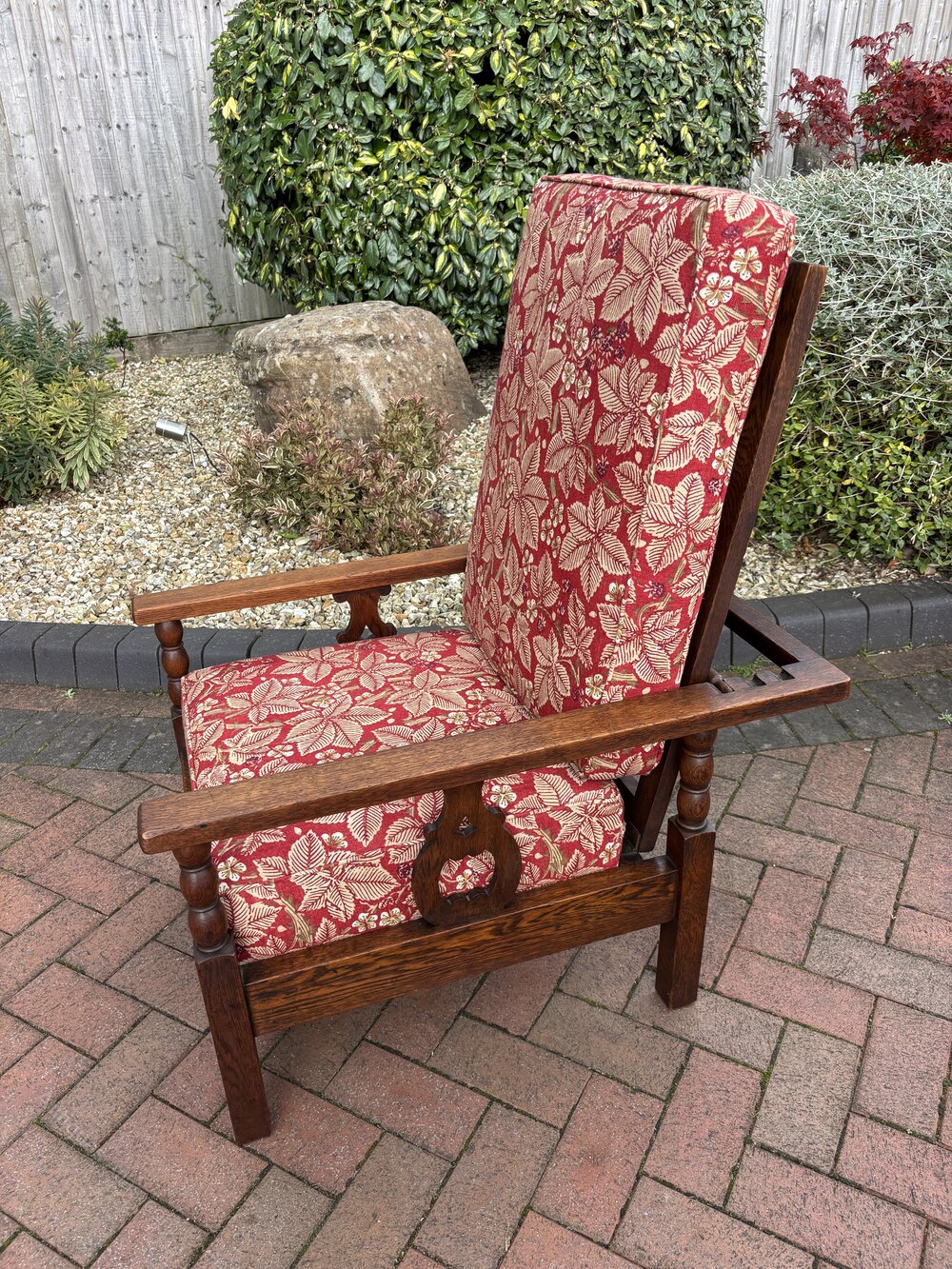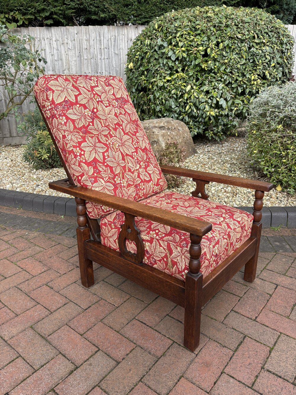 An Arts & Crafts solid oak reclining armchair c1905. The square frame has a reclining backrest for three positions, bobbin turned and cut-out decoration to the side supports.Newly and fully upholstered to include new foam cushions to meet with fire regulations and covered in a good quality William Morris fabric.