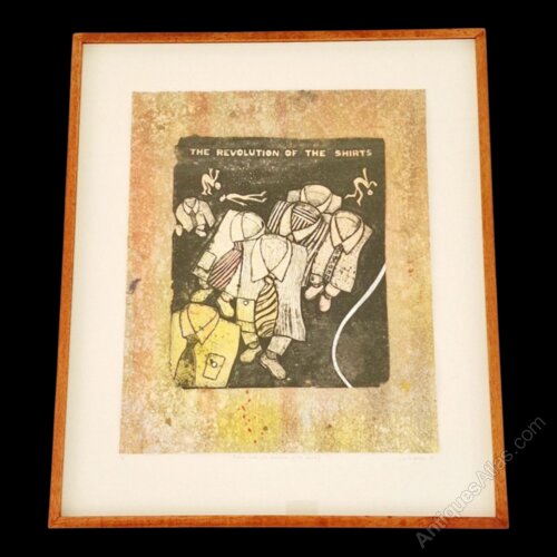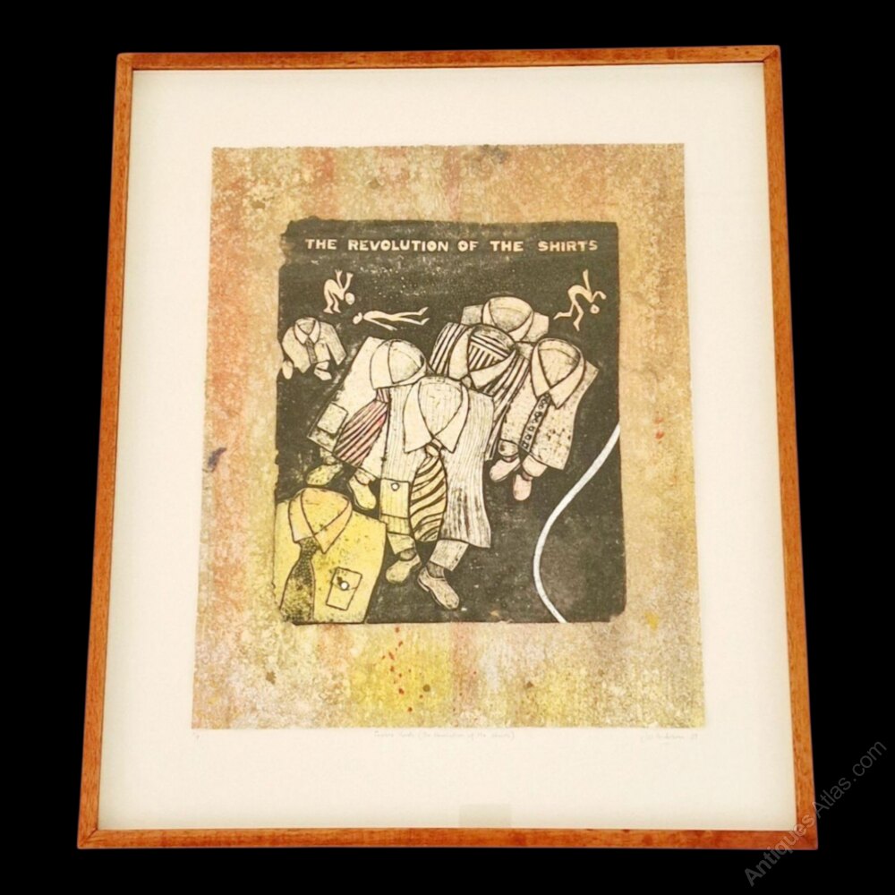 In GeneralA Jim W Anderson RE, "Faceless Horde (The Revolution of the shirts)", Collagraph on handmade paper, rare Artist's Proof, framed, 1989. A hilarious image of shirts with their ties revolting against their human owners and running off on their little squat legs! Their naked owners are left in a state of naked panic!! This image is very typical of Jim Andersen's highly satirical and anarchic art work!