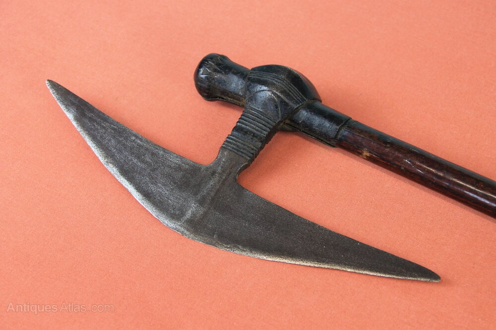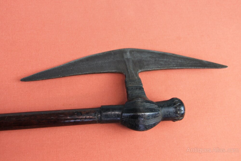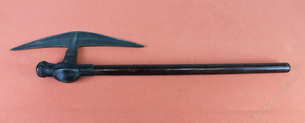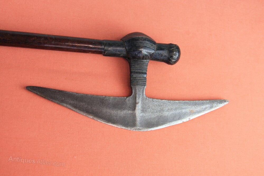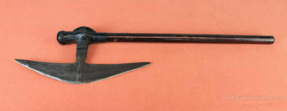 19th century African Zulu 'Selepe' Battle axe. Has a triangular blade fastened to a round hardwood shaft. General rust staining overall but in good sound condition. The shaft has possibly been shortened in length.Approximately 57.5cm overall and blade 29cm.