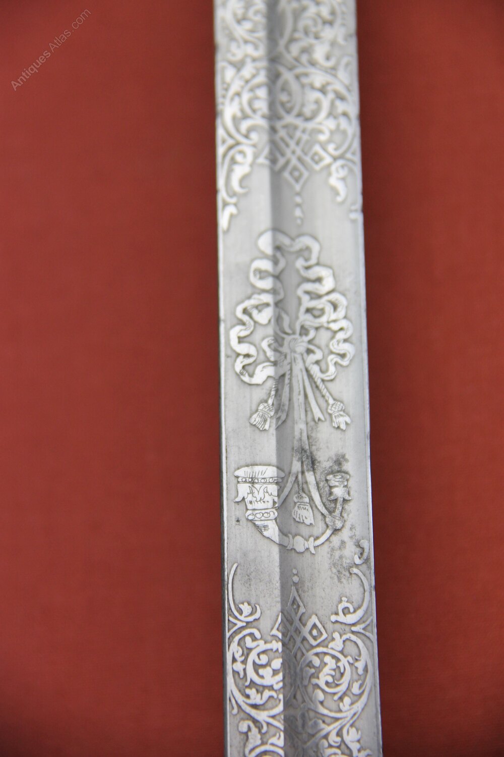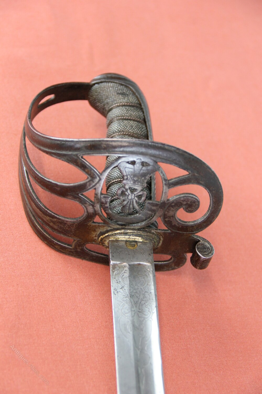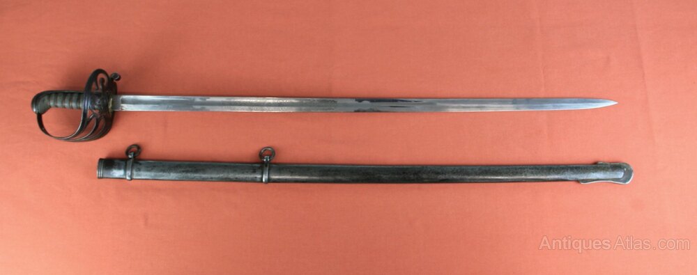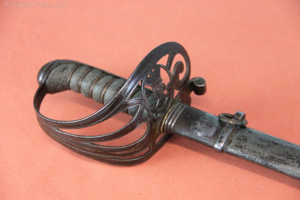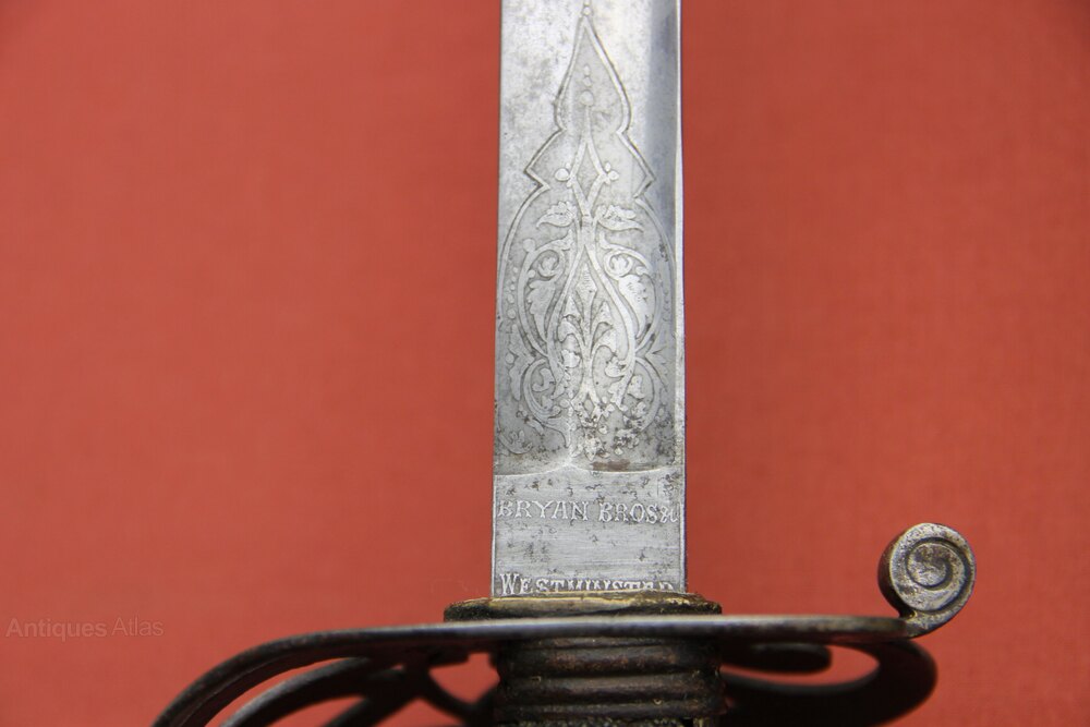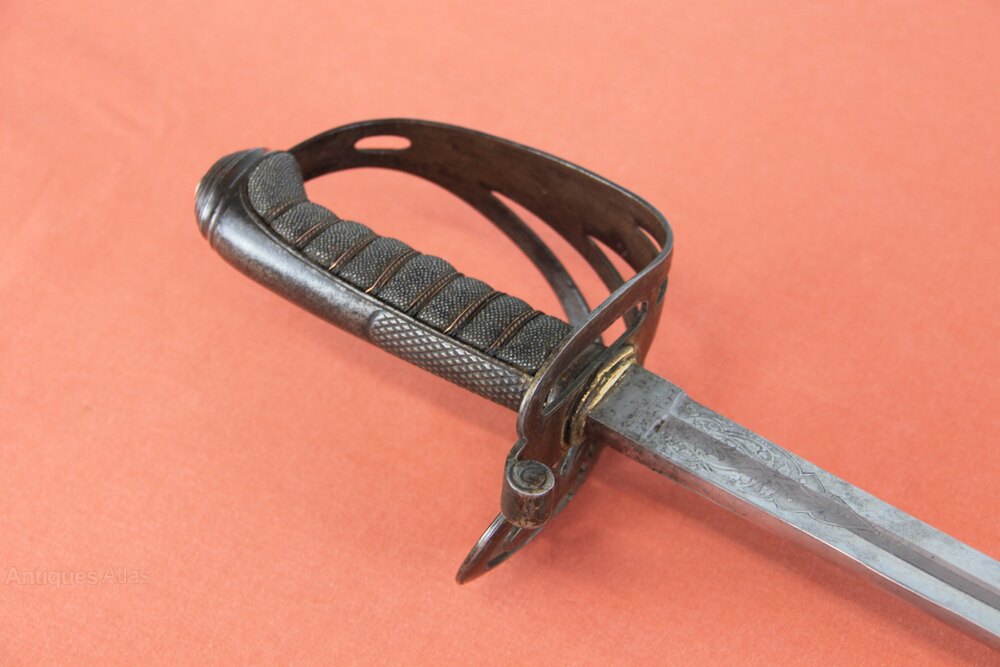 Victorian Rifle officers sword In its original steel scabbard. Has a pierced iron guard with Rifles logo and a copper wire bound shagreen grip. Slightly curved, single edged engraved blade with foliage and Rifles logo on both sides. Marked as by Bryan Bros & Co Westminster. In generally sound condition with overall light rust staining to exterior. Blade has most of its original polish.Approximately 98cm overall and blade 81cm.