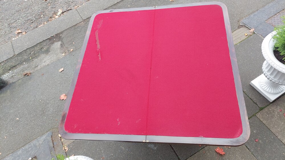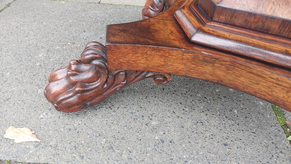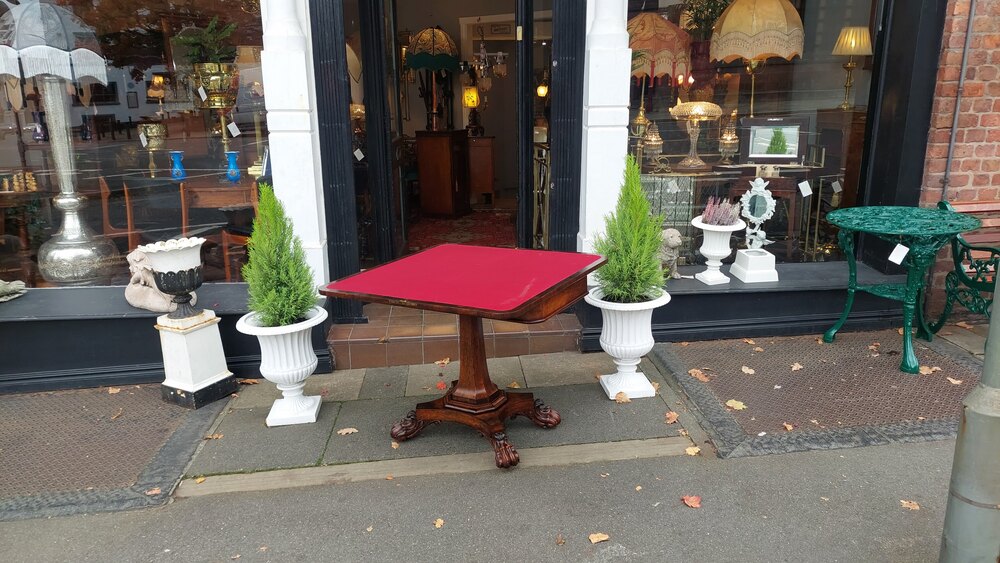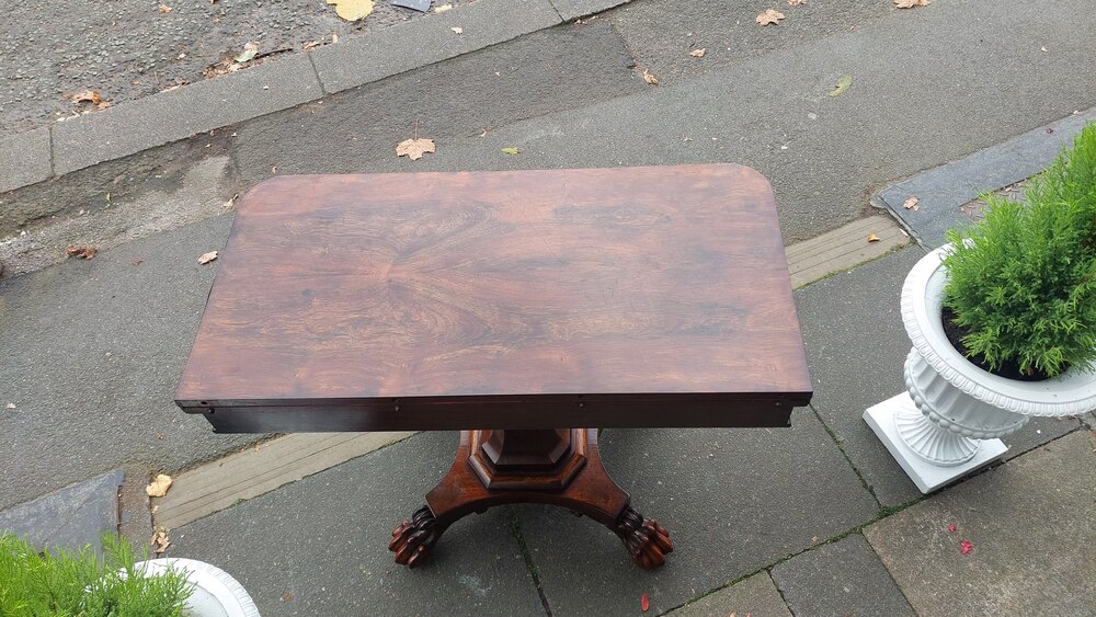 William IV Rosewood Card Table with Fold Over Baized Top on Baluster Column leading to Pedestal Base supported on Lion Paw Feet - 36"w x 19"d x 30"h closed (36 x 36 x 29"h open)DateWilliam IV