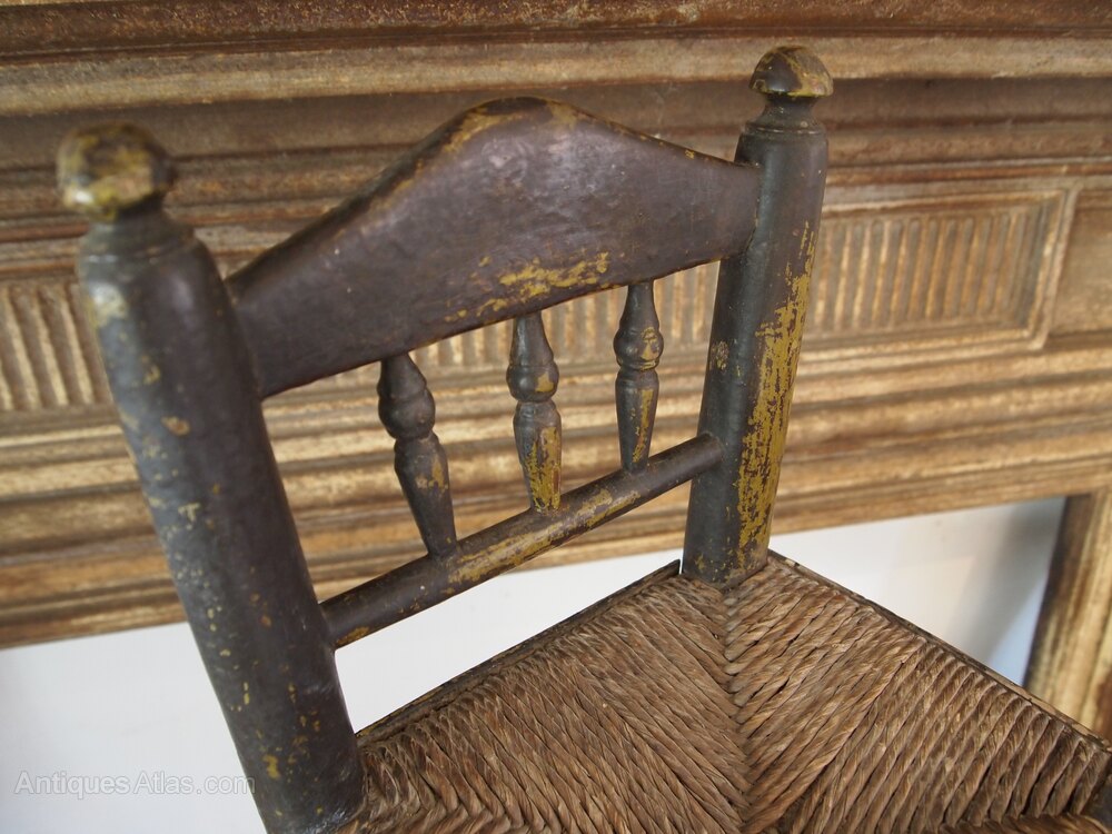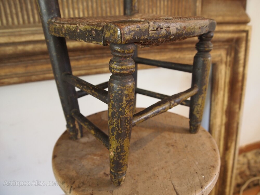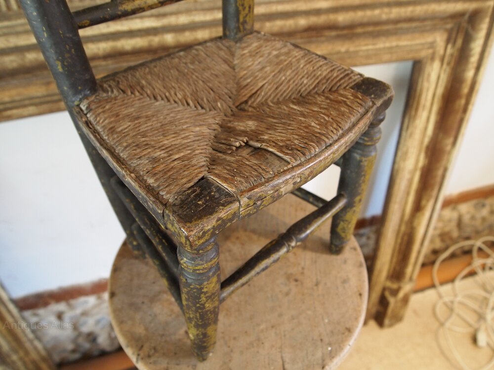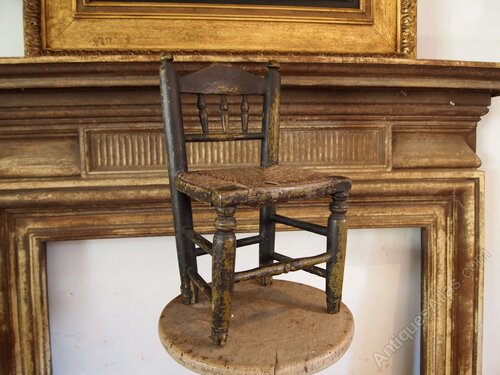Here we have a very rare George III miniature chair c1800. As you can see the chair has great colour and patina. The chair is in original paint and has the original rush seat. There are typical of the period turned side supports with finial tops. There is a broad top rail and well turned spindle back.The legs are well turned and joined by stretchers all around. A super period chair in great retail condition ready for your home. The dimenions are approx 40 cm high 23 cm wide 21 cm deep.Buy from a trusted LAPADA dealer