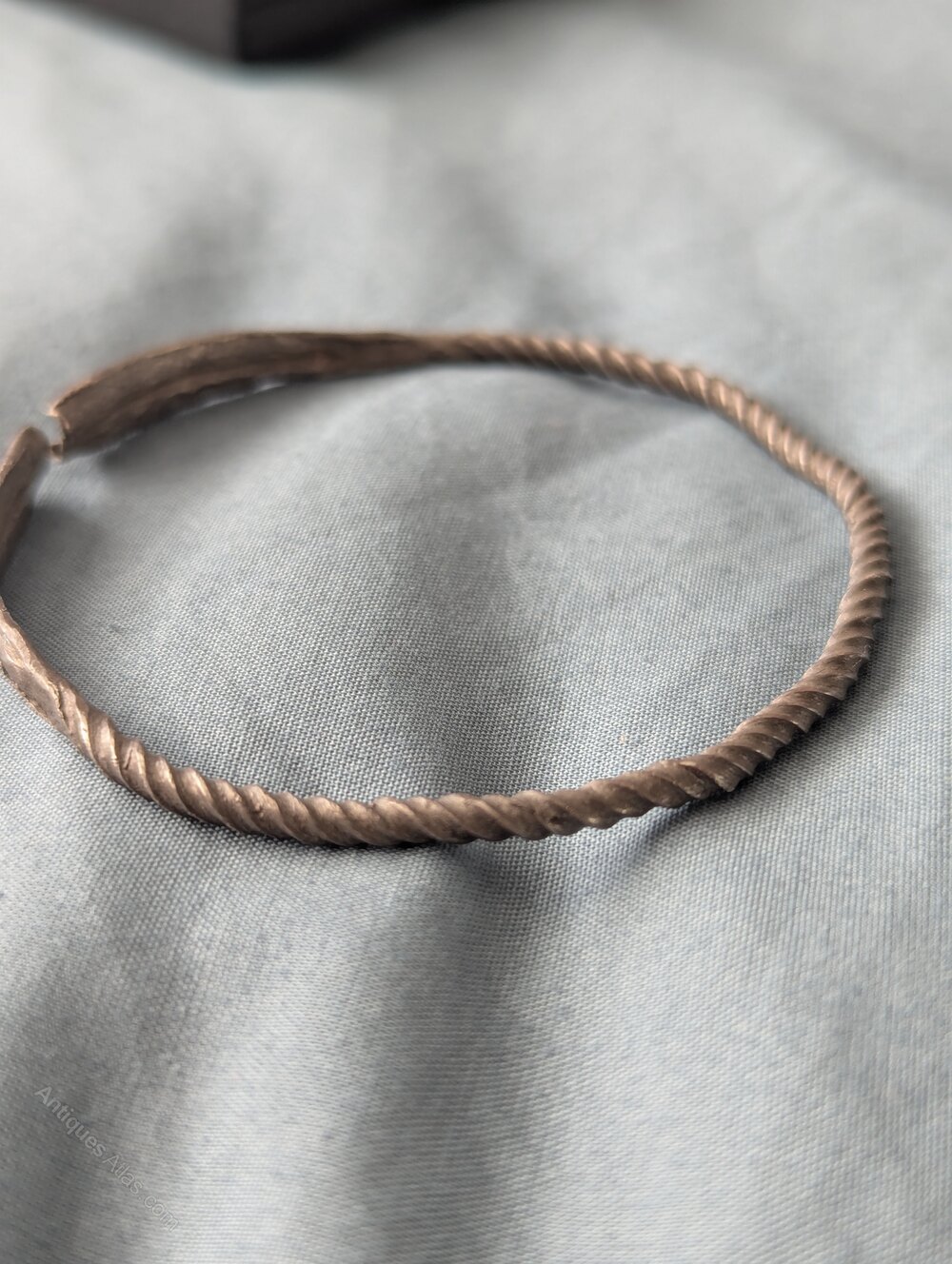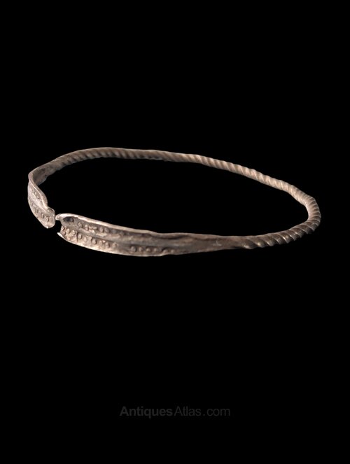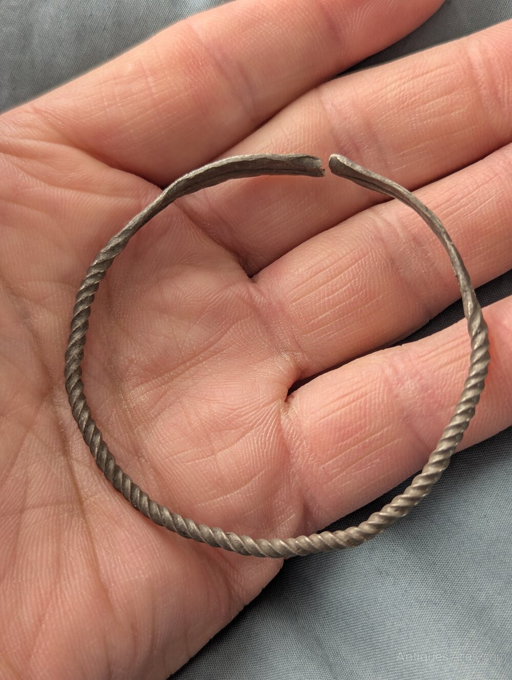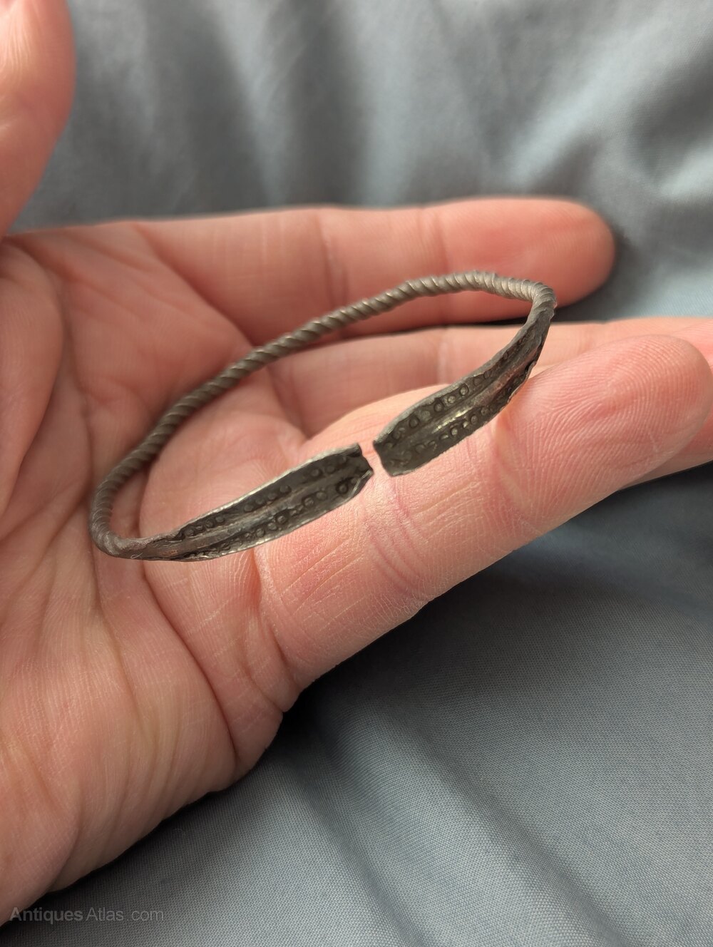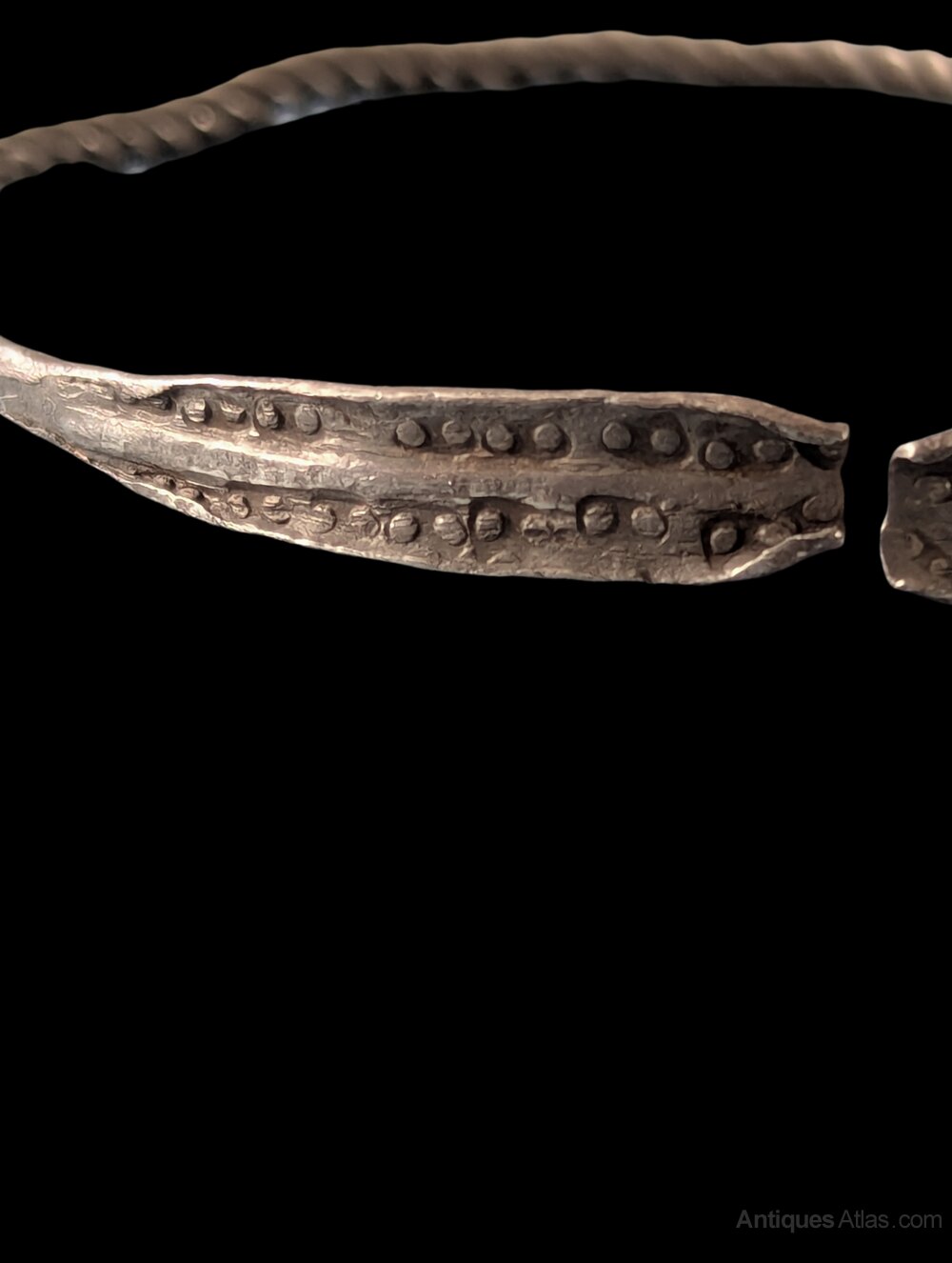 A well preserved silver pennanular bracelet (open in the centre for sizing on the wrist) with punched beaded pattern and barley twist finishing this decorative piece.Circa 800- 1050AD. 6.8cm at its widest point.