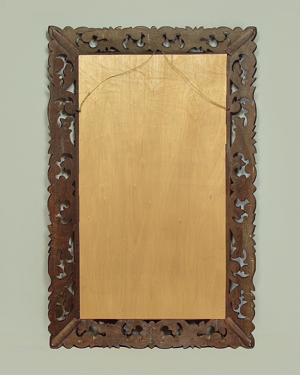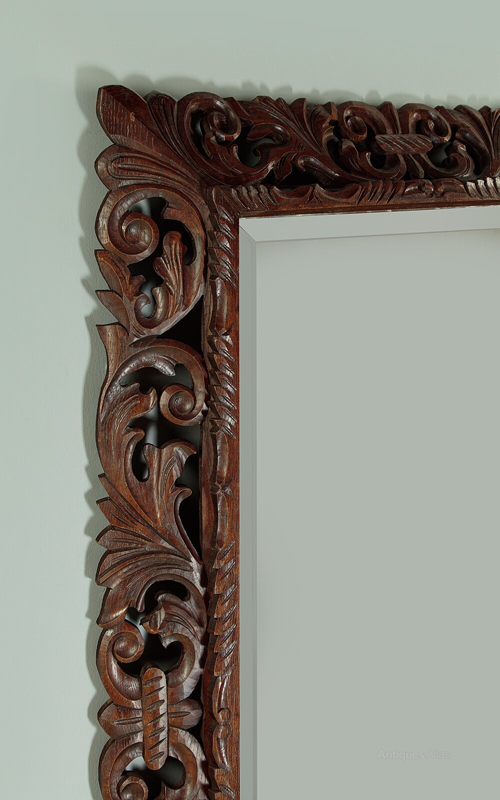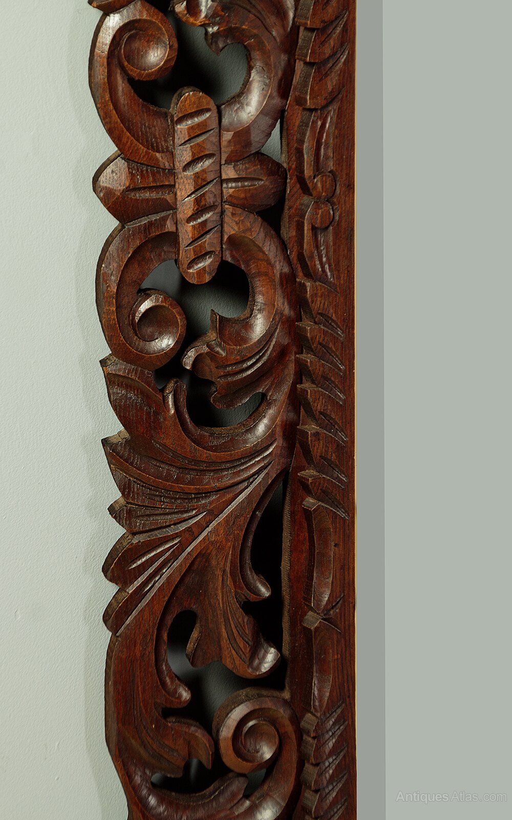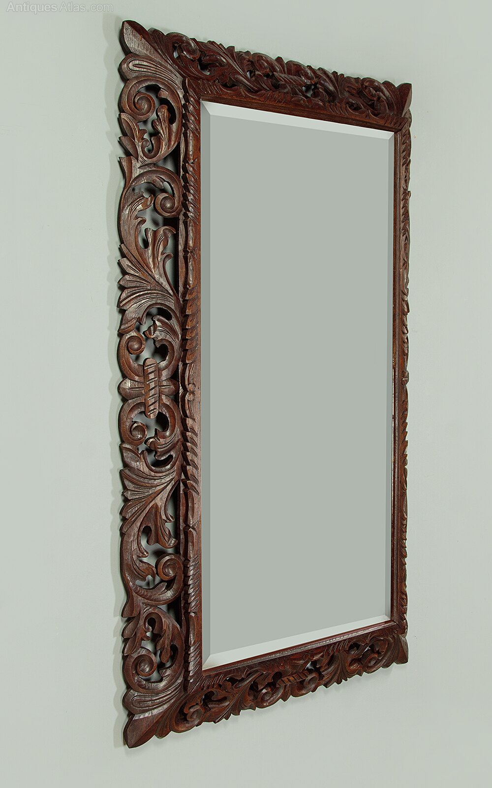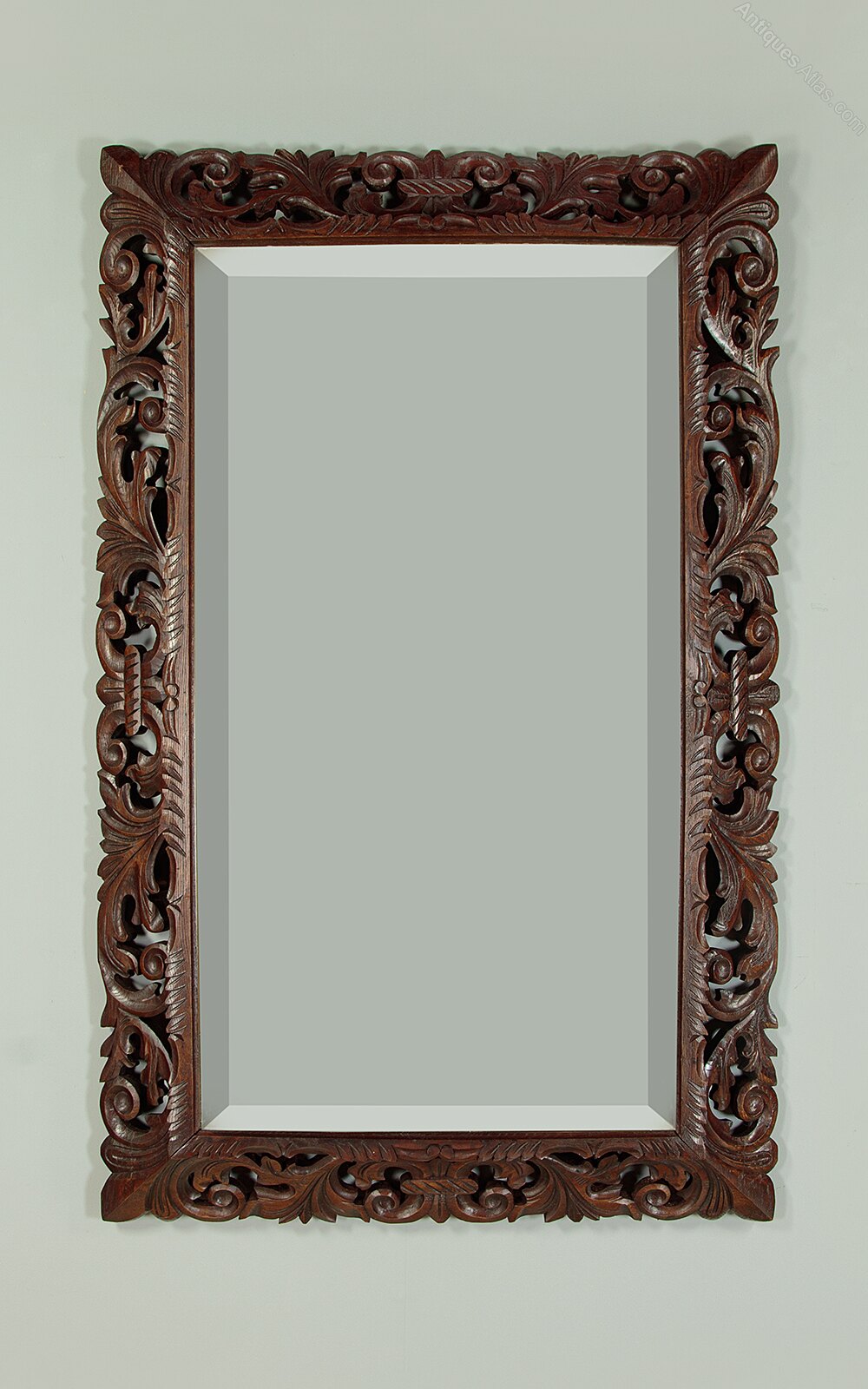 Large late 19th.c. carved oak wall mirror c.1890. 25″ x 47″ mirror plate with a bevelled edge. Within a broad carved and pierced oak cushion frame with scrolling foliate detail. Excellent colour and condition, cleaned and waxed in our workshops. Could be hung either landscape or portrait aspect.Width: 37" (94 cm)