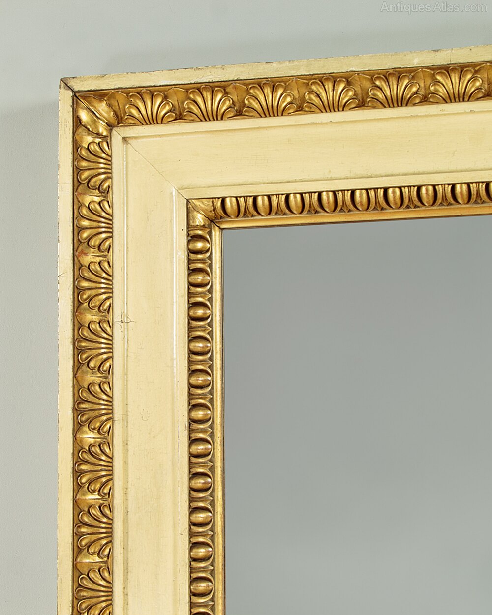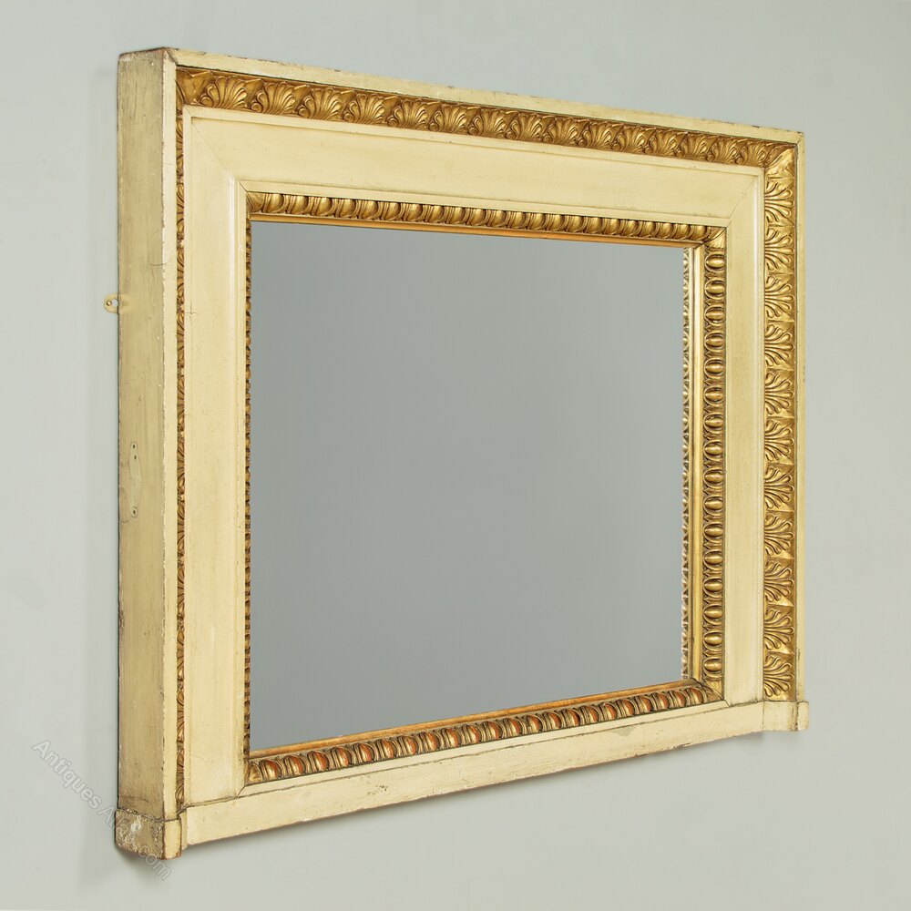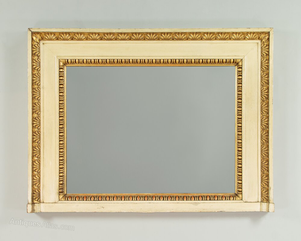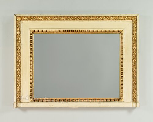 Unusual painted and gilded overmantle mirror c.1920. 38" x 28½" mirror plate within a broad painted pine frame. Large Regency style carved and gilded egg and dart moulding to the inner edge and a second border of anthemion pattern moulding at the top and sides. Some obvious old wear and the gilding is rubbed through in places to reveal the red ground below. Otherwise very good condition, fitted with a new mirror pate, cleaned and waxed in our workshops.Width: 54.5" (138.5 cm)