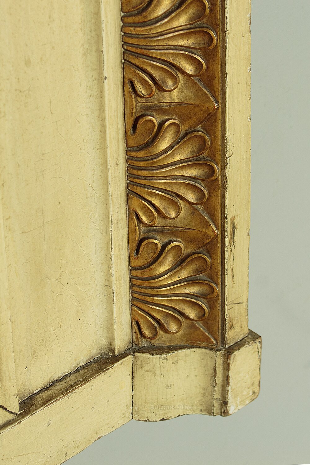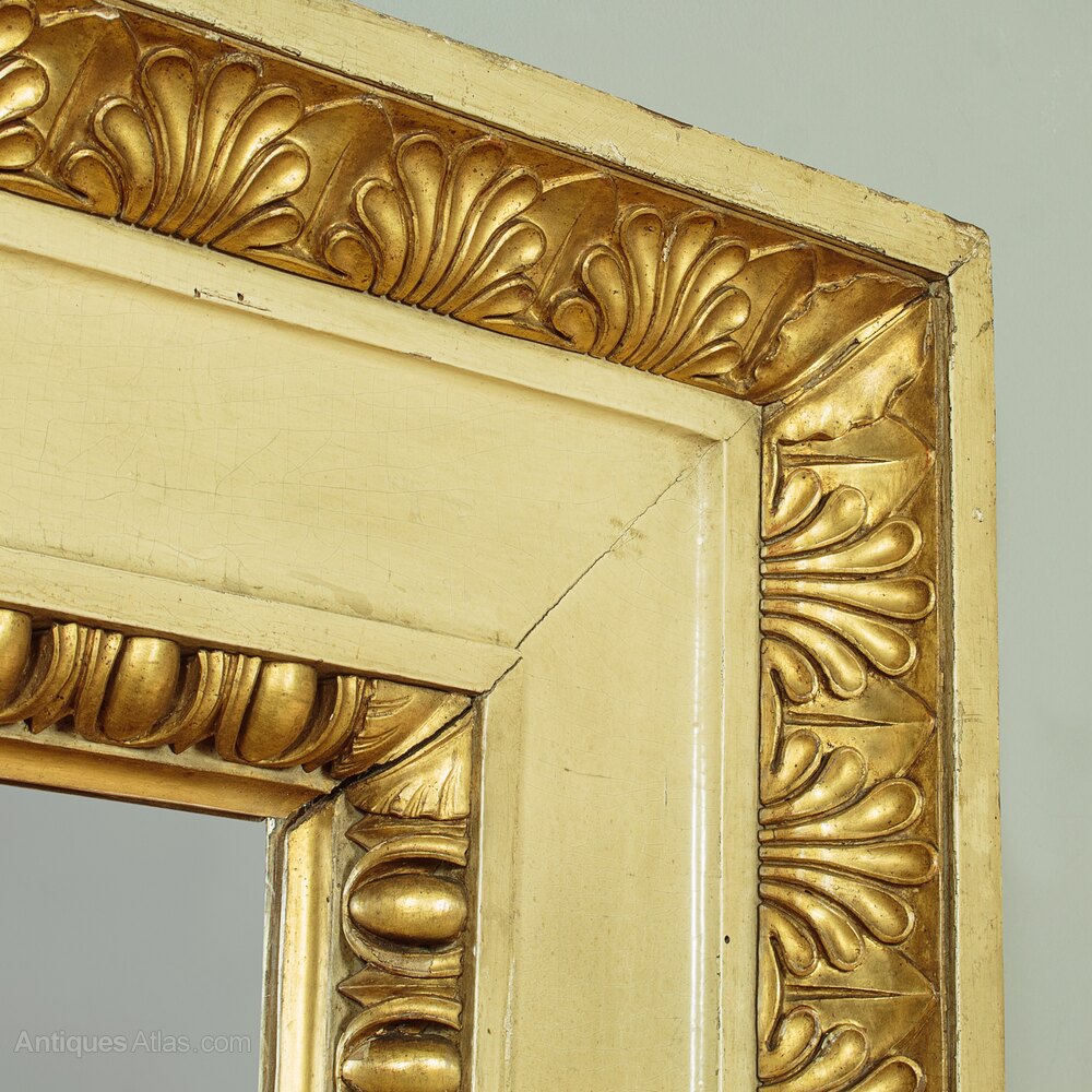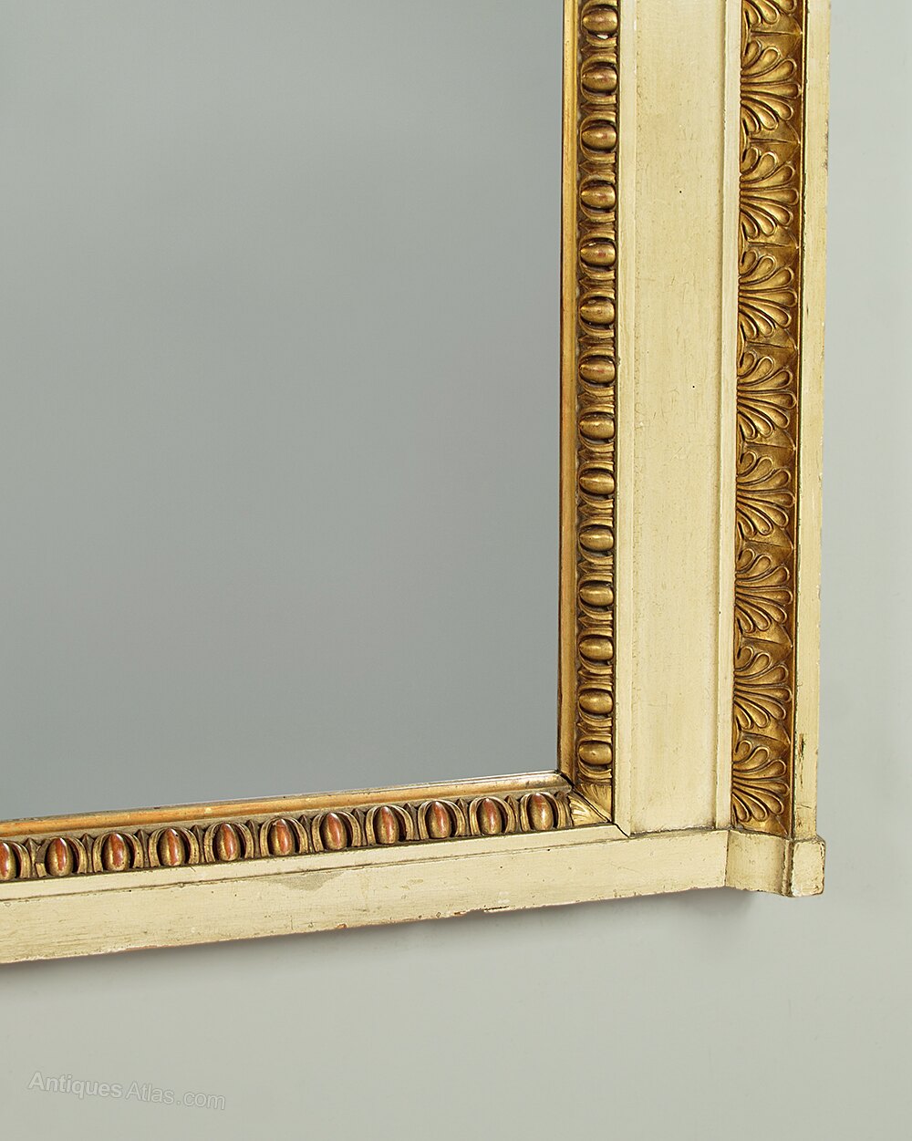 Unusual painted and gilded overmantle mirror c.1920. 38" x 28½" mirror plate within a broad painted pine frame. Large Regency style carved and gilded egg and dart moulding to the inner edge and a second border of anthemion pattern moulding at the top and sides. Some obvious old wear and the gilding is rubbed through in places to reveal the red ground below. Otherwise very good condition, fitted with a new mirror pate, cleaned and waxed in our workshops.Width: 54.5" (138.5 cm)