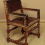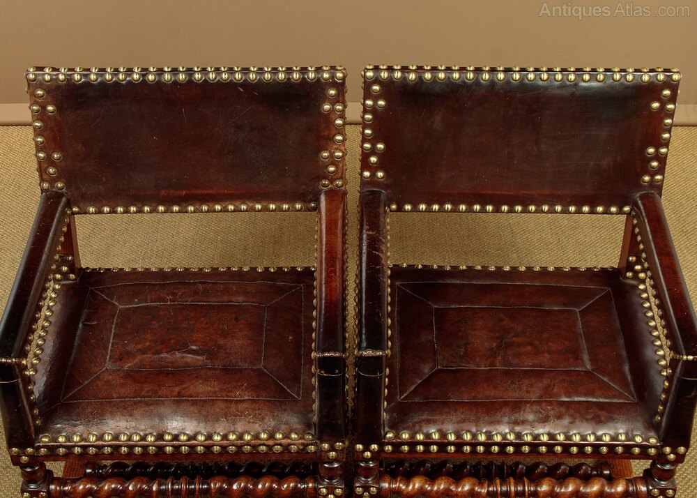 Splendid pair of 17th.c. style oak and leather armchairs c.1920. Backrests, arms and the large padded seats retaining the original brown leather covering with large decorative brass studs to the edges. Solid oak frames with twist carved, turned and block legs and stretchers. Some wear to the seats, generally very good condition with particularly good colour and patina to the leather, especially on the arms where it had been worn to a lovely smooth finish. Cleaned and waxed in our workshops.Note we also have a matching set of four chairs without arms sold separately.