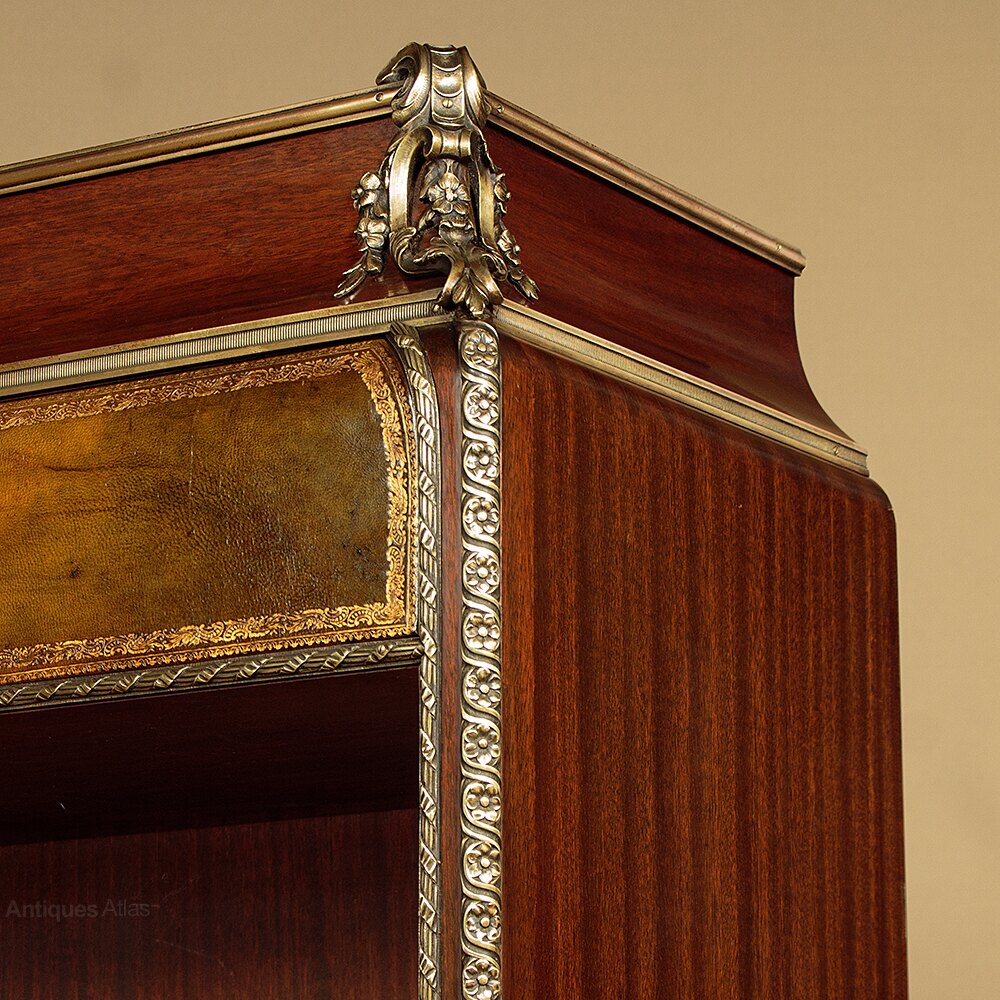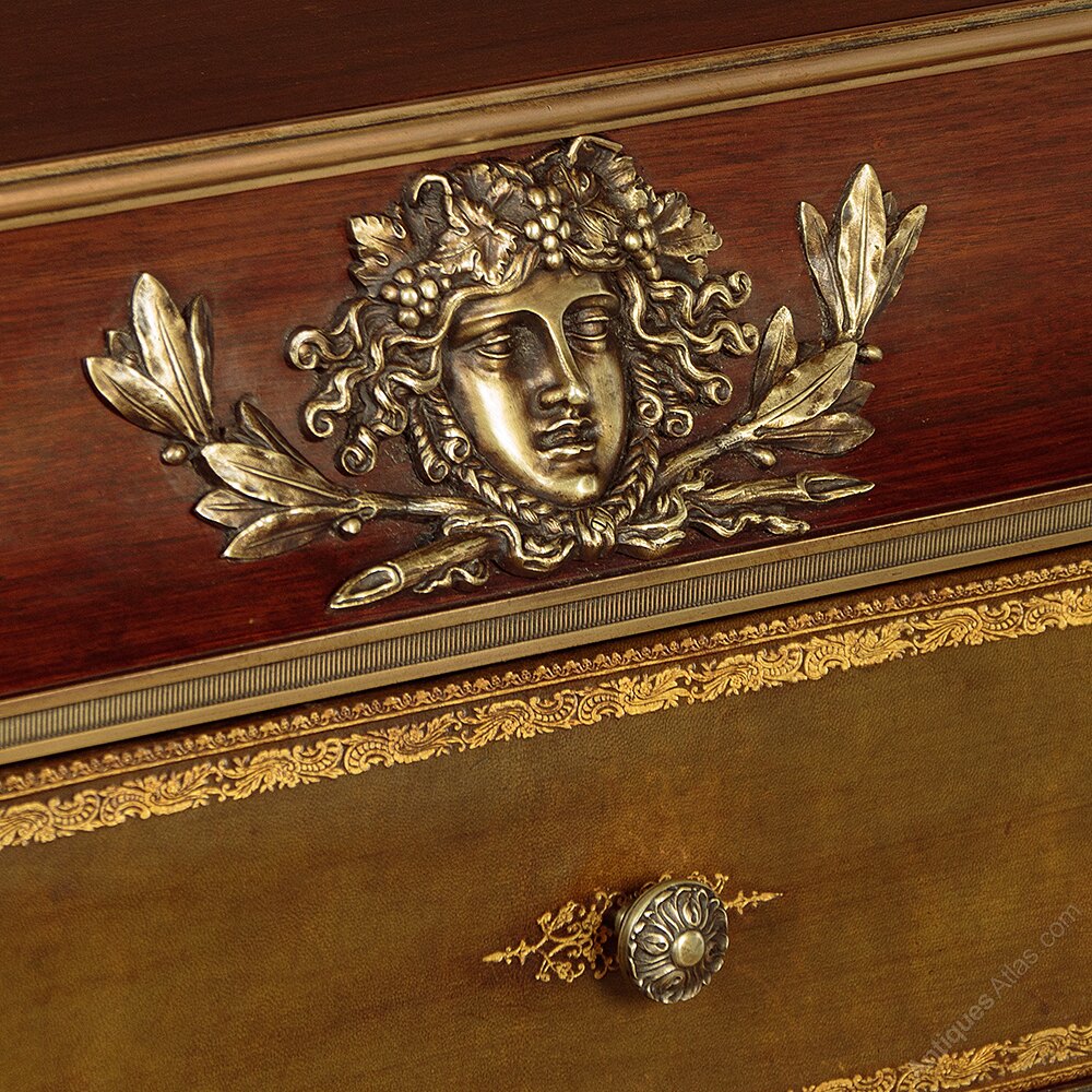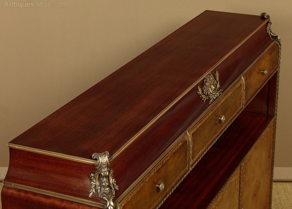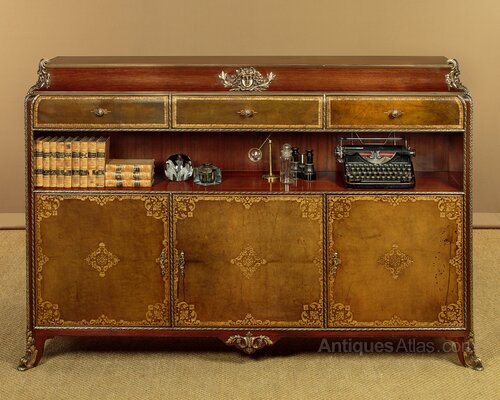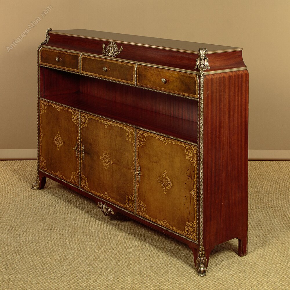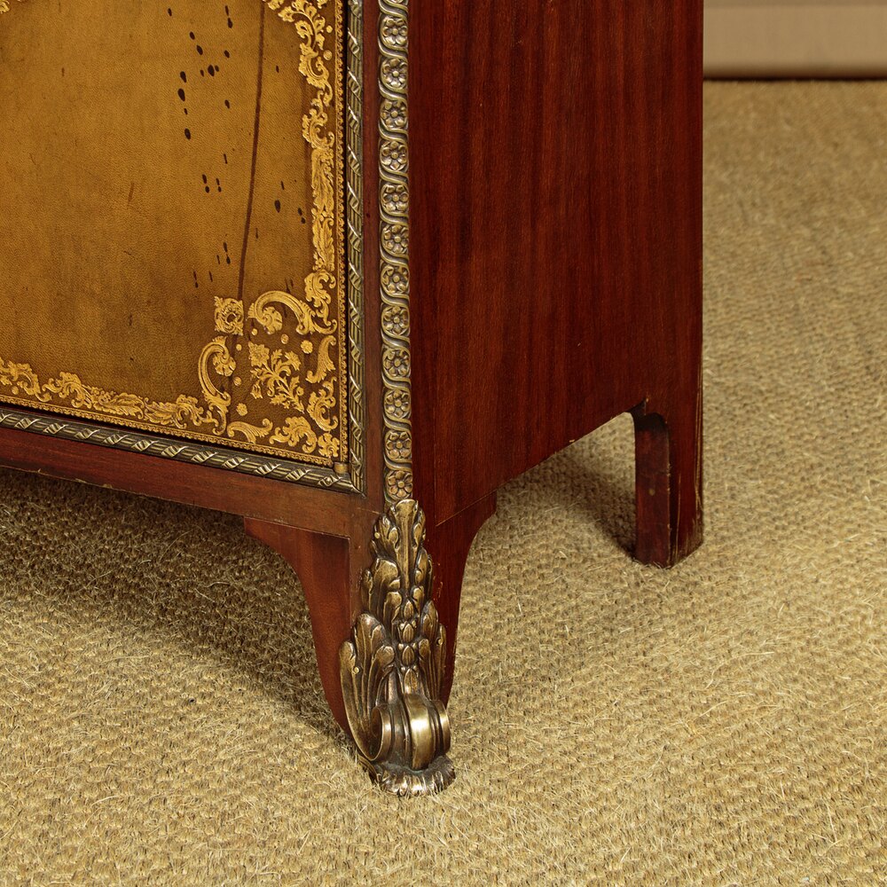 Fine quality brass mounted side cabinet by the acclaimed French cabinet makers Chaleyssin c.1950. Mahogany cabinet featuring three drawers over a long open shelf (height 8½") and three lockable cupboards below, each with a single adjustable shelf inside (internal depth 11"). Leather fronts to the drawers and doors, featuring decorative gilt tooling. Extensive and large Louis XVI style brass mounts to the moulded top, apron and feet. Plus brass mouldings, drawer knobs and escutcheons. Clearly maker's stamps and serial numbers to the rear. Inks pots or similar to the right hand door front. Otherwise excellent colour and condition with only minor wear. Cleaned and waxed in our workshops. Keys supplied.Width: 66" (167.5 cm)