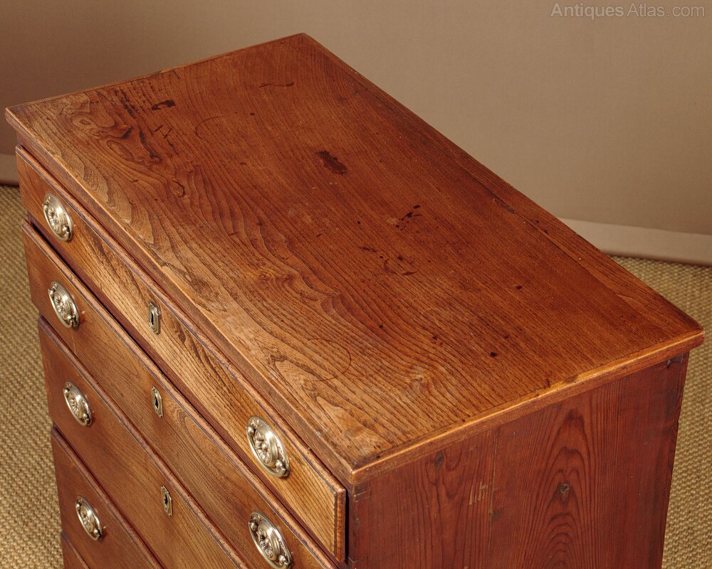 Small George III chest of drawers in elm c.1820. A charming piece of Georgian country furniture and useful small size, just 37" wide. Elm top with an applied edge over four drawers of graduated height. Solid elm drawer fronts of particularly attractive grain with moulded edges and period brass handles and escutcheons. Raised on shaped bracket feet at the front. Single piece pine sides with a shaped detail at the bottom to form the feet. Some old wear, generally very good condition and lovely honey coloured timber. Cleaned and waxed in our workshops.Width: 37" (94 cm)