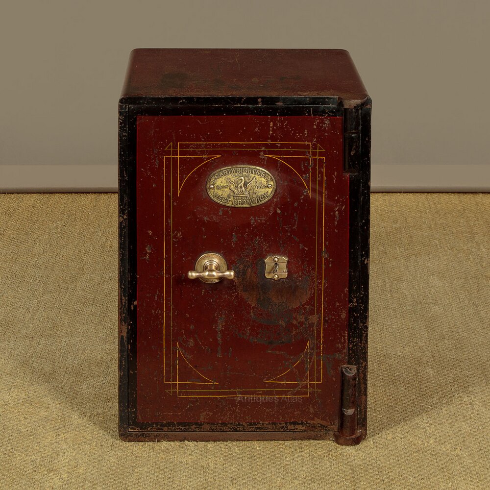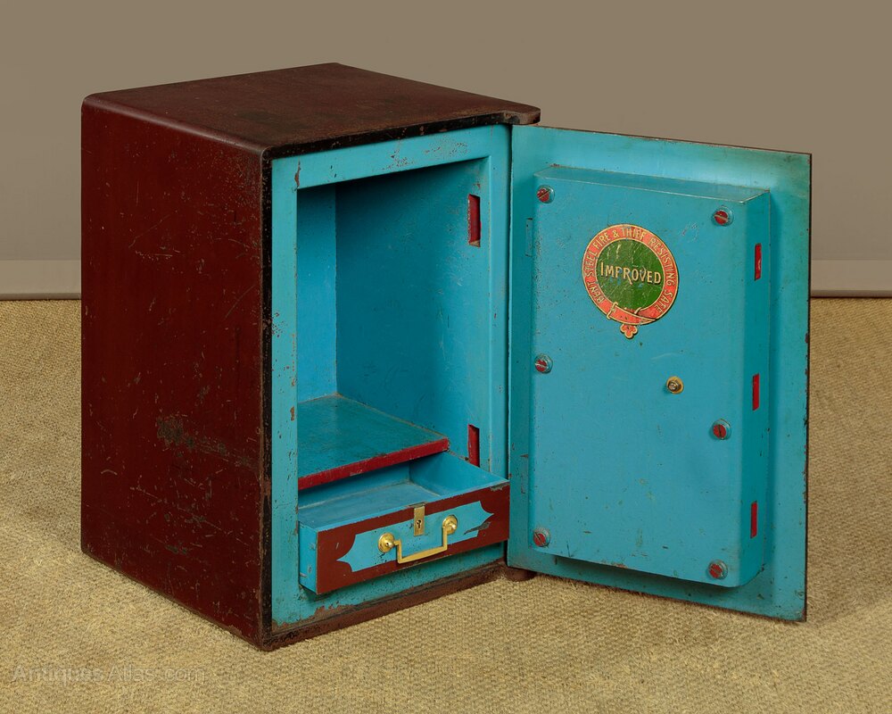 Very useful late 19th.c. steel safe or strong box by the makers Cartwright & Sons of West Bromwich c.1890. Three inch thick door opening with the original key, internal dimensions 12.5" x 10" x 16.5". plus a small lockable drawer in the base. Splendid large embossed brass plate on the front of the door featuring the company’s registered trademark (dated 1840) with a phoenix rising from the flames (these safes were designed to be fireproof). Brass handle and keyhole and original paintwork to the exterior and interior. Original polychrome label inside the door. Some wear to the paintwork, generally very good functional condition. Cleaned and waxed in our workshops. Keys supplied for the door and drawer.Width: 18" (45.5 cm)