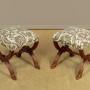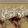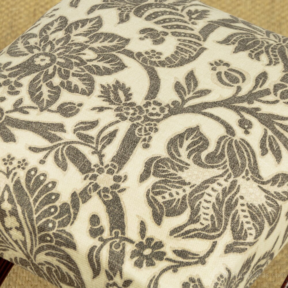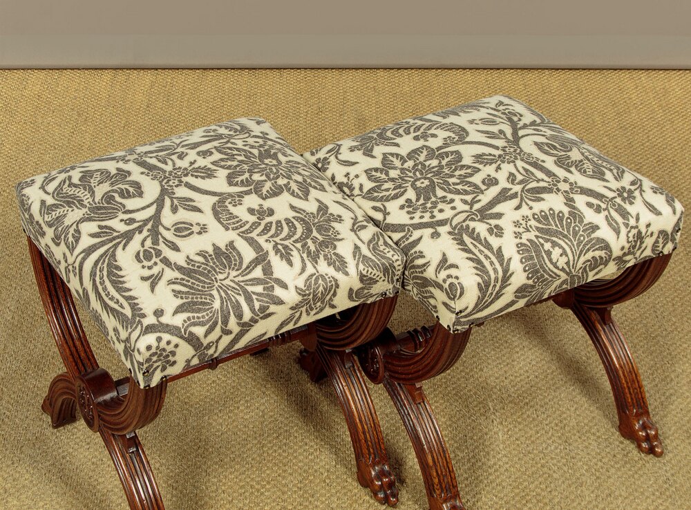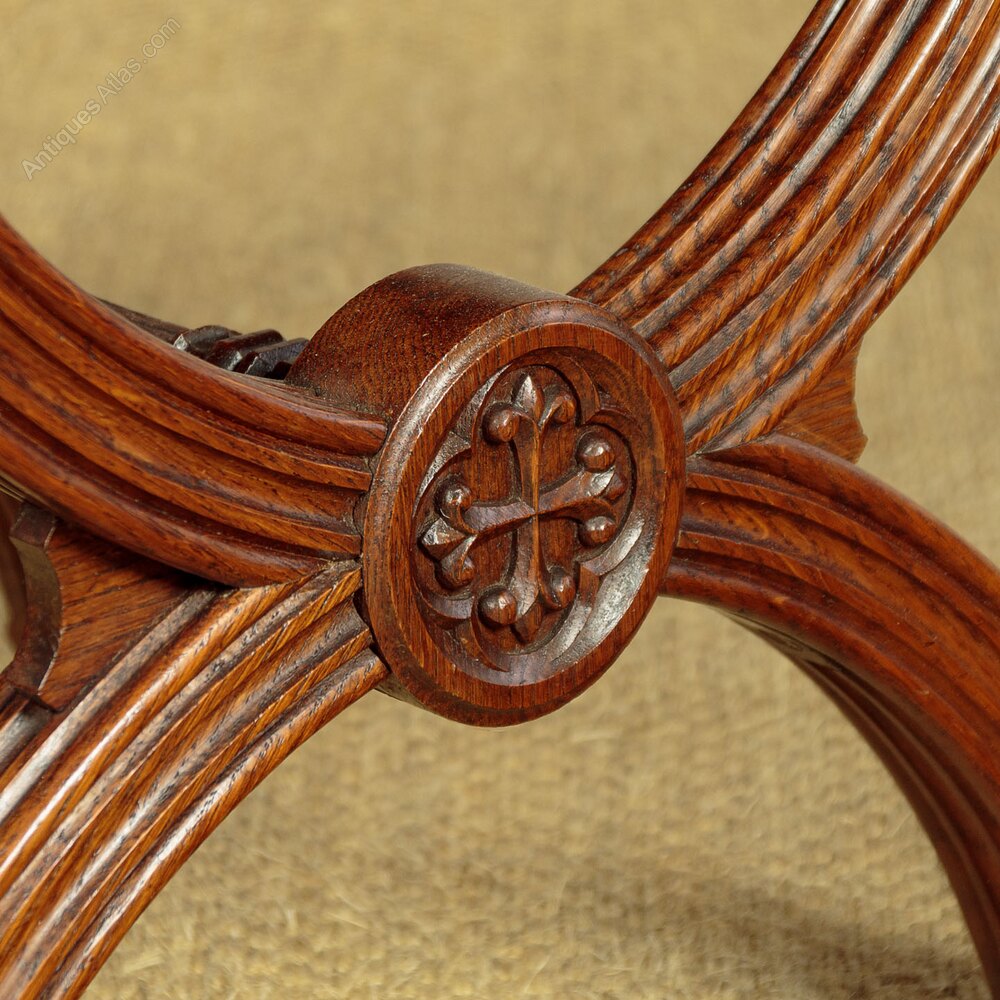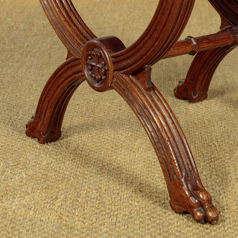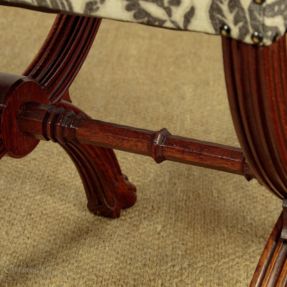 Splendid pair of Gothic revival oak stools c.1880. Sprung seats freshly upholstered in a damask prink linen. Superb X shaped frames in solid oak. Moulded legs with claw feet, joined with octagonal carved stretchers. Note the Gothic patonce crosses carved on the ends of the stools. Excellent condition, cleaned and waxed in our workshops.Width: 18" (45.5 cm)
