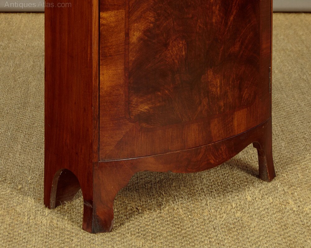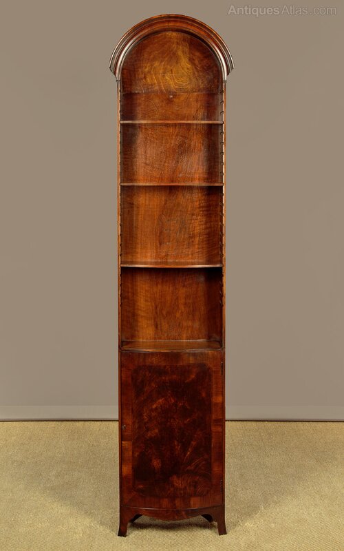 Elegant early 20th.c. mahogany bow front 'pencil' bookcase c.1930. Just 19" wide, arched top with moulded cornice. Over four shelves (max depth 7½"), three of which are adjustable, plus a useful cupboard in the base with a single shelf inside. Well figured mahogany veneers to the inside of the back and to the door panel with also has a crossbanded and inlaid border. Solid mahogany sides. Shaped apron and legs . Excellent condition, cleaned and polished in our workshops. Key supplied.Width: 19" (48.5 cm)