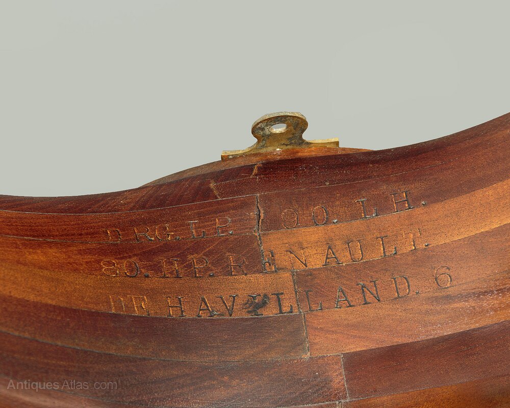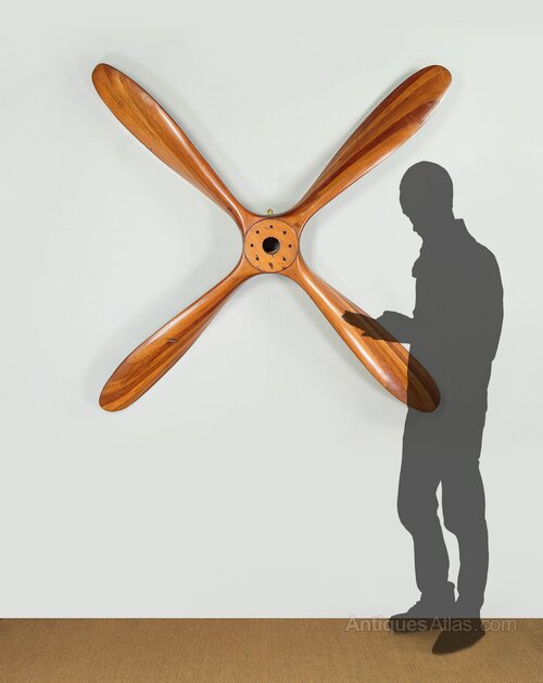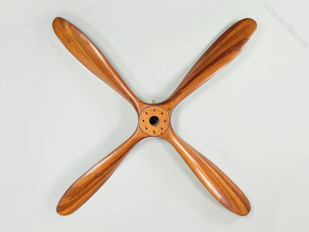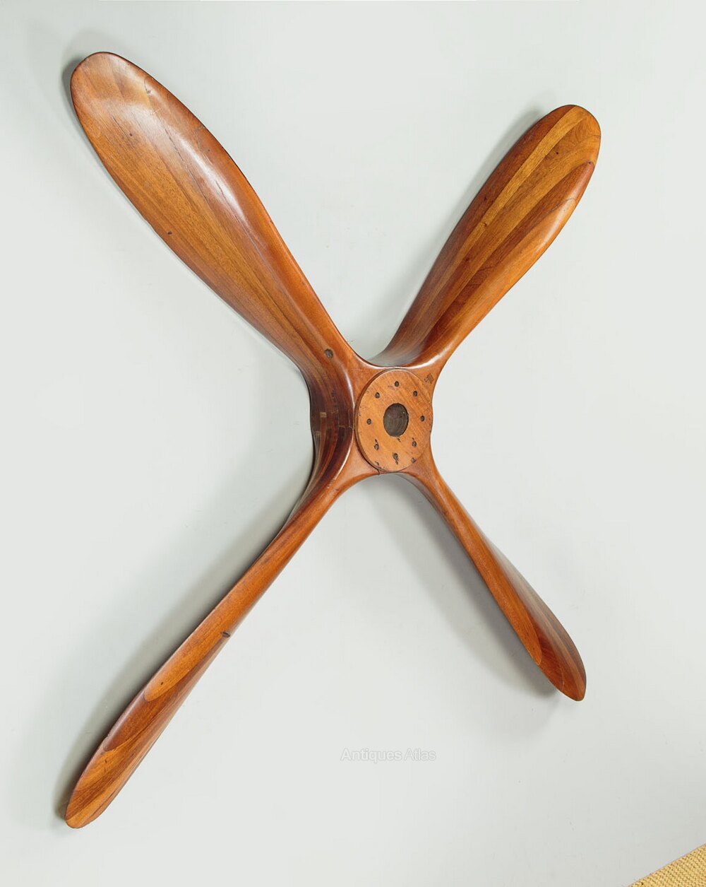 Splendid large four blade aircraft propeller c.1914. Beautifully shaped from laminated pieces of solid mahogany. With eight (rather than the later 6) bolt holes around the hub. Stamped '80hp Renault De Havilland 6' ,the propeller is most likely taken from an Airco D.H 6 a biplane specifically designed by de Havilland to train pilots for Royal Flying Corps during the First World War and powered by the Renault 80 hp V8 engine. Stamped with various serial numbers and several A.I.D (Aeronautical Inspection Department) marks. Some minor wear, but generally very good condition. Cleaned and waxed in our workshops.Measuring 79" (201cm) diagonally from tip to tip, when mounted on the wall it would occupy a 56" (142cm) square space.