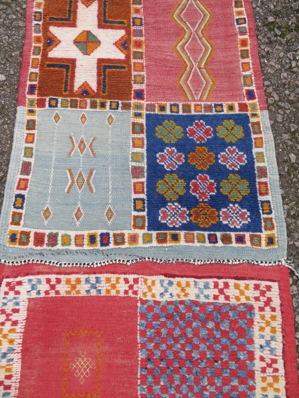 Berber tribes of the Ait Ouaouzguite, High Atlas region,The design is a combination of piled and flat woven geometric designs within rectangular panels.