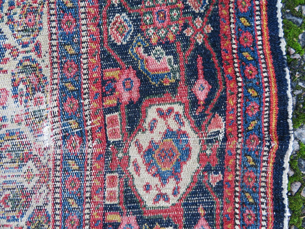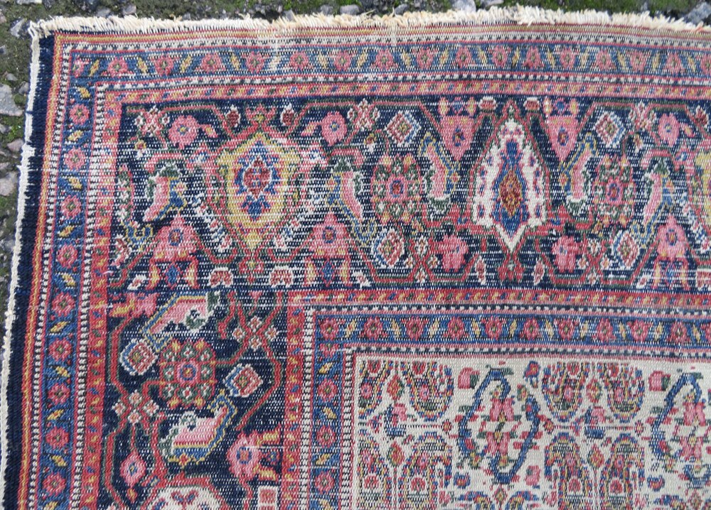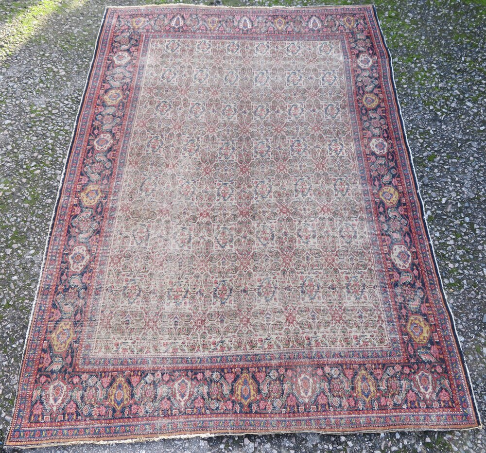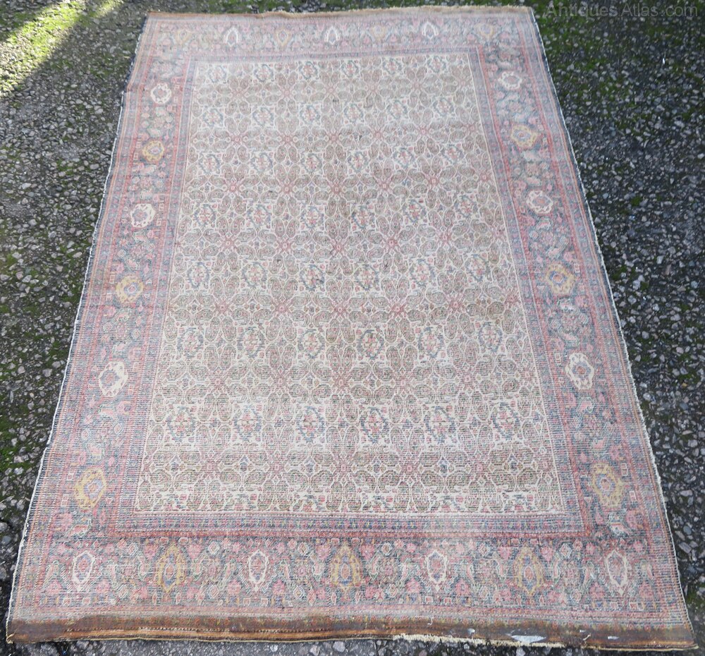 West persia. Circa 1870very old fereghan rug with a nice worn all over country house look. Central design of clusters of botehs in a repeat pattern. Even though well worn you can still see the striking yellow and green colours. Priced accordingly. All over very low pile. End losses and side cord losses although all even. I did hand wash it,last images. 6 foot 7 inches by 4 foot 4 inches. 200cm x 132cm. At widest points. Wool on cotton structure. U. K post £20. Now selling very competitively priced rugs at prices that won''t break the bank. Collections/viewings,advice,all catered for. Don''t like worn rugs plenty for sale in better restored conditions and everything in between. Fos 185. Purveyors of unusual rare distinctive quality tribal rugs & carpets,howard & sons seating,some orientalist items & decorative objects for the everyman.