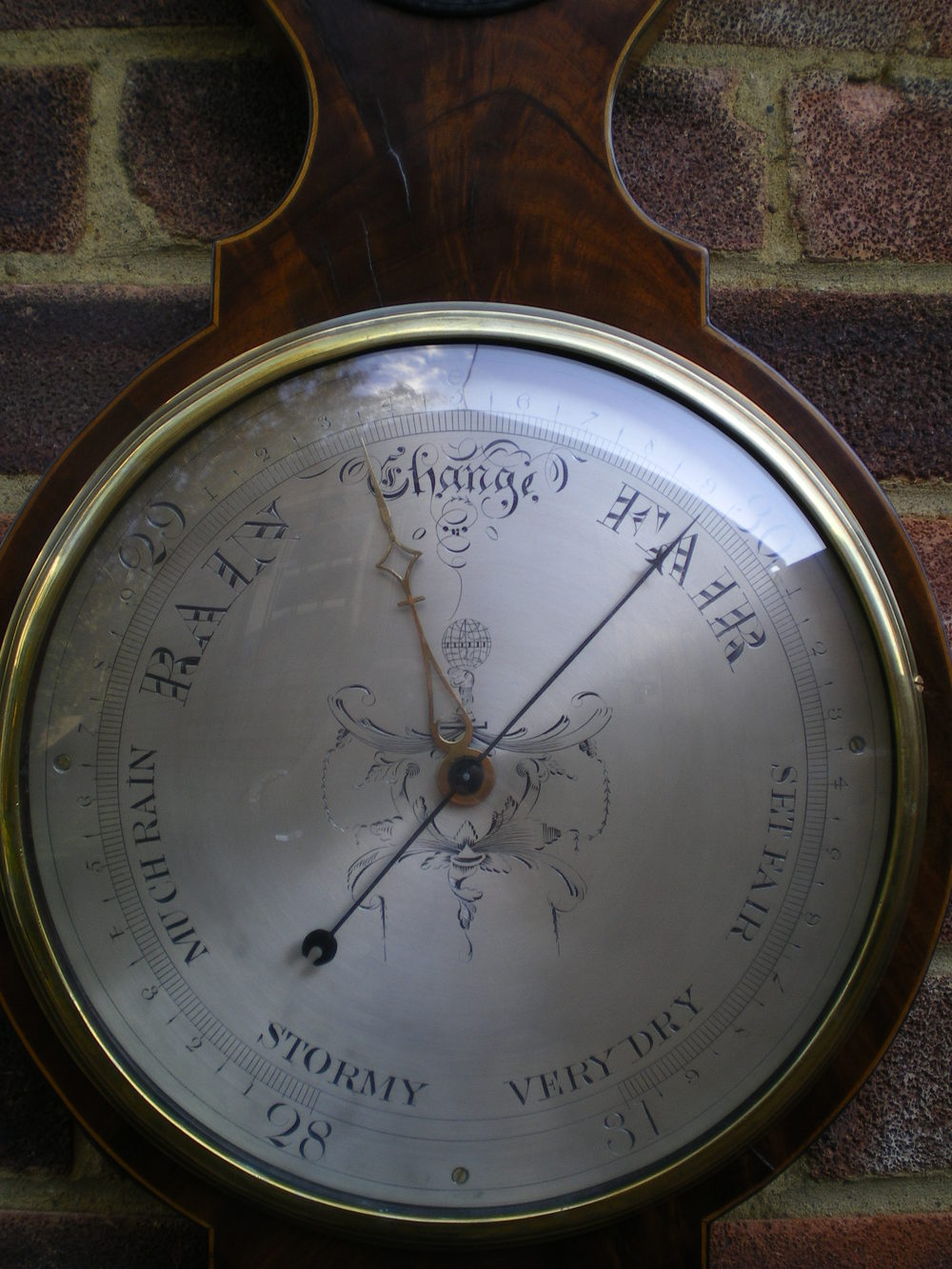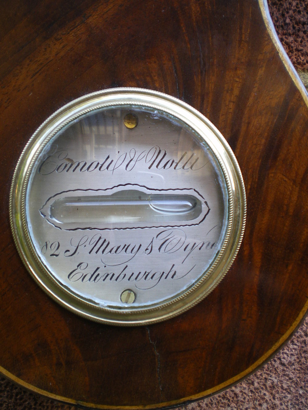 Georgian mercury wheel barometer by Comoli and Nolli, 12, St. Mary`s Wynd, Edinburgh. 10” dia dial. Mahogany case with ebony and boxwood edge lines, with swan neck pediment and urn finial. Additional hygrometer, mercury thermometer, mirror, and level bubble.DateGeorgian :