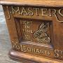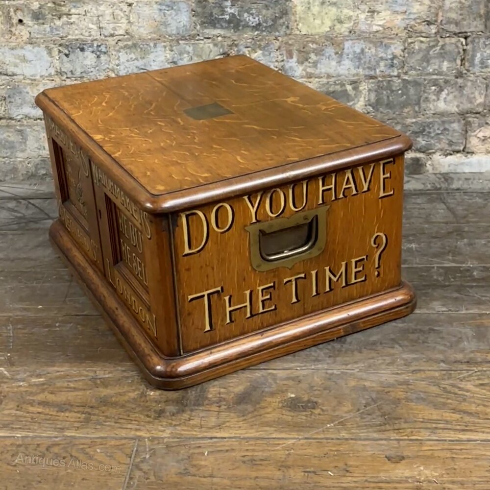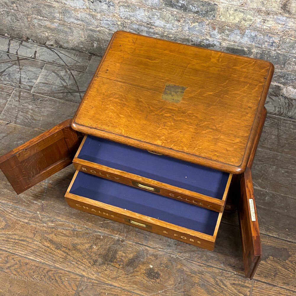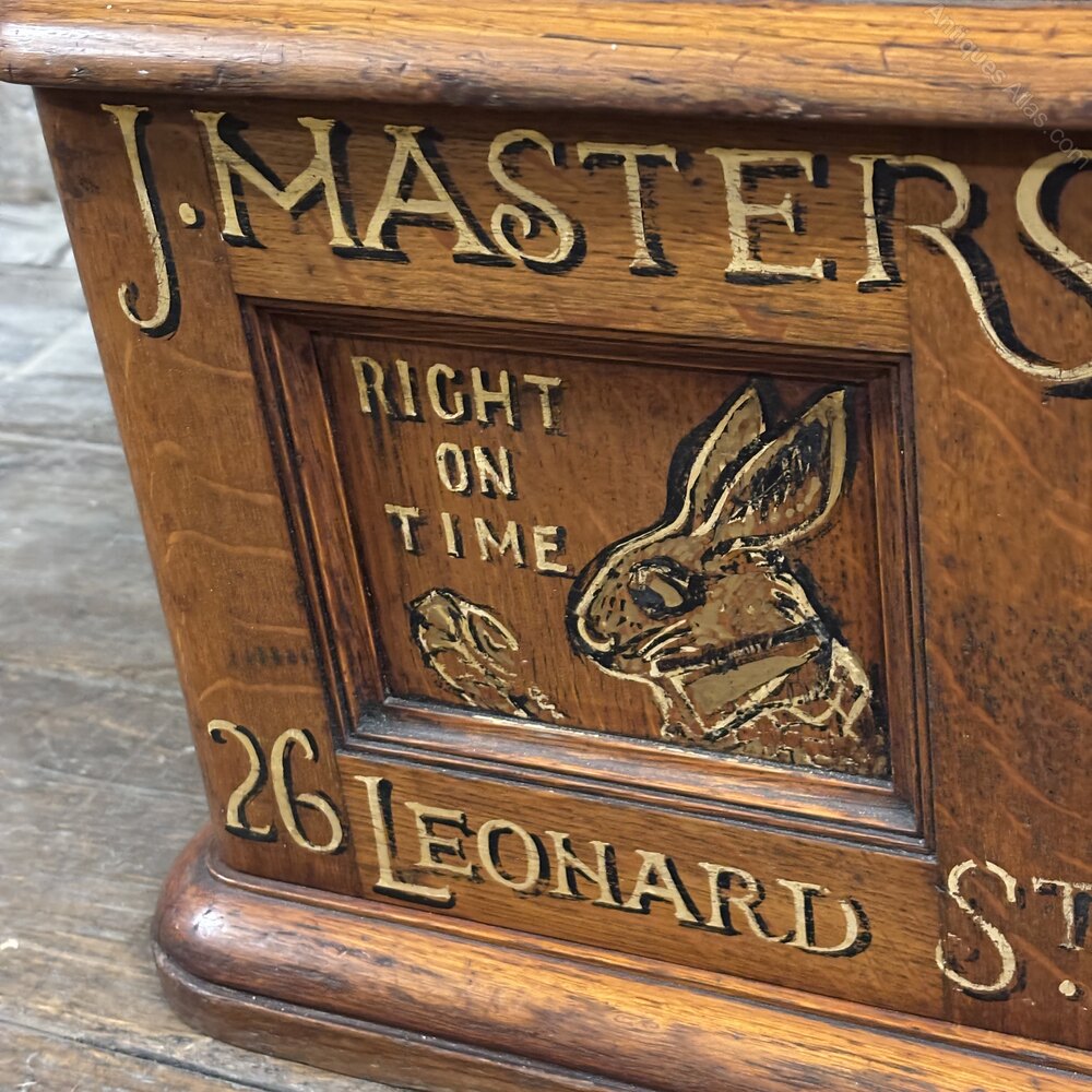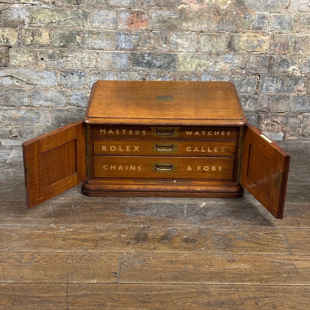 An early 20th-century oak countertop cabinet, originally made by Manoah Rhodes & Sons Ltd, Silversmiths, Bradford. Constructed in solid oak with rounded edges, brass drawer handles, and a brass plaque to the top.The double doors open to reveal three fitted drawers with gilt lettering for Masters Watches, Rolex, Gallet, Cartier, Patek Philippe, Chains & Fobs — each beautifully lined in blue baize. The exterior is later hand-painted with bold and humorous watchmaker’s signage, including “Do You Have the Time?”, “Masters of Time”, and “Right on Time” above a hare motif, making it a newer addition.