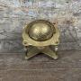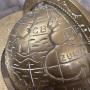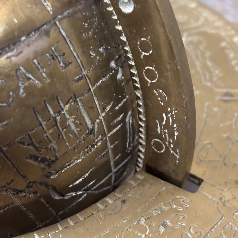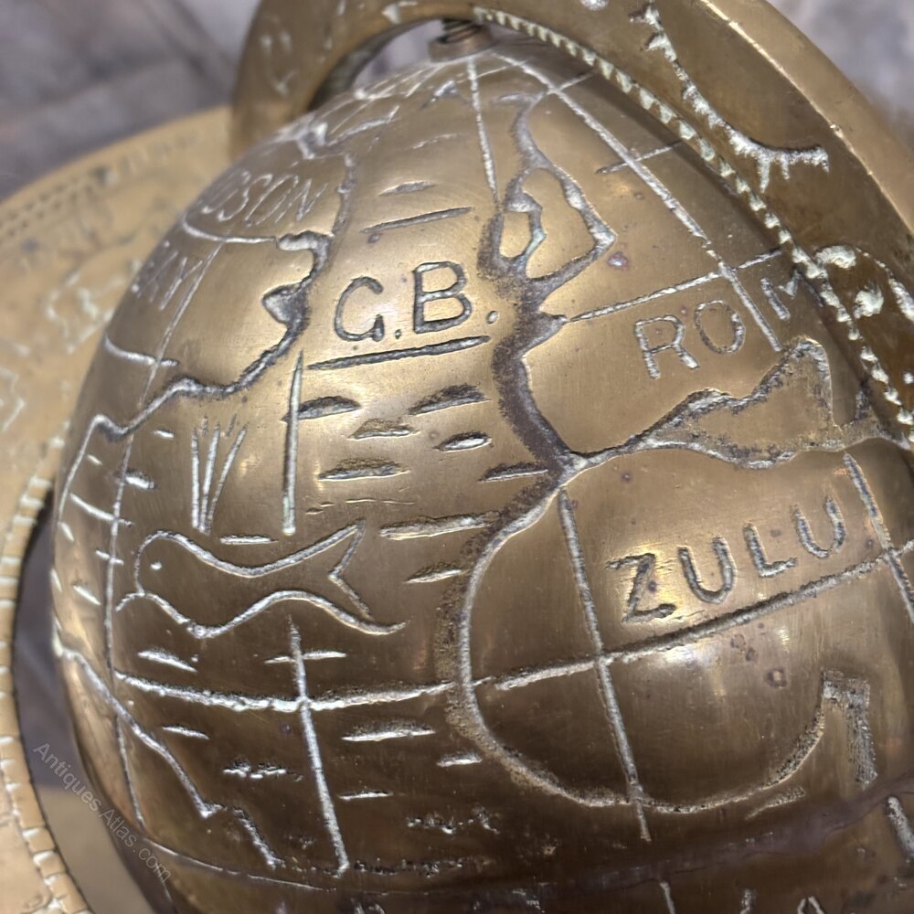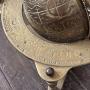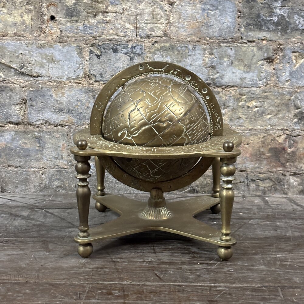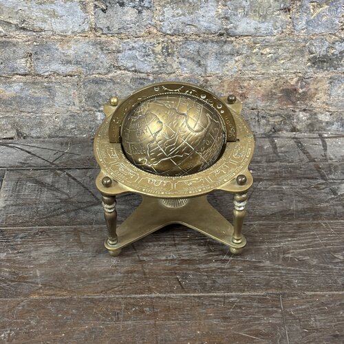 A mid-20th-century cast brass desk globe featuring engraved continents, zodiac symbols, and calendar markings. The rotating globe sits within a fixed astrological band, supported on a tripod base with turned column legs and ball finials. The surface carved with both geographical and decorative details, including “G.B.”, “Zulu”, and “Cape”.H: 29 W: 22 D: 22 cm