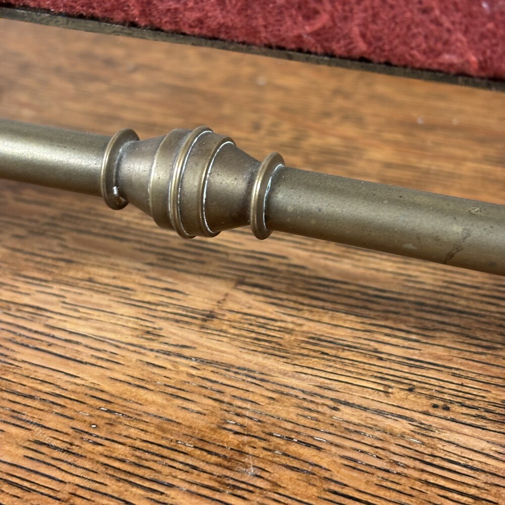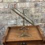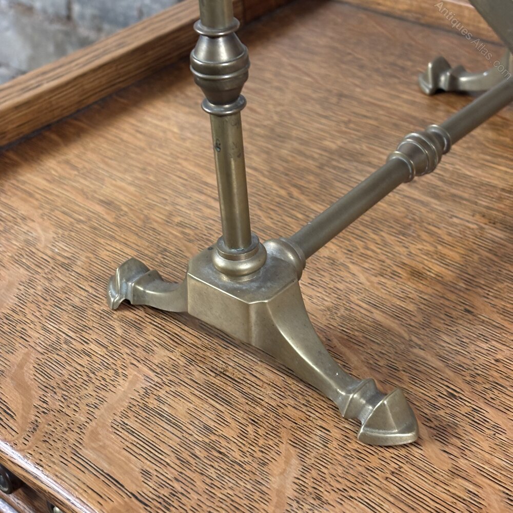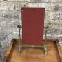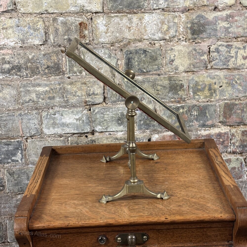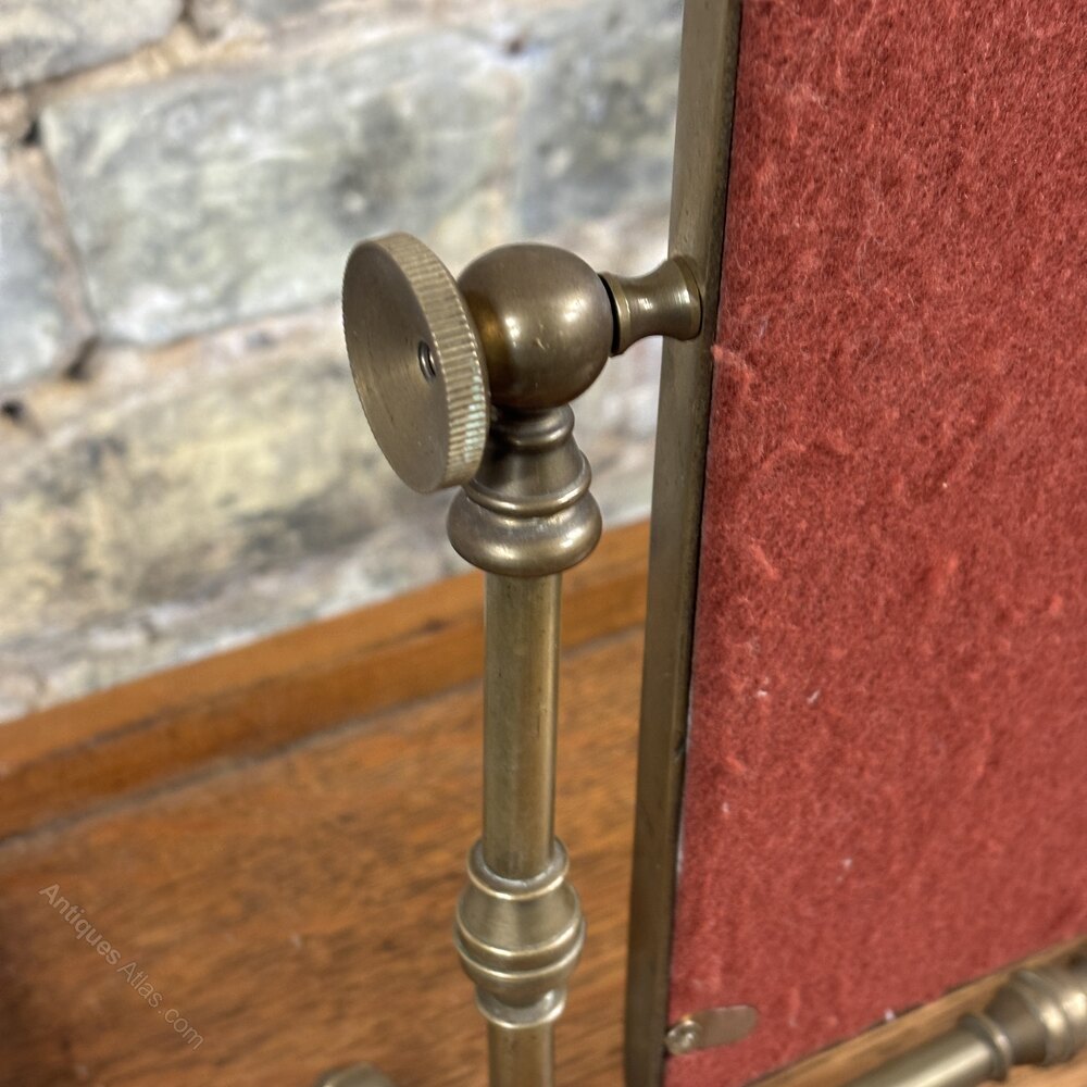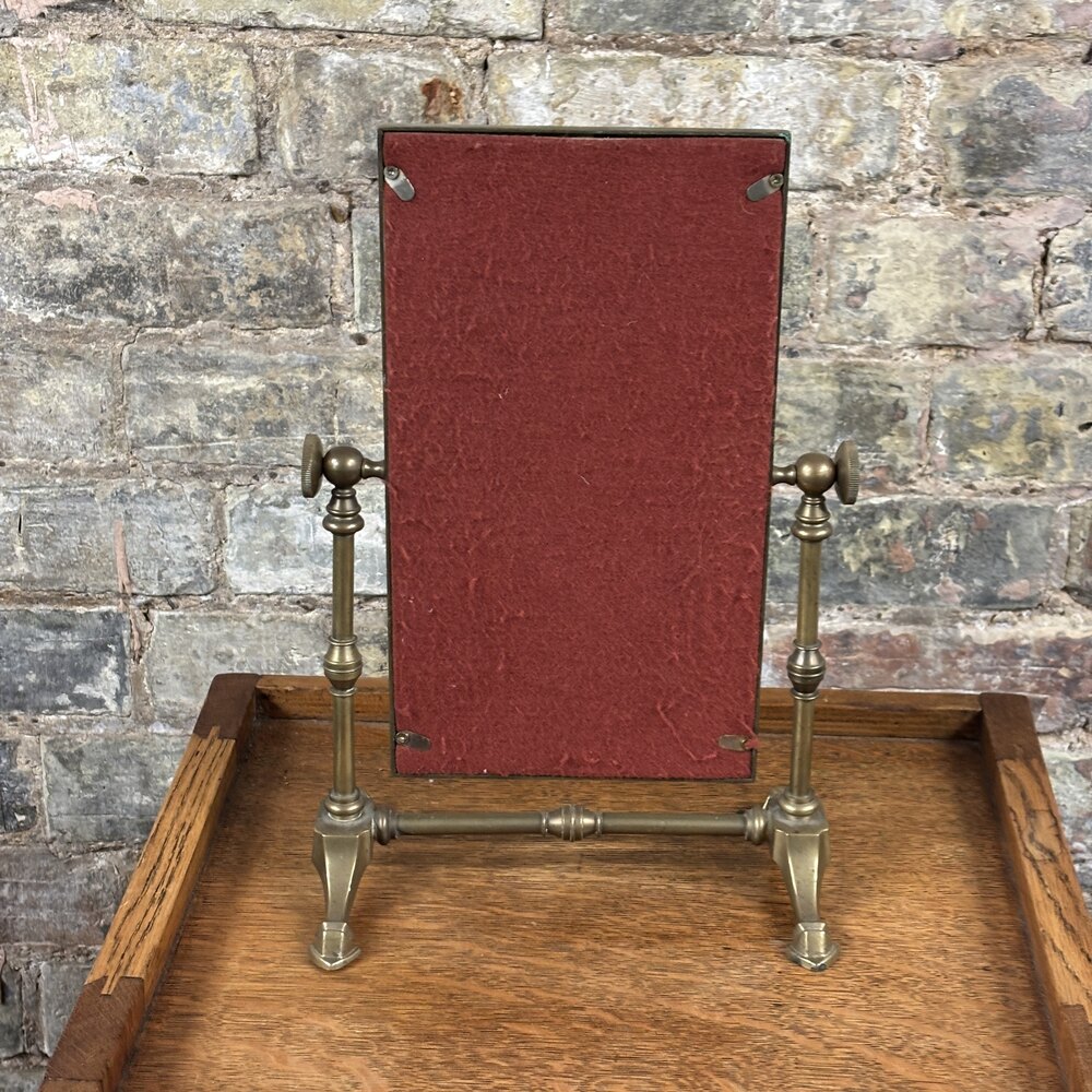 A fabulous petite early 20th-century brass dressing table mirror with adjustable tilt mechanism. The rectangular mirror sits within a solid brass frame, supported on turned columns and joined by a shaped stretcher. It stands on elegant, architectural feet, giving it a refined and well-balanced form.Would look great on a dressing table, as a decorative display piece, or on a shop counter.