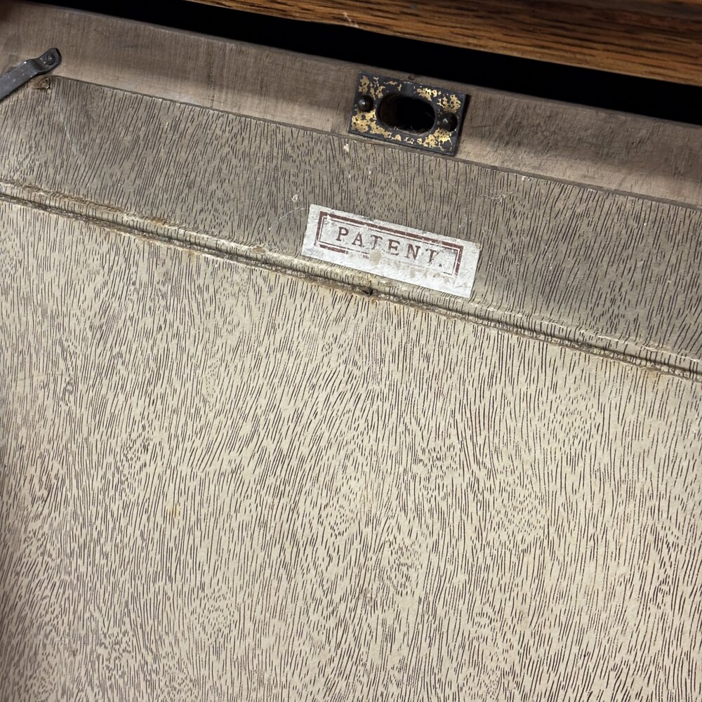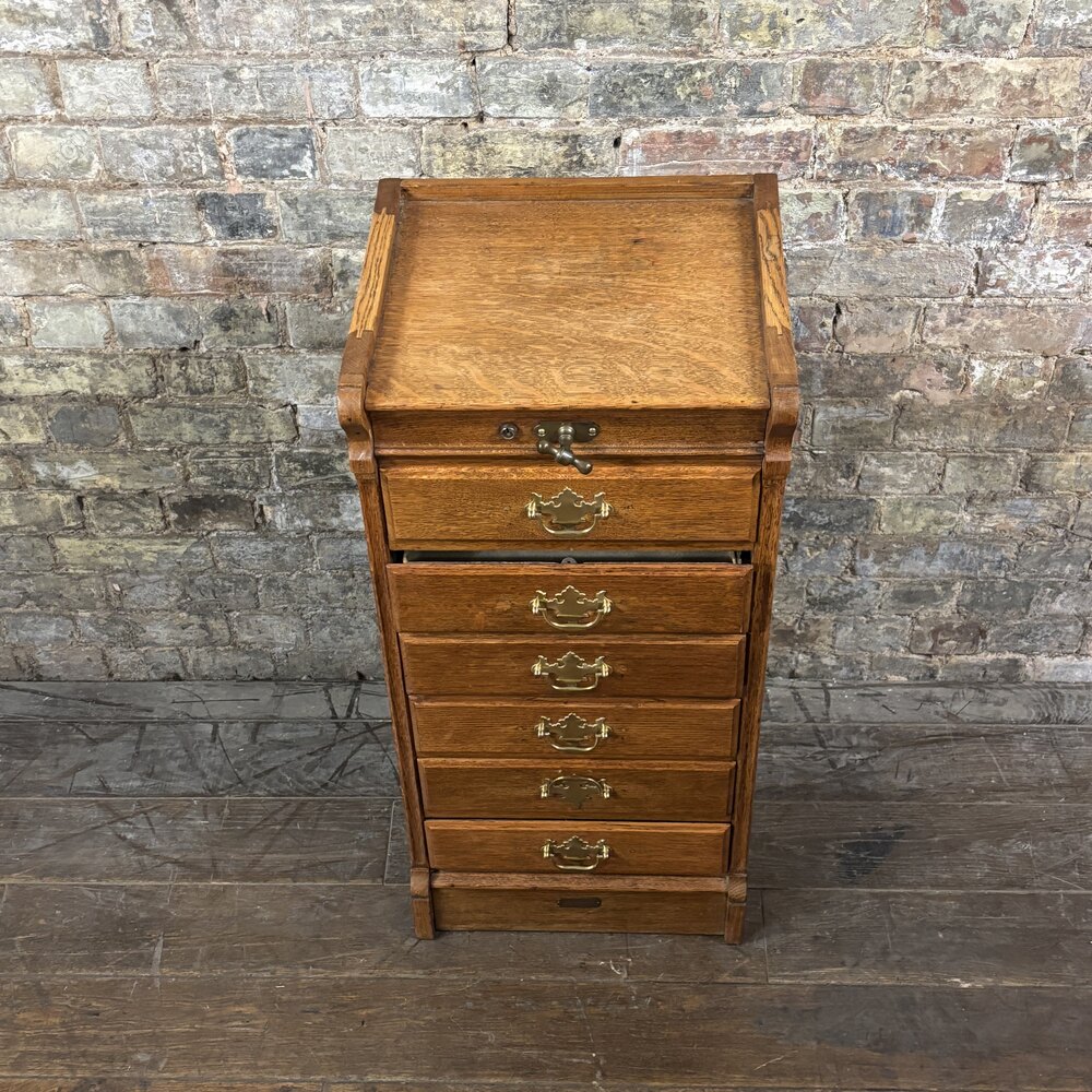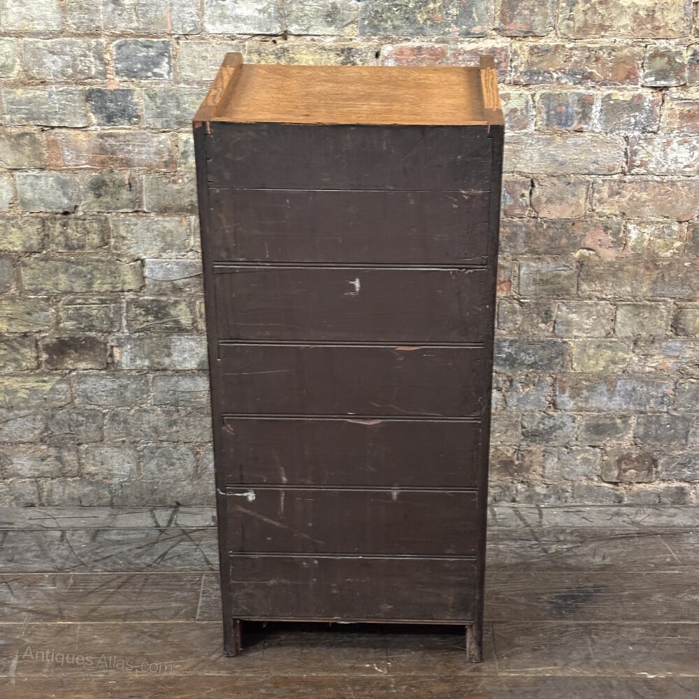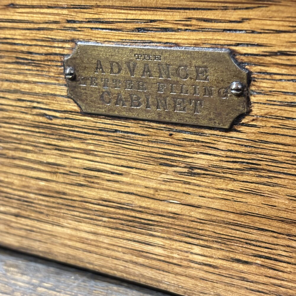 A superb solid oak 1920s oak filing cabinet, marked “The Advance Letter Filing Cabinet”. This finely made office piece features six drawers along with the stamp “PATENT”. This Cabinet was originally designed for organising letters and paperwork in a commercial or solicitor’s office. Marketed under the “Advance” brand, this patented filing system was supplied through specialist British office outfitters, firms such as Globe-Wernicke and Office Specialty.The cabinet has been refinished, ensuring the timber presents beautifully while preserving both the original fittings and the period filing mechanism.