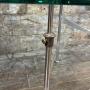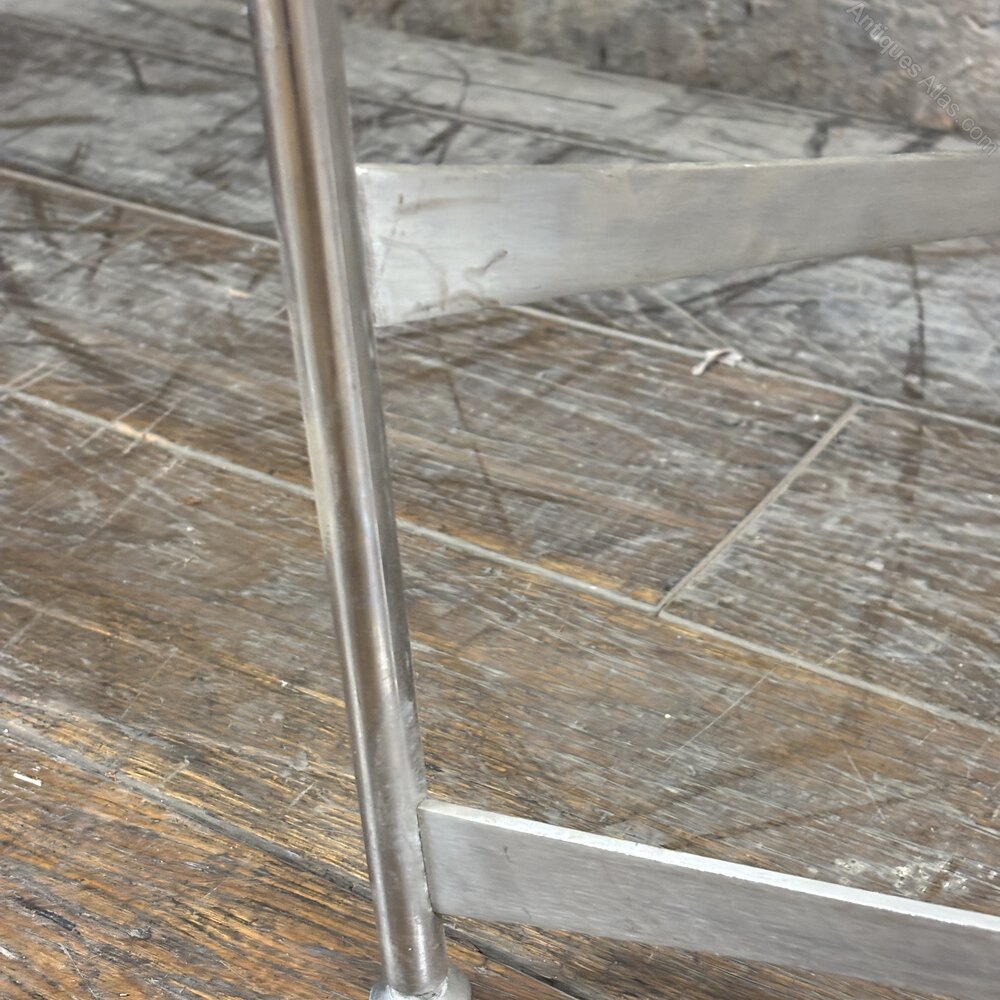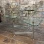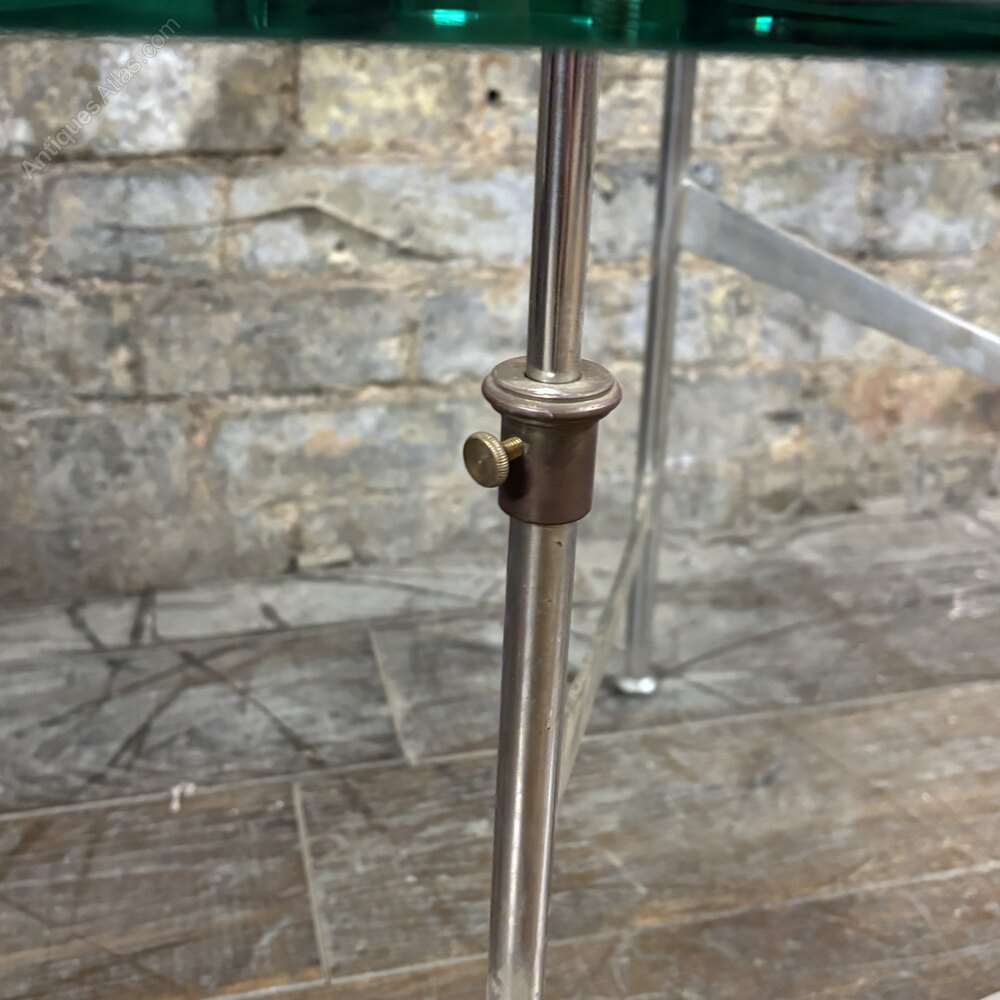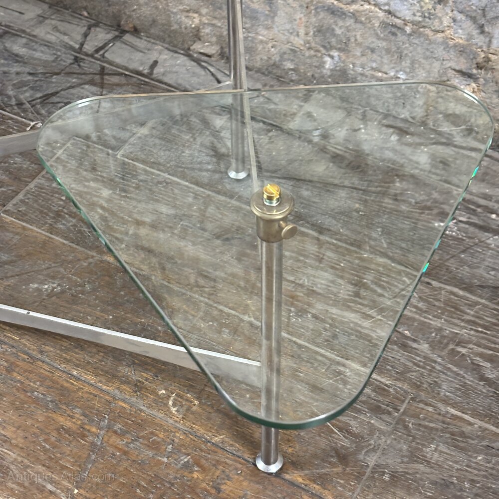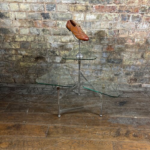 A stylish mid-20th-century retail display stand featuring three triangular glass shelves supported on a chromed tubular steel frame with brass adjusters. Each tier can be adjusted in height, allowing for flexible presentation of products.Ideal for displaying shoes, accessories, or decorative objects.