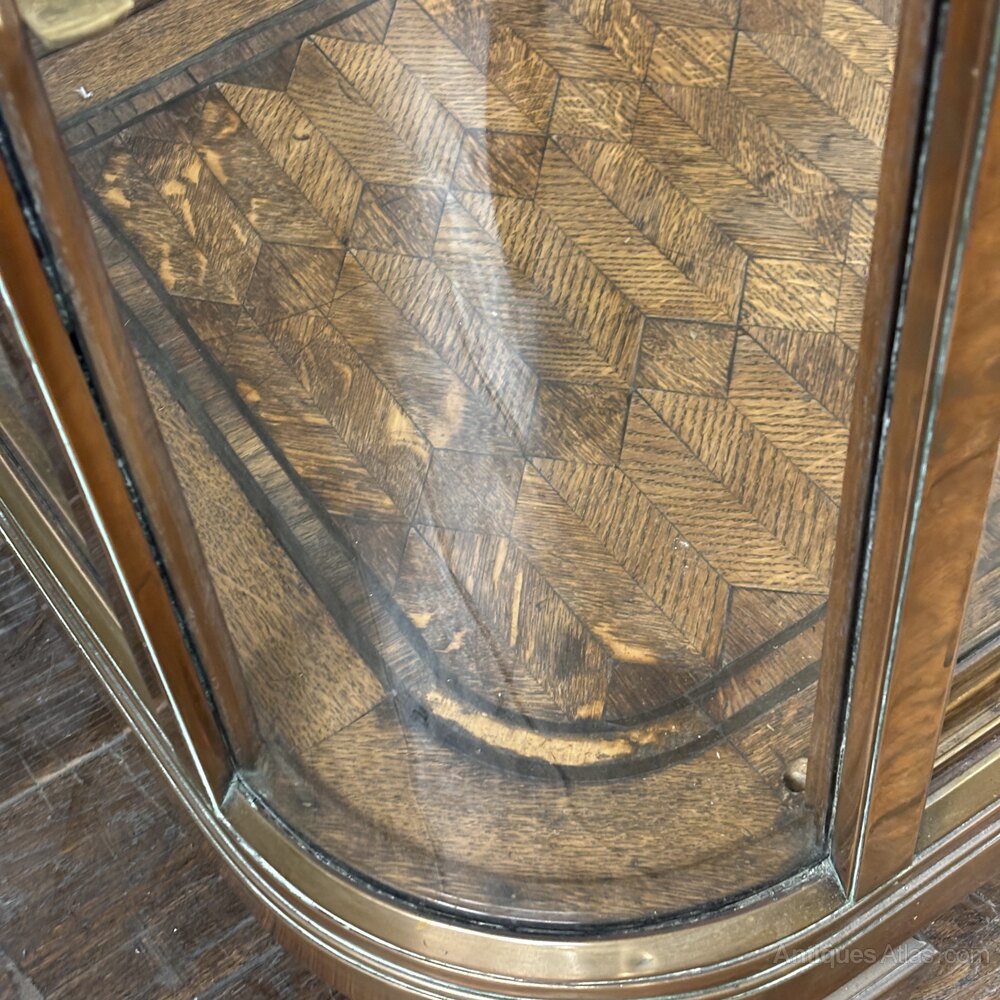 An early 20th-century Art Deco display cabinet, featuring a Brass-framed structure with bowed glass sides and geometric pyramid corner accents. The cabinet stands on short square feet and retains its original oak parquetry inlaid base, showcasing a striking geometric grain pattern. With original glass.A fabulous example of early 20th-century craftsmanship, ideal for use in retail, gallery, or residential interiors.