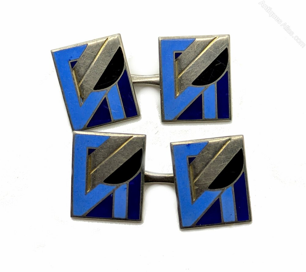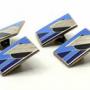This is a highly collectable pair of 1930s Art Deco cocktail cufflinks with plenty of Jazz Age panache. Made of shiny silvered metal, with a geometric enamelled pattern with a striking zig zag of black and blue enamel. These connect with a bar and hook. Certainly can't be confused with any other era can they? Condition is excellent with minimal signs of age. Ideal for today's dapper gentleman.All our jewellery is sent out in a complimentary gift box via first class FREE delivery.