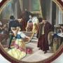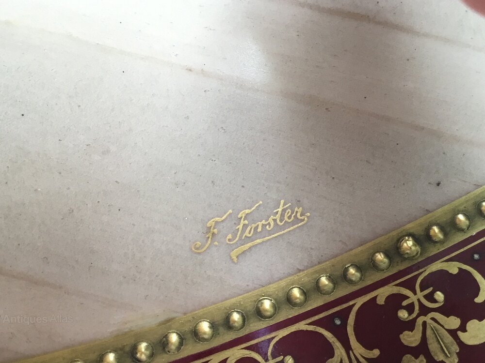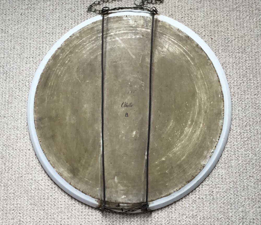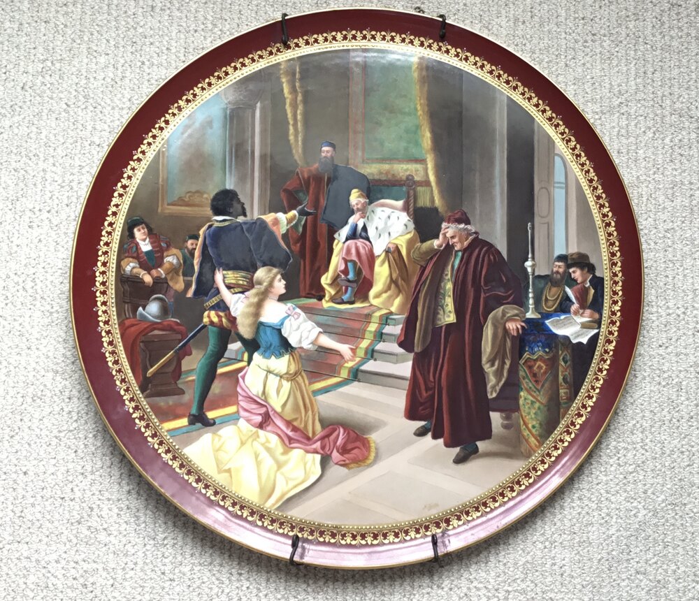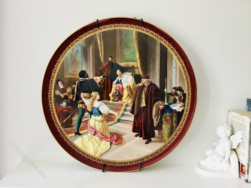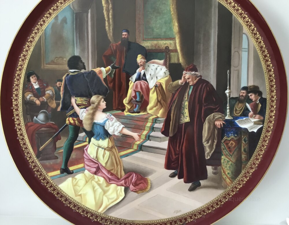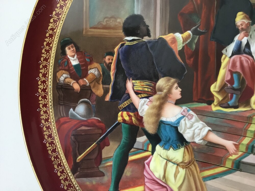 Antique Large Vienna Handpainted Plaque with a scene from Othello by William Shakespeare.Painted about 1870/ 1880 this is an exquisite example of Vienna Porcelain. Signed F.Forster in the lower right hand side of the plaque. F. Forster was better known as Alexandre Forster. The plaque is circular in shape and the painting covers the majority of the surface apart from a maroon coloured border with gold leaf design and jewelled edge. The quality of the painting on this plaque is superb and the colours are still rich and vibrant.