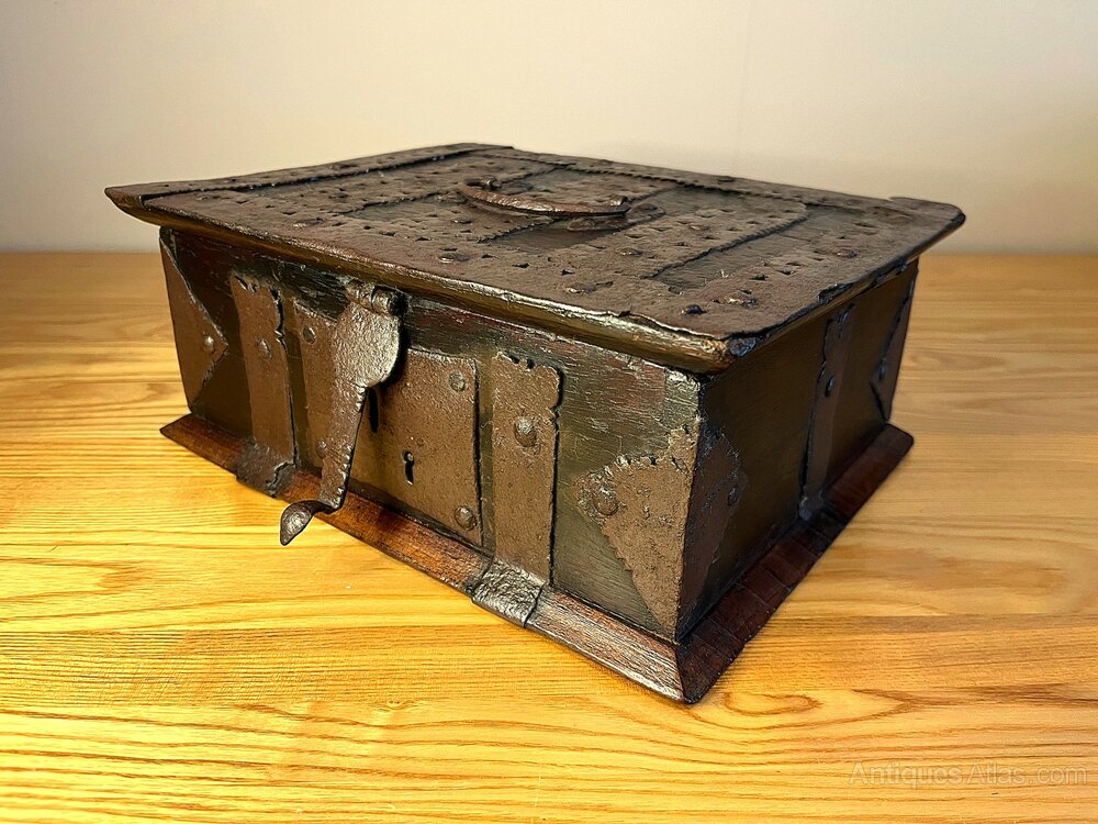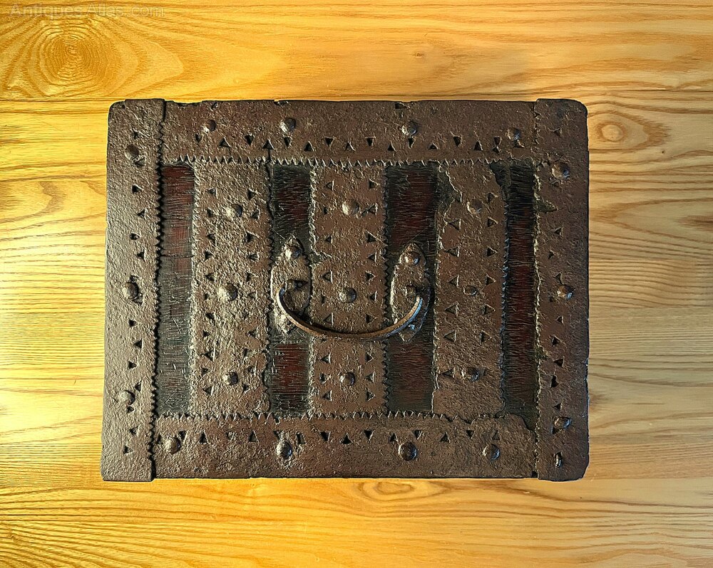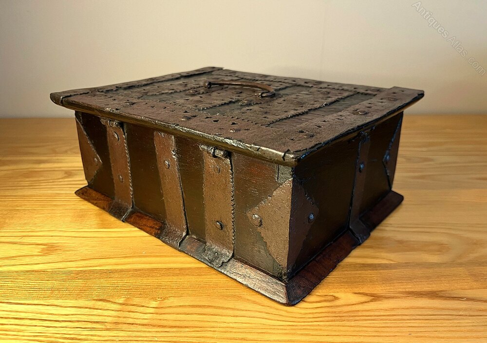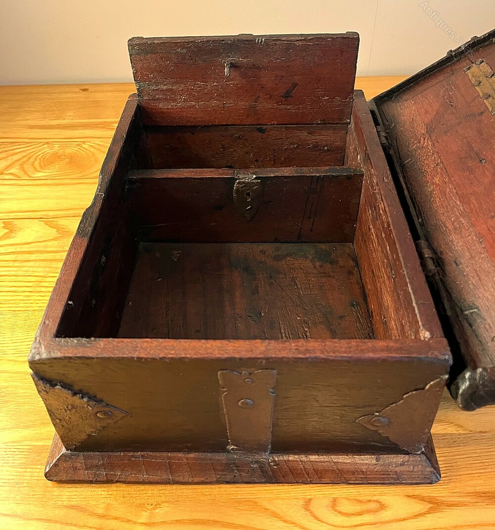 A beautiful hardwood iron-bound Indo-Spanish box dating to around 1650. As can be seen in the photos, inside the box is a small wooden till compartment which was also lockable at some point. The box is 26.2 cm wide, 20.5 cm in depth, and 10.5 cm height. A very rare and stunning box.If you have any questions, please get in touch.