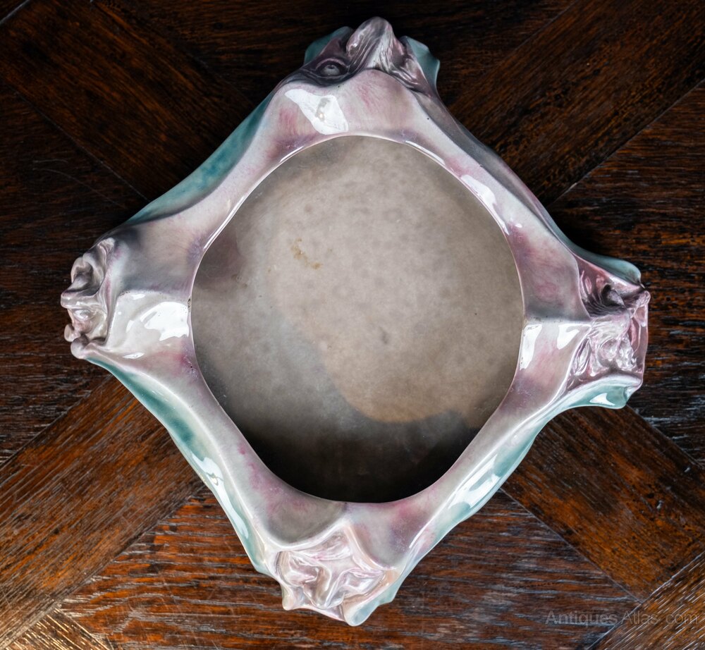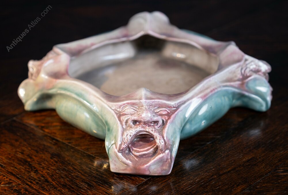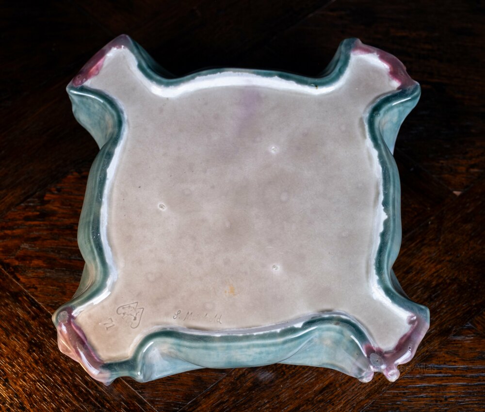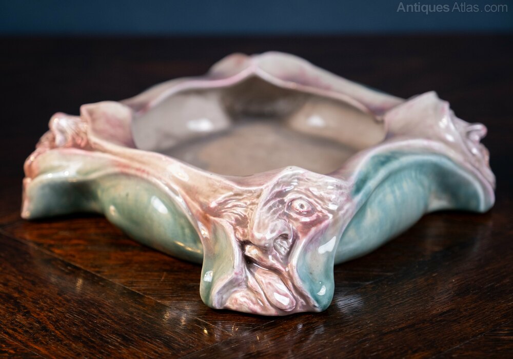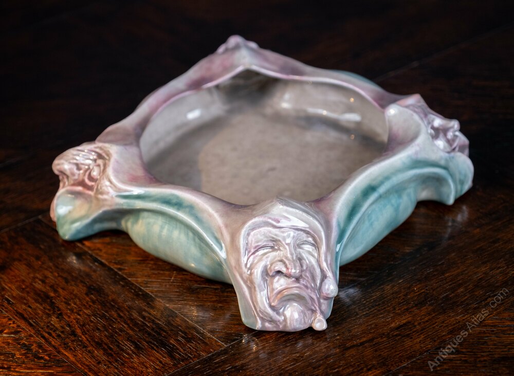 An extraordinary large 19th century bowl depicting the characters of Charles Dickens' 'A Christmas Carol' by Meinhold Brothers, Schweinsburg, Germany. The press mark to the base dates the piece between 1889 and 1905.The bowl is of flat square form with wide relief corners, each revealing an intricate face, namely Scrooge and the ghosts of Christmas past, present and future.