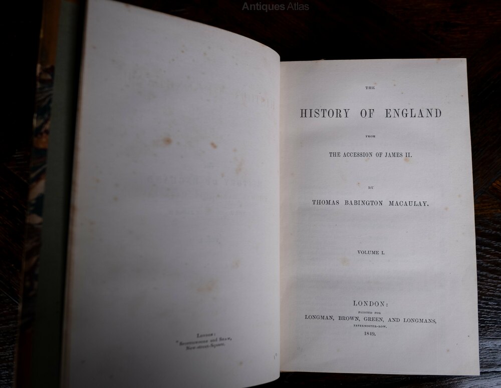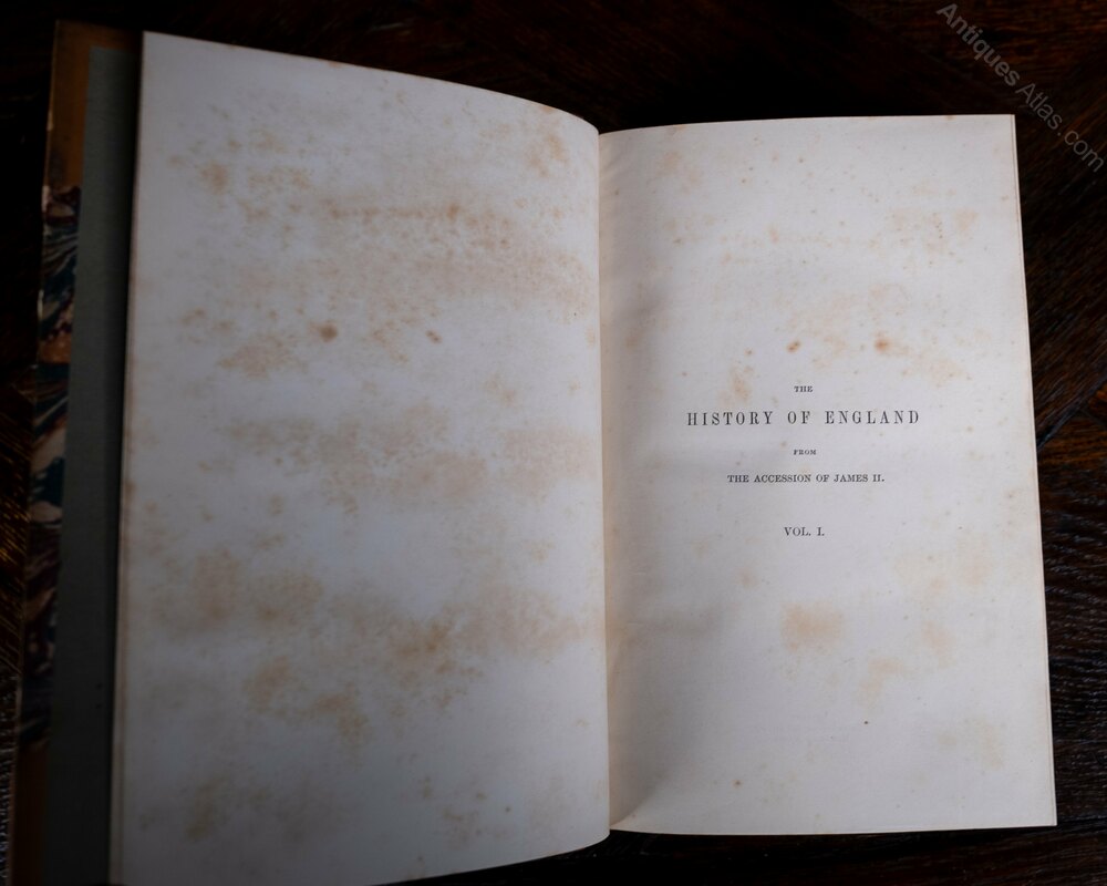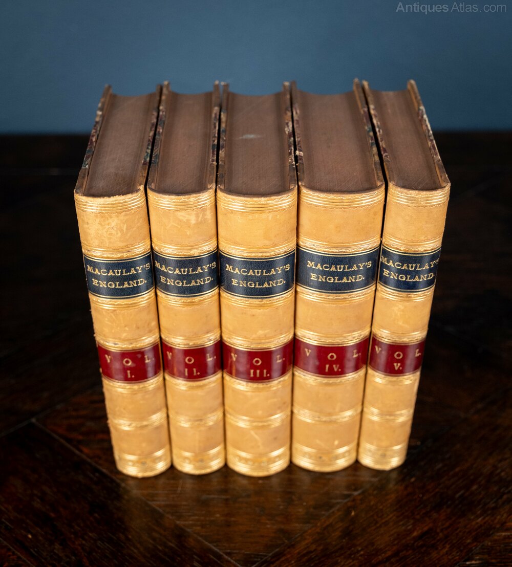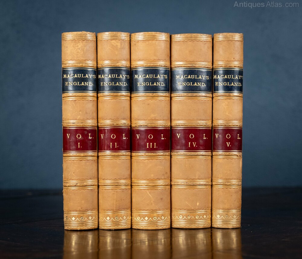 'The History Of England From The Accession of James II' by Thomas Babington Macaulay. Volumes I and II dated 1849, Volumes III and IV dated 1855 and Volume V dated 1861.The work is complete in five volumes, each three quarter bound in calf leather with marbled board, red and black title panels, gilt stamped decoration and five raised bands to the spine. All volumes' exteriors are in a very good condition.