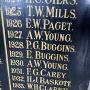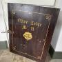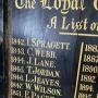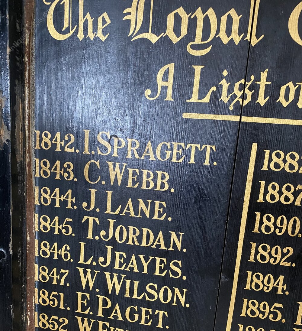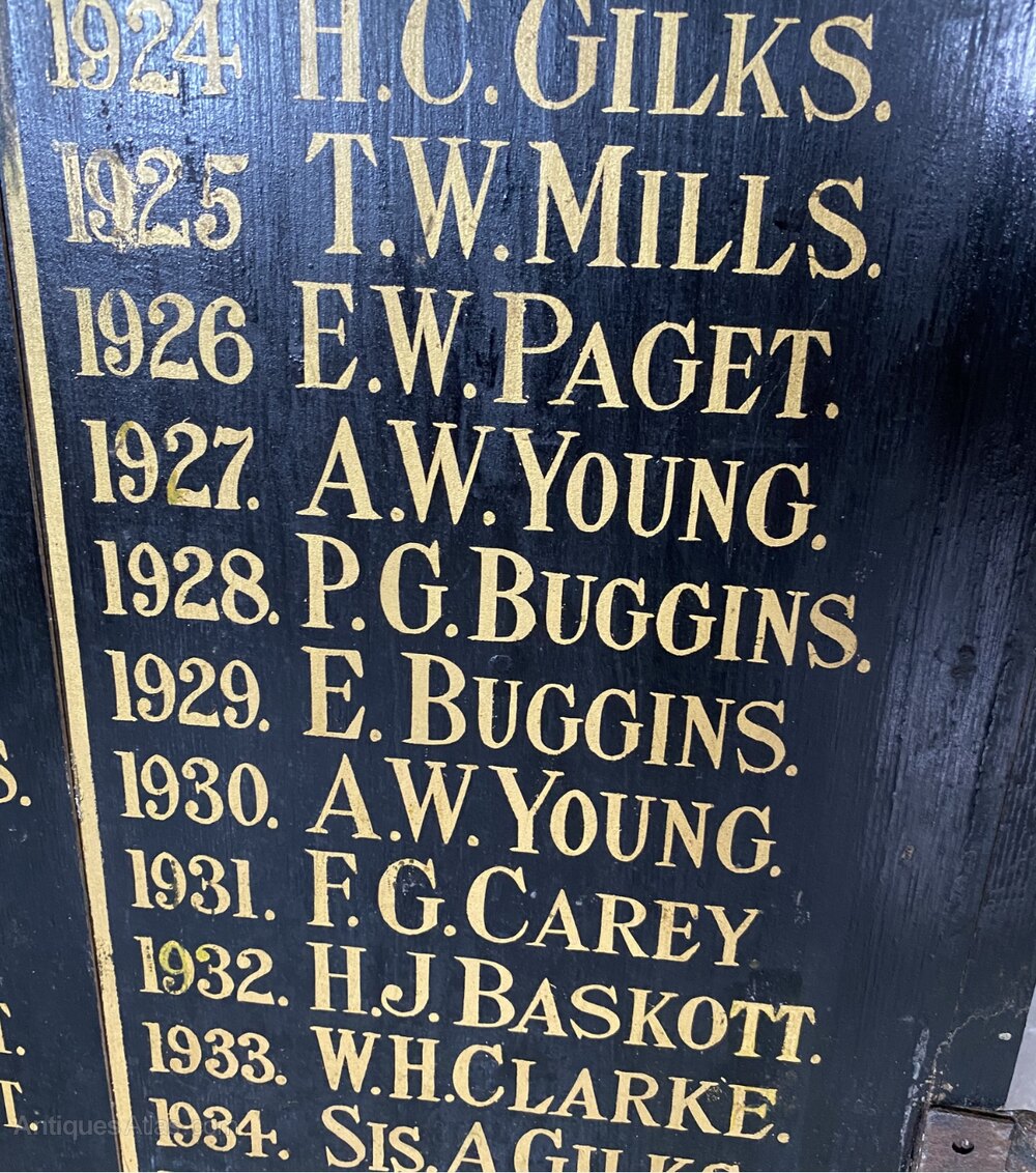 Pine board with a dark mahogany varnish. Gold sign writing dating from 1842 to 1937. Originally this would have been the centre section of three pieces now lost but retains some of ther original hinges and clasp.