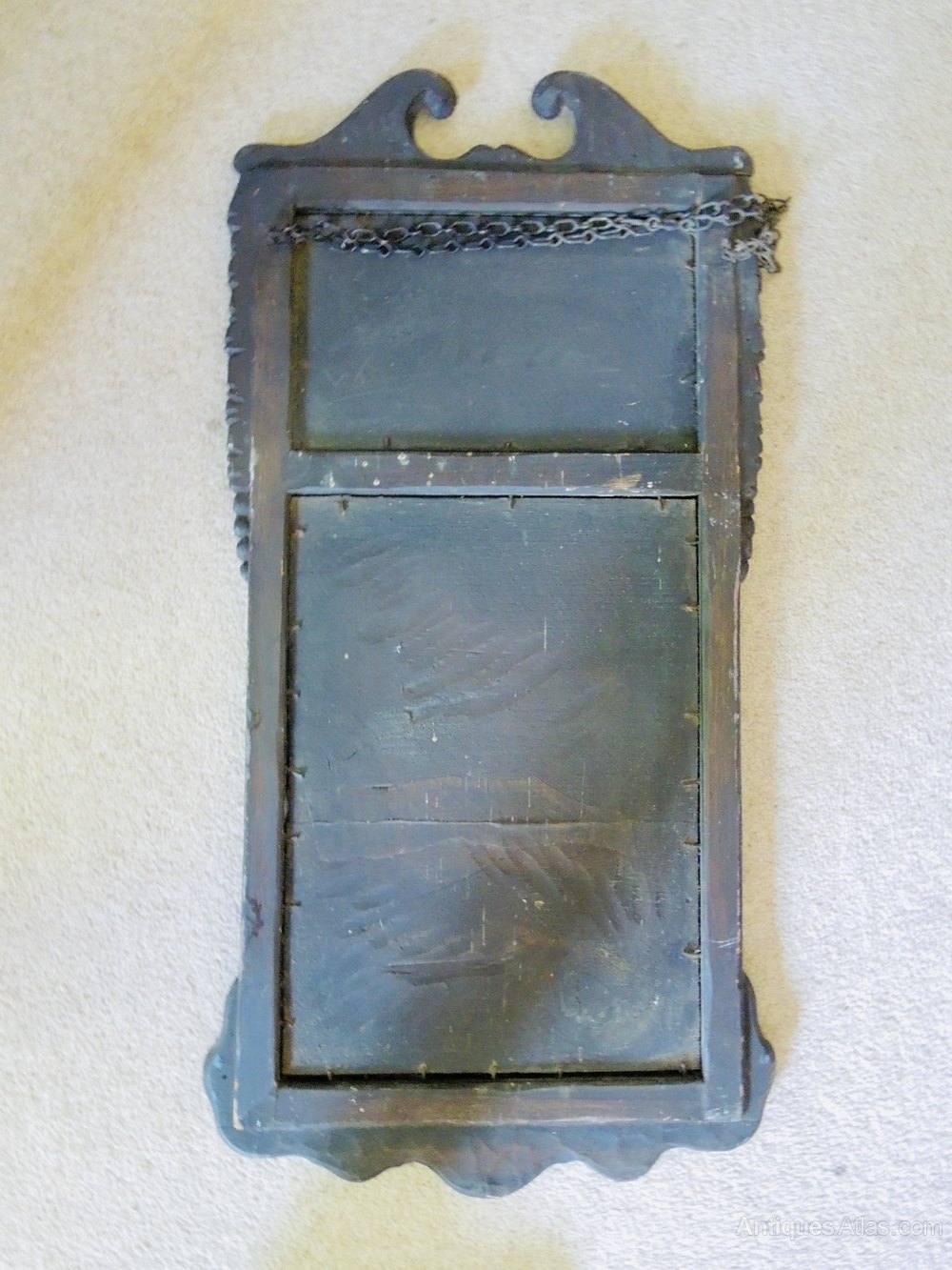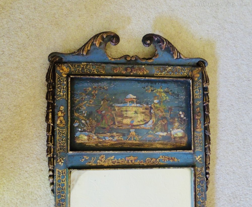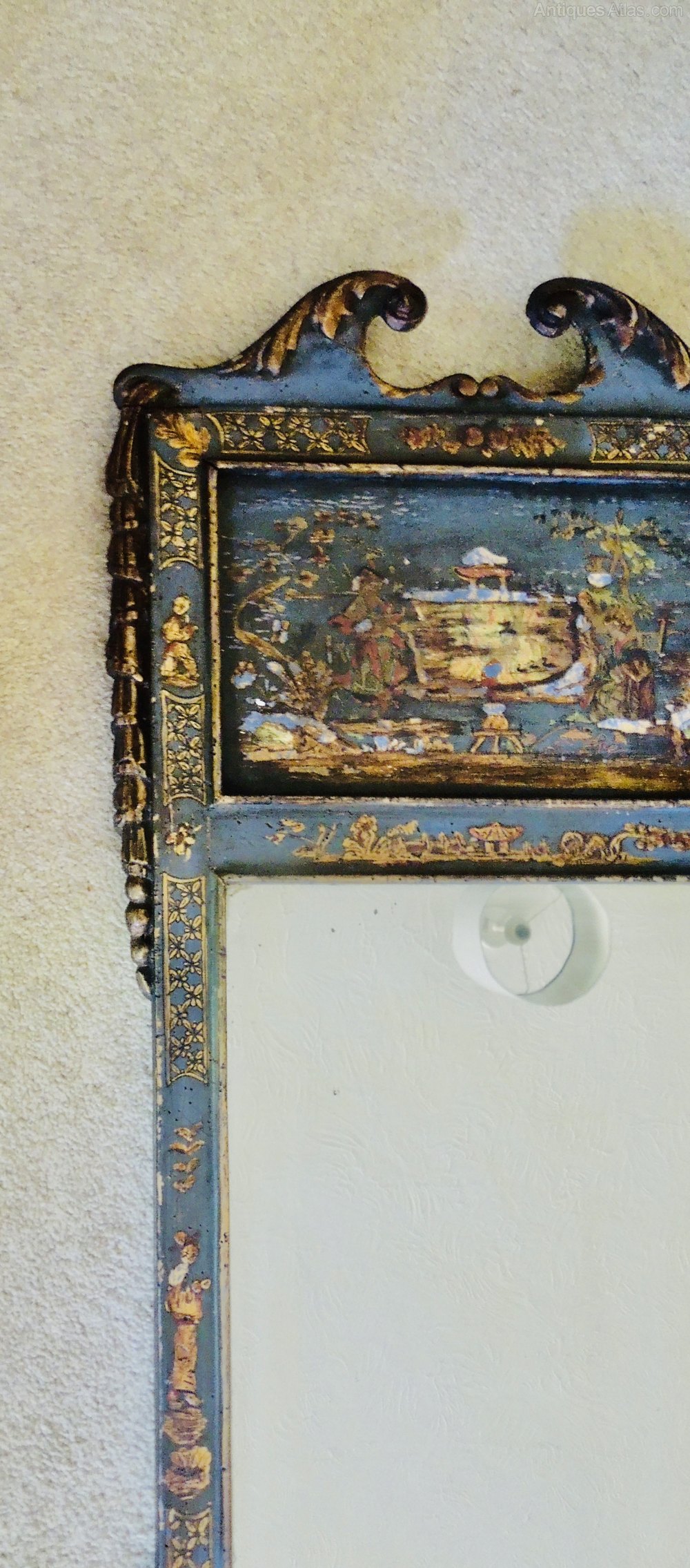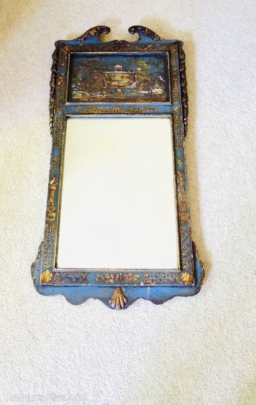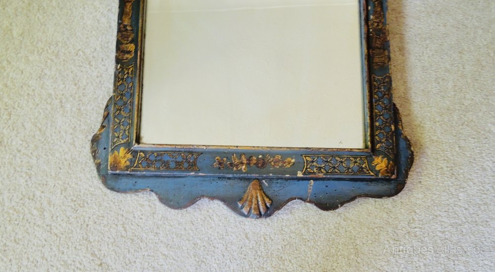Circa 1700 Queen Anne Lacquer Mirror, beautiful duck egg blur and goldAdz work to back boards, carvings all wood , a great example of early