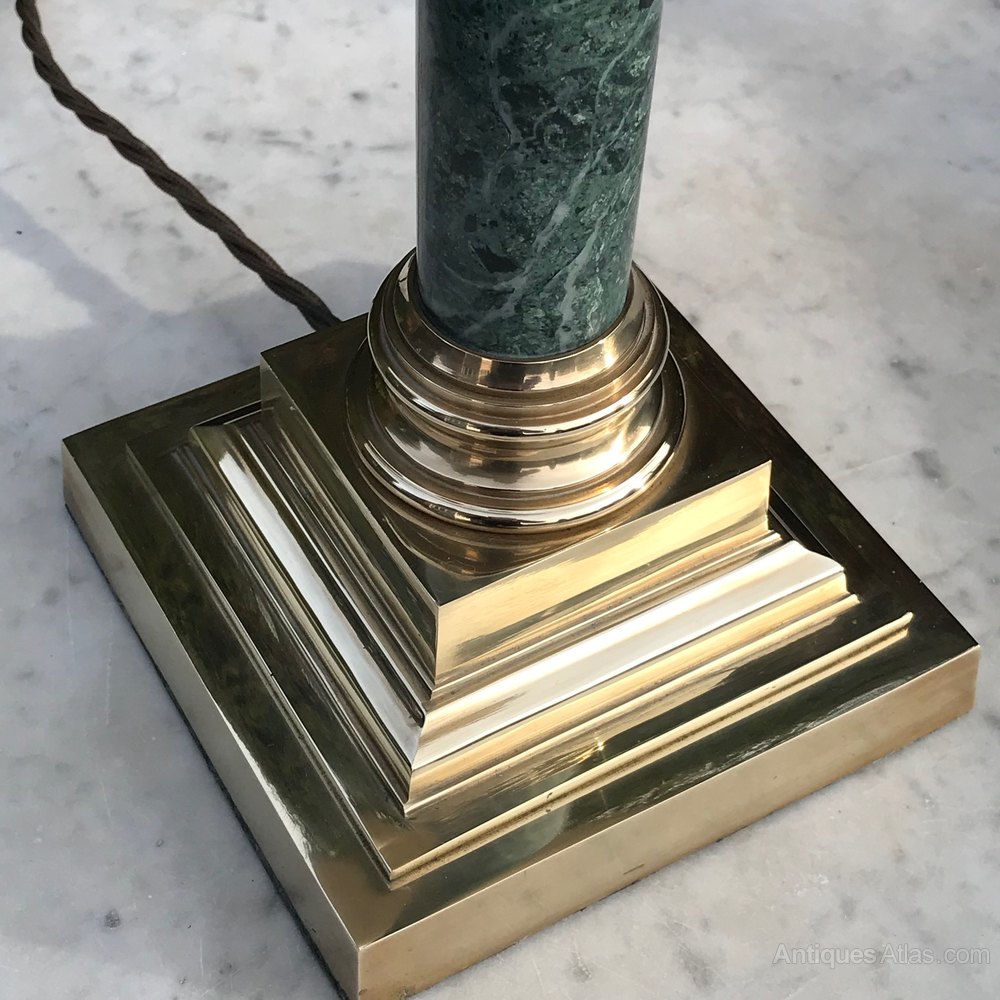 A stunning pair of early 20th Century table lamps on stepped brass bases and beautifully grained green marble columns with brass Corinthian capitals. These decorative lamps are in excellent condition, stand solidly and have been rewired with traditional corded twisted cable. They are wired to the UK mains system and carry a PAT certificate.These elegant lamps are ready to place in any room. Shades not included.