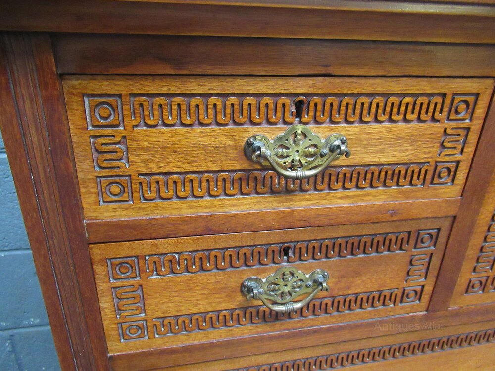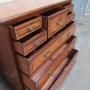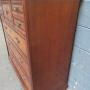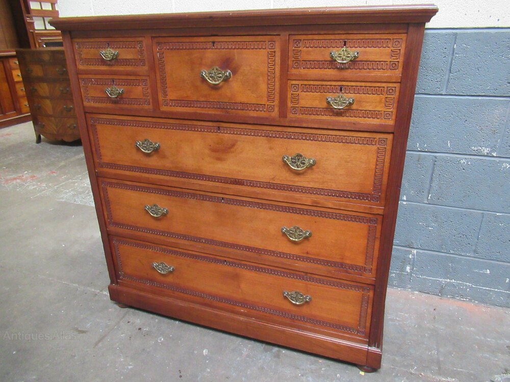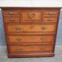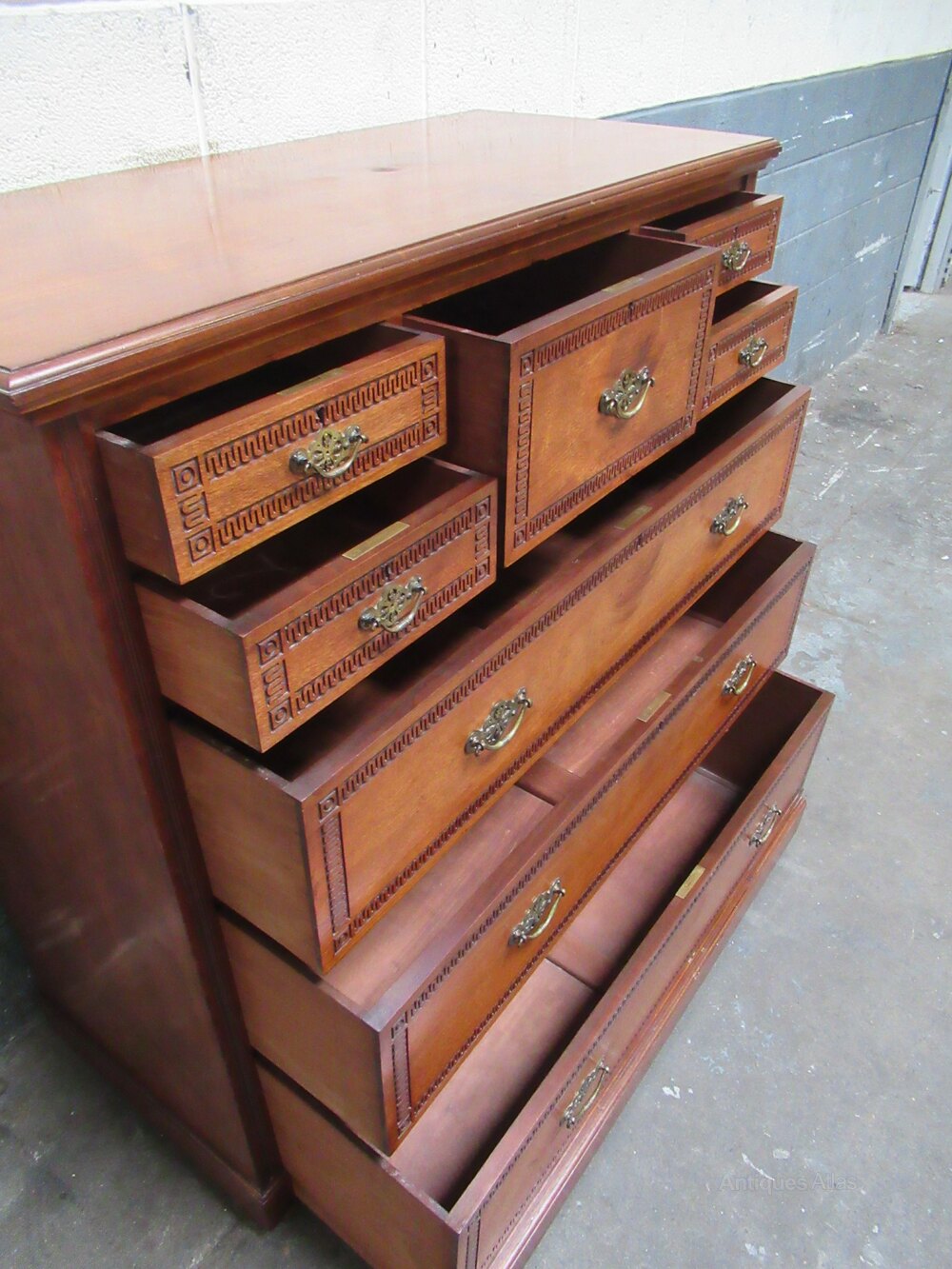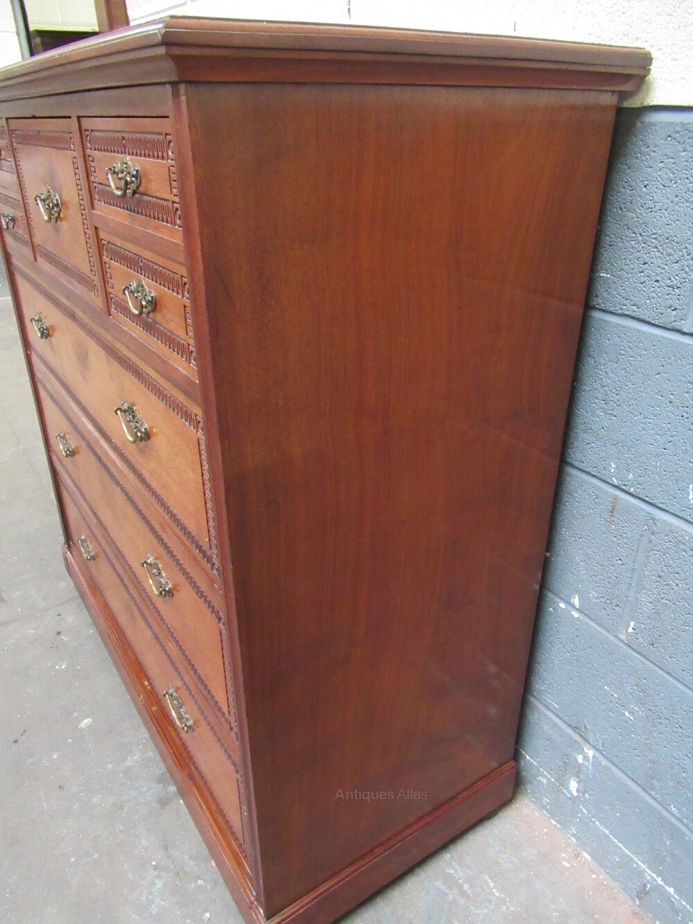 A Victorian mahogany chest of drawers by Jas, Shoolbred, London, dating from the 1880s . The chest has eight drawers, five small top drawers and three long drawers below. All with brass handles , locks and key. all the drawers are lined out in mahogany.DateLate Victorian :